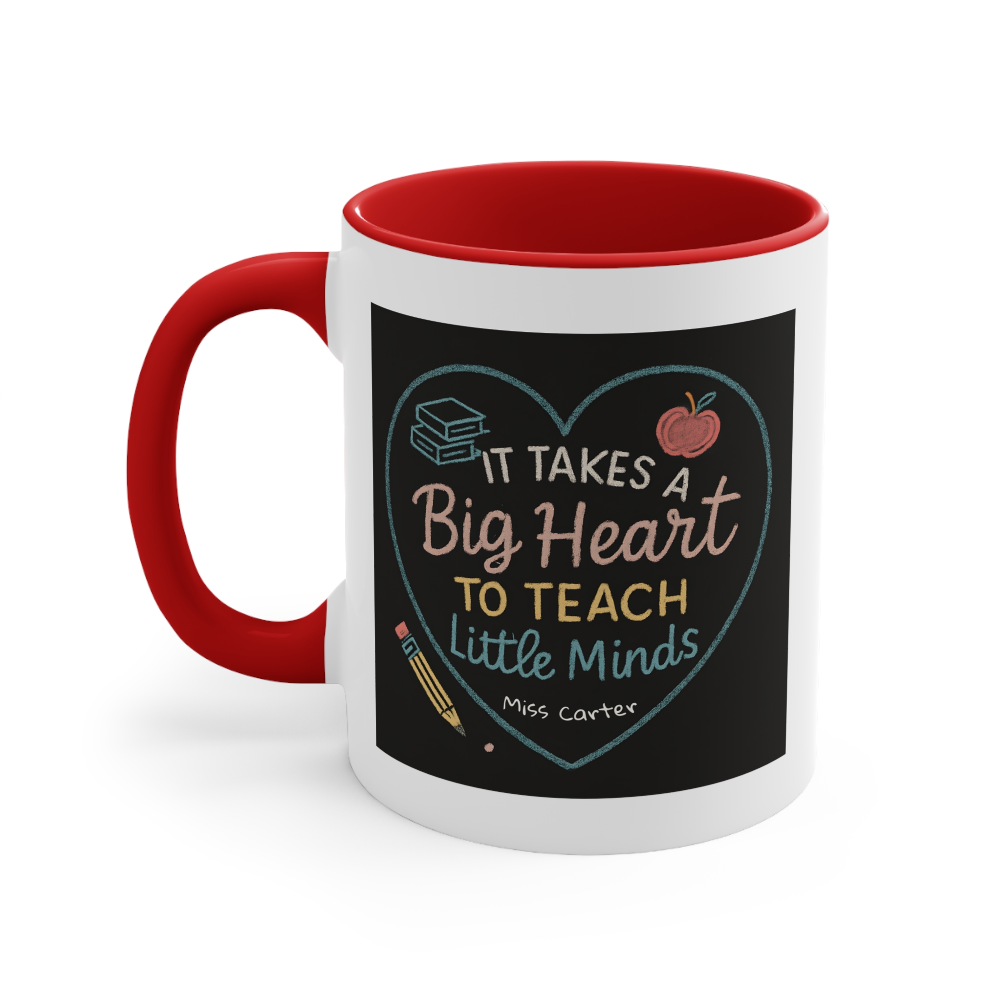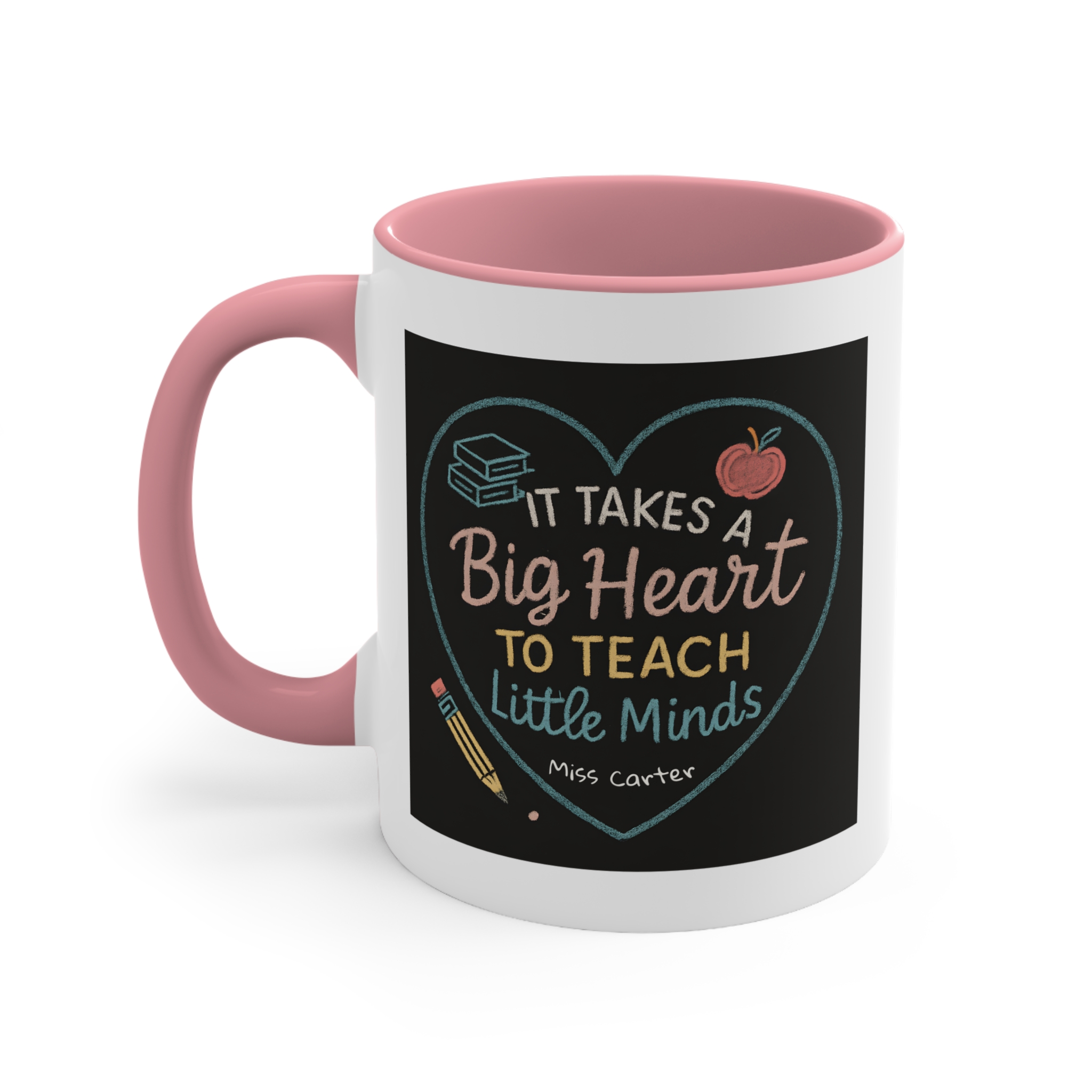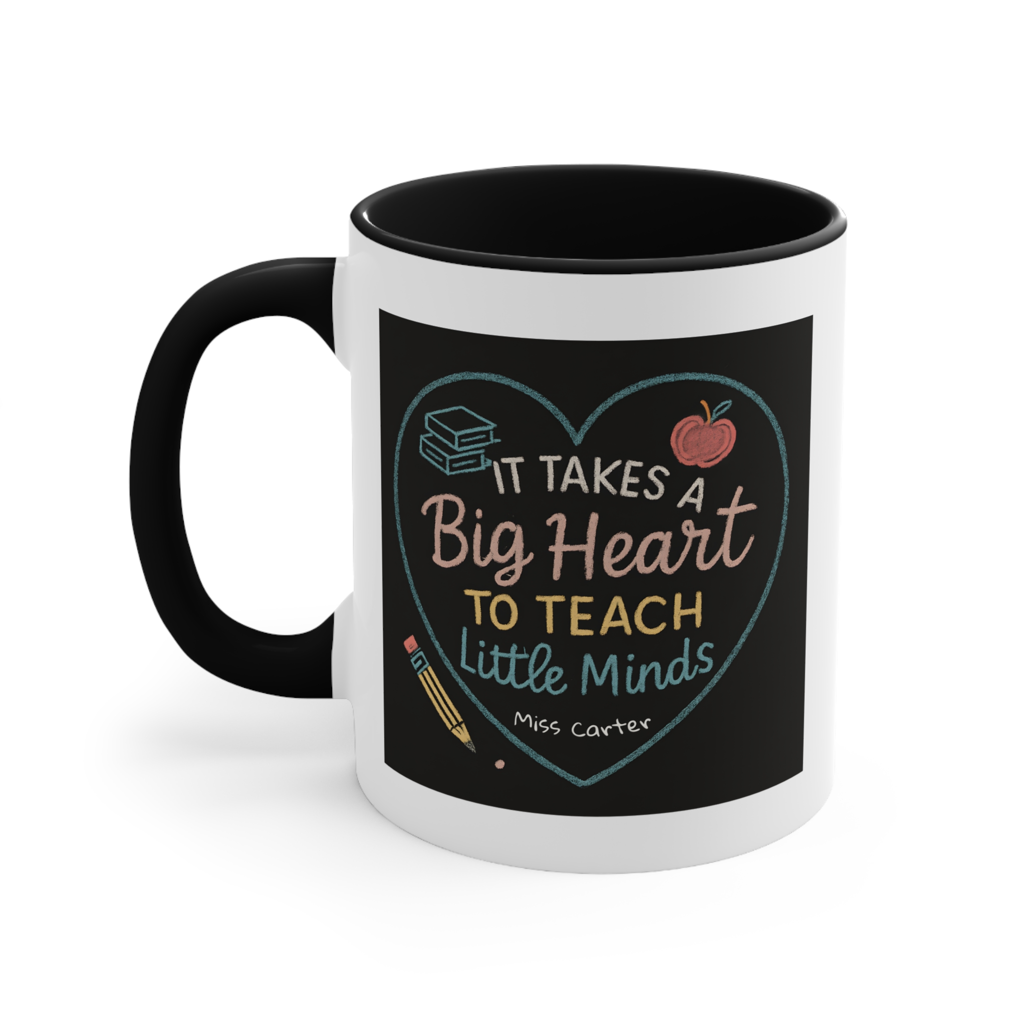 Celebrate the dedication and care of an inspiring educator with this personalised teacher appreciation mug, featuring the heartfelt quote “It Takes a Big Heart to Teach Little Minds.” Designed with a chalkboard-style heart, classroom icons, and a custom teacher name, this mug makes a meaningful and practical thank-you gift.