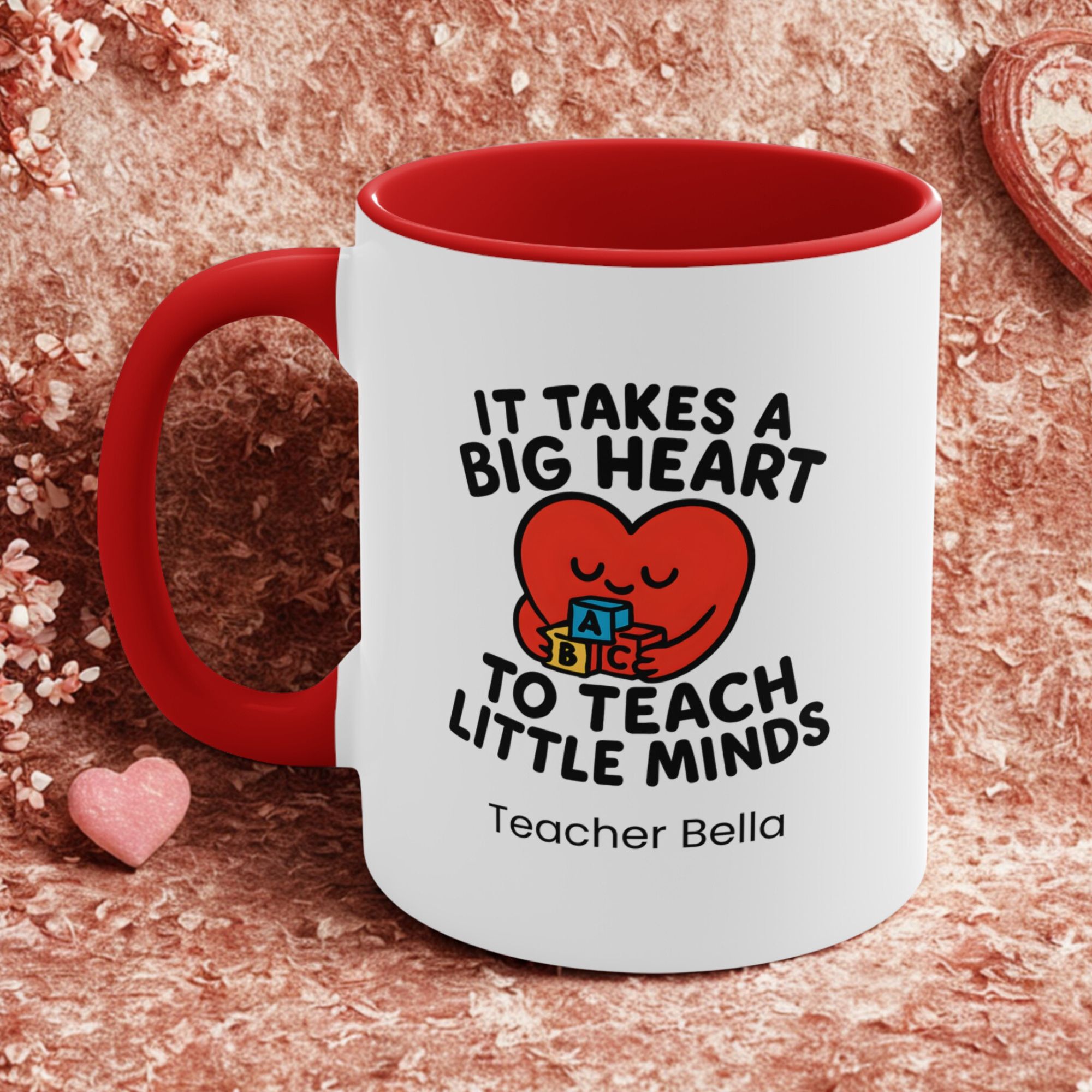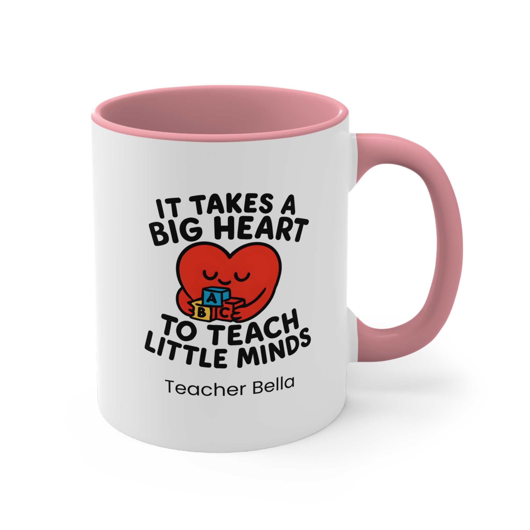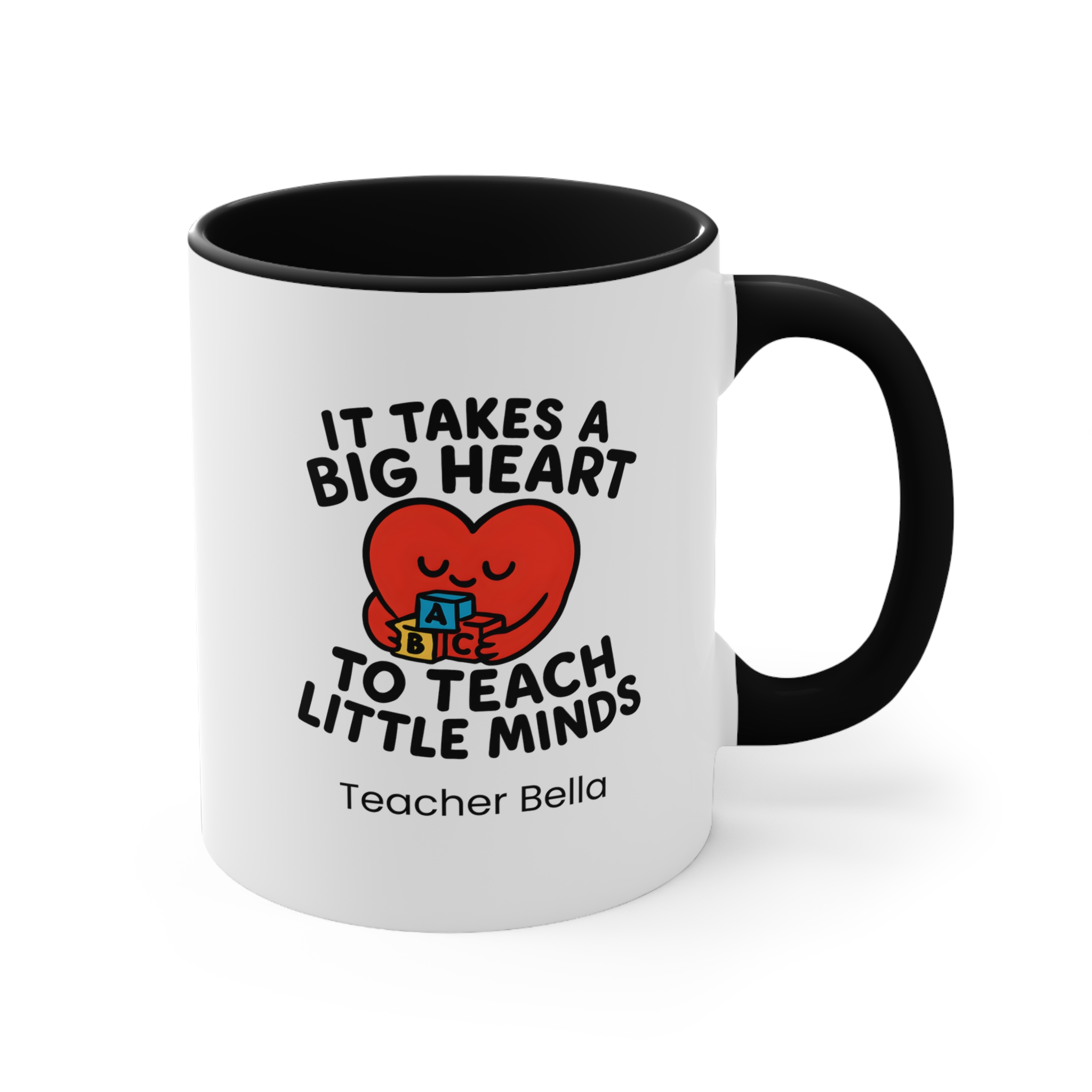 Show your appreciation with this personalised teacher appreciation mug featuring “It Takes a Big Heart to Teach Little Minds”. Add a custom teacher name to make it extra special. This 11oz ceramic mug is microwave safe and perfect for everyday use.