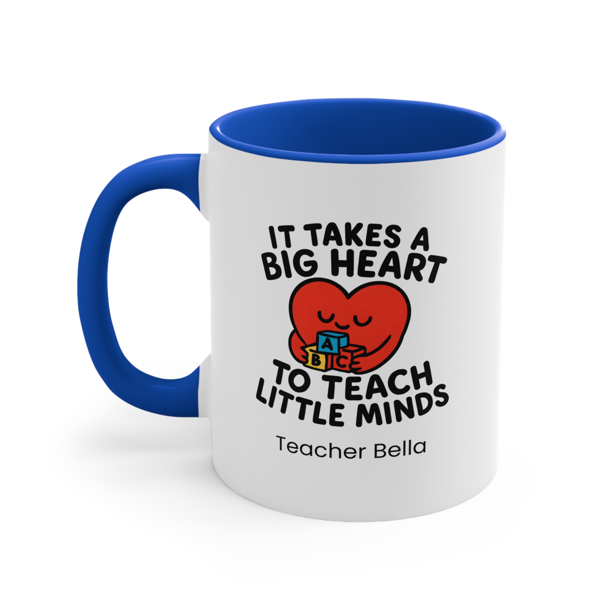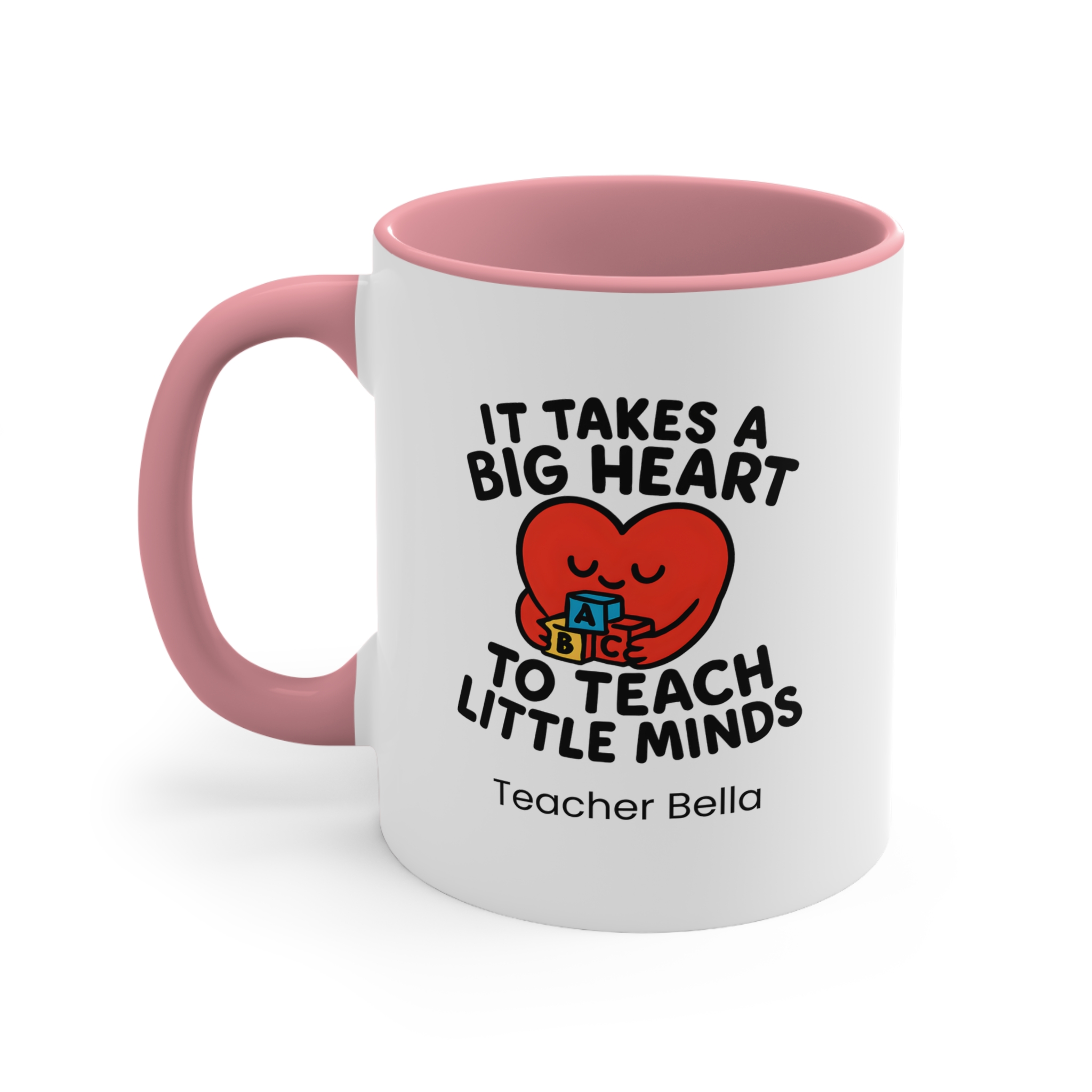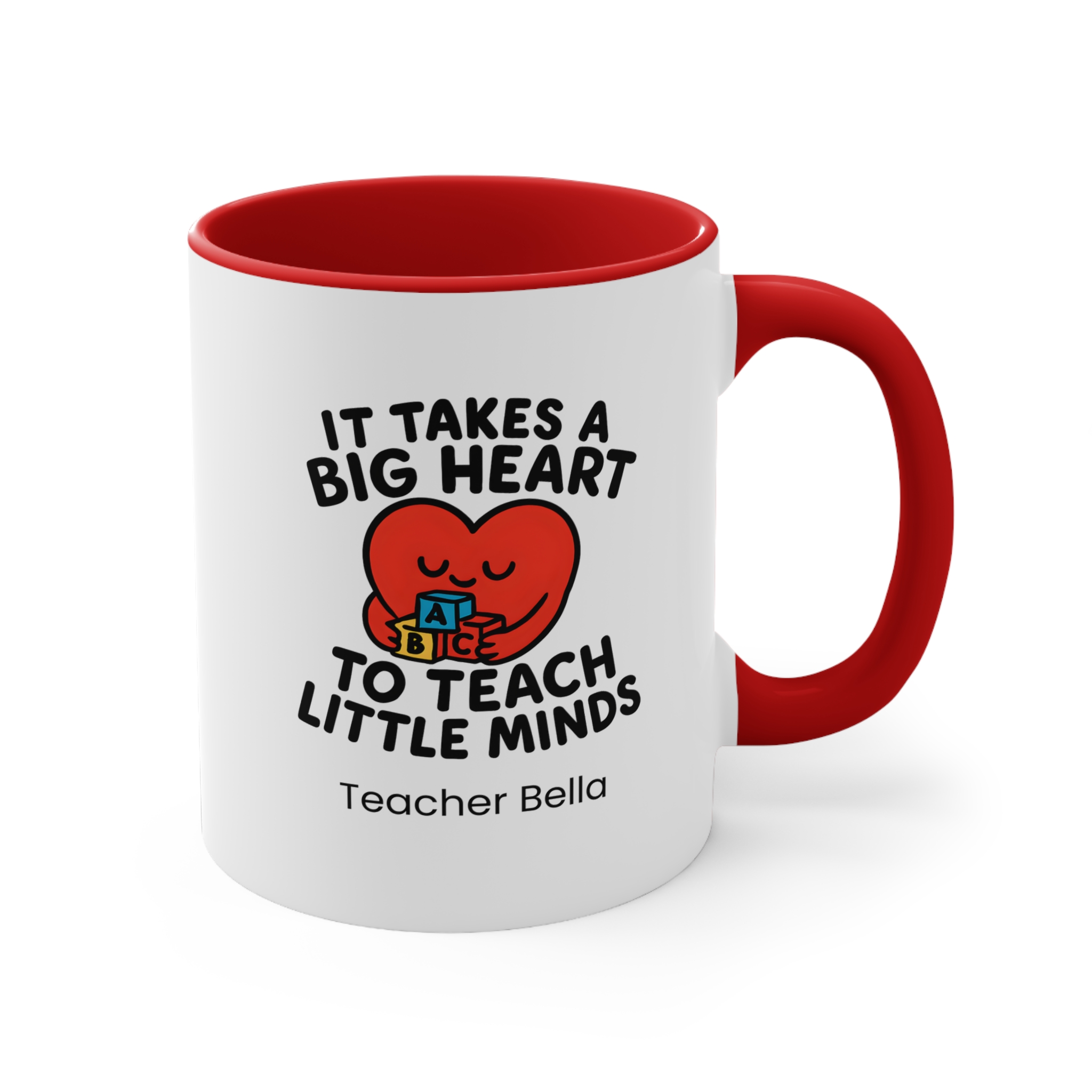 Show your appreciation with this personalised teacher appreciation mug featuring “It Takes a Big Heart to Teach Little Minds”. Add a custom teacher name to make it extra special. This 11oz ceramic mug is microwave safe and perfect for everyday use.