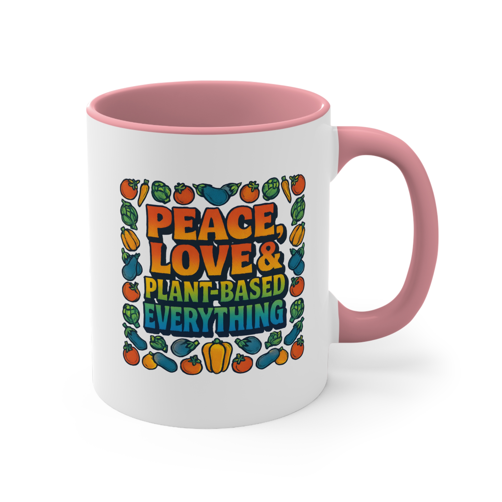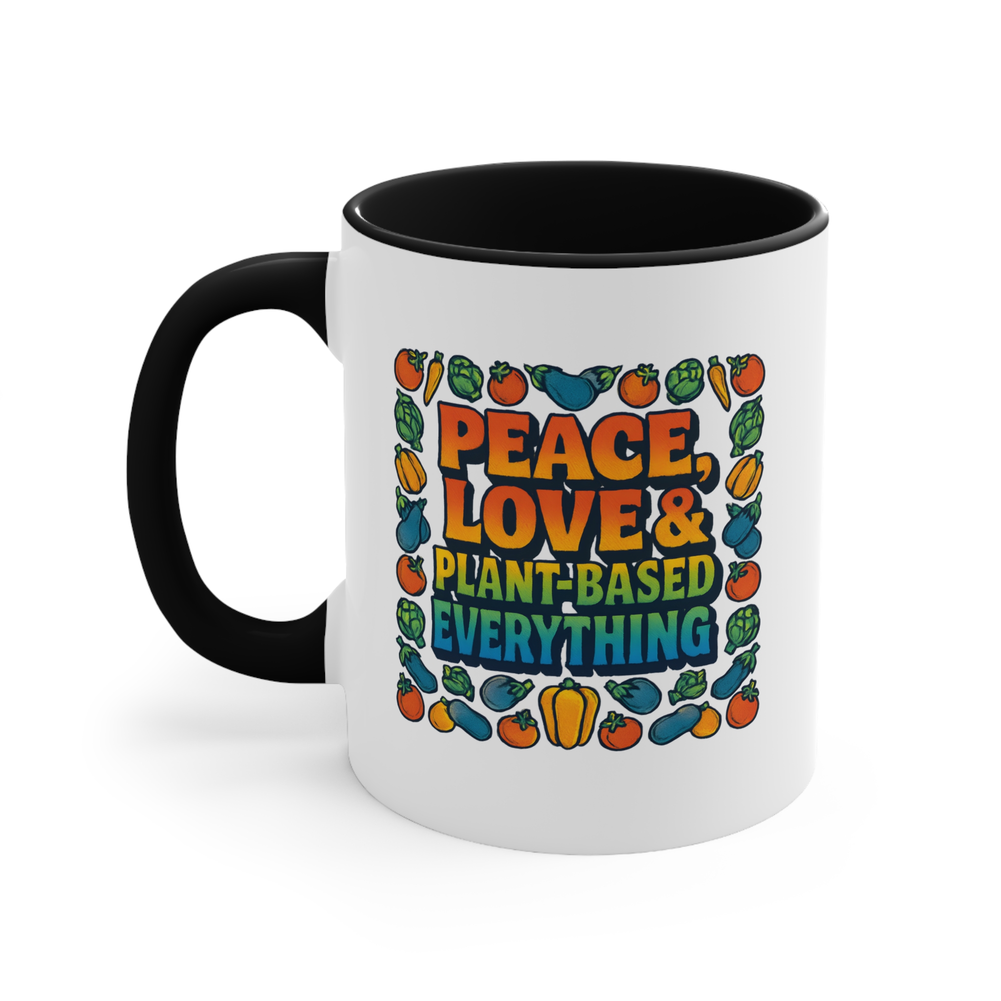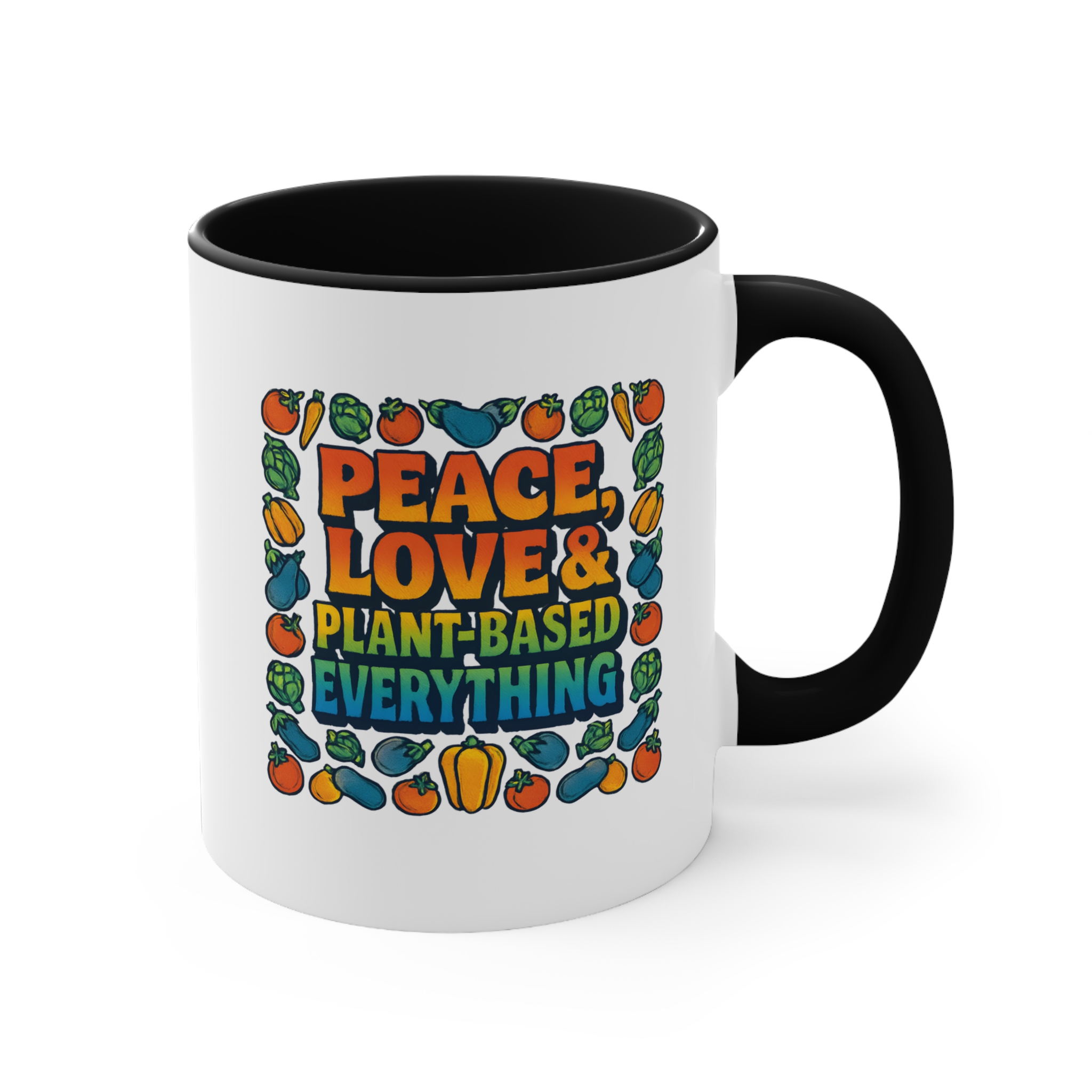 Brighten your day with this bold “Peace, Love & Plant-Based Everything” mug — the most colourful way to celebrate your plant-based lifestyle.
