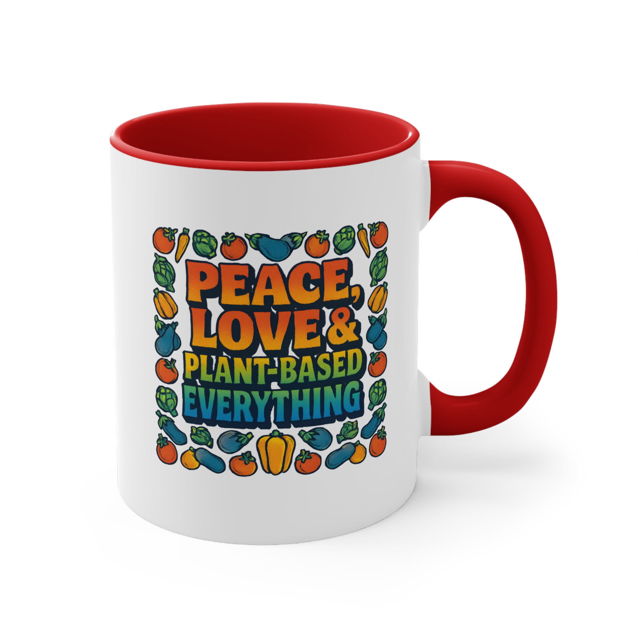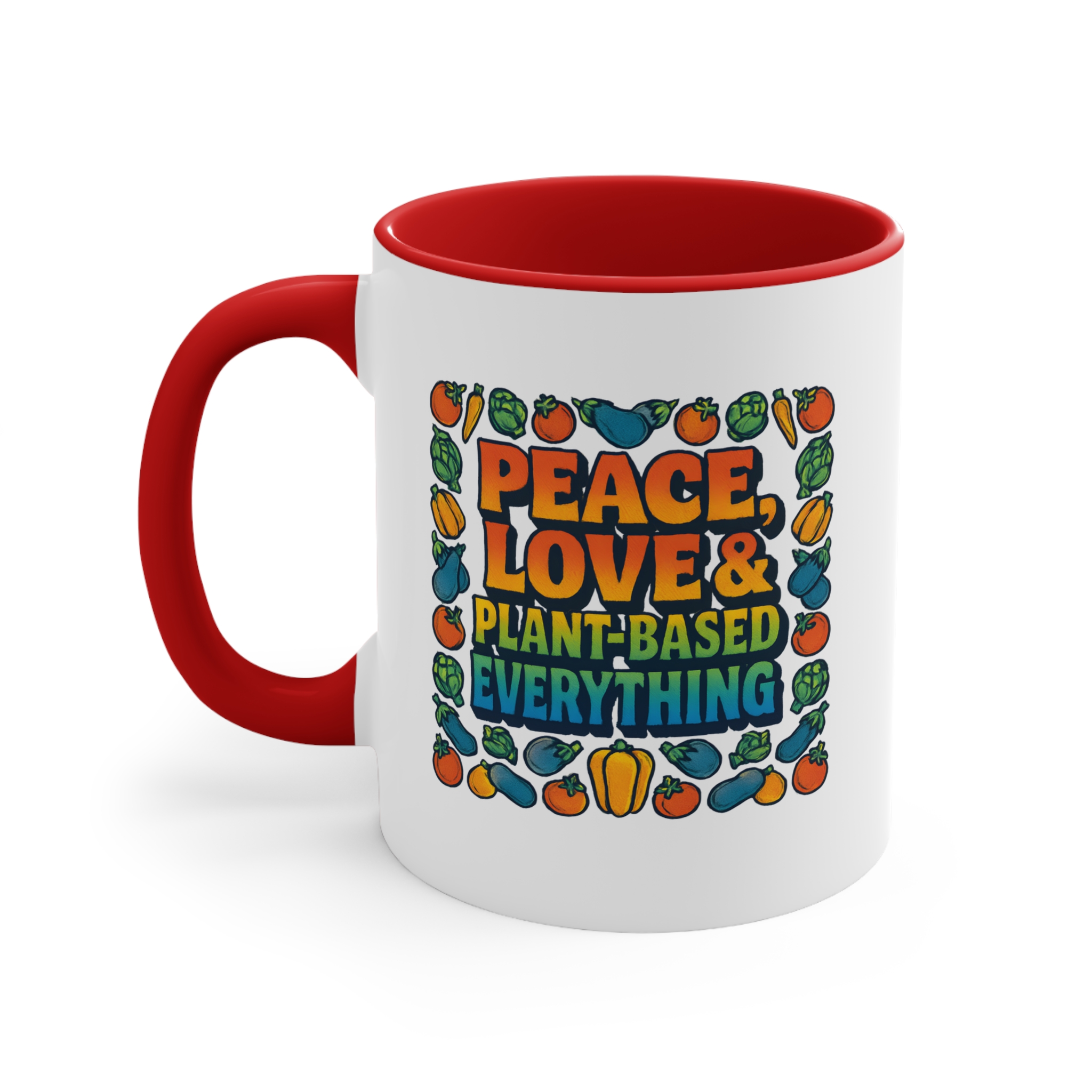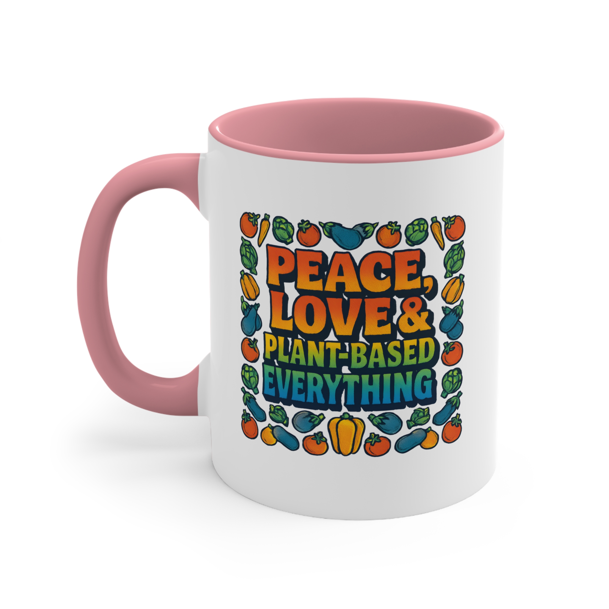 Brighten your day with this bold “Peace, Love & Plant-Based Everything” mug — the most colourful way to celebrate your plant-based lifestyle.
