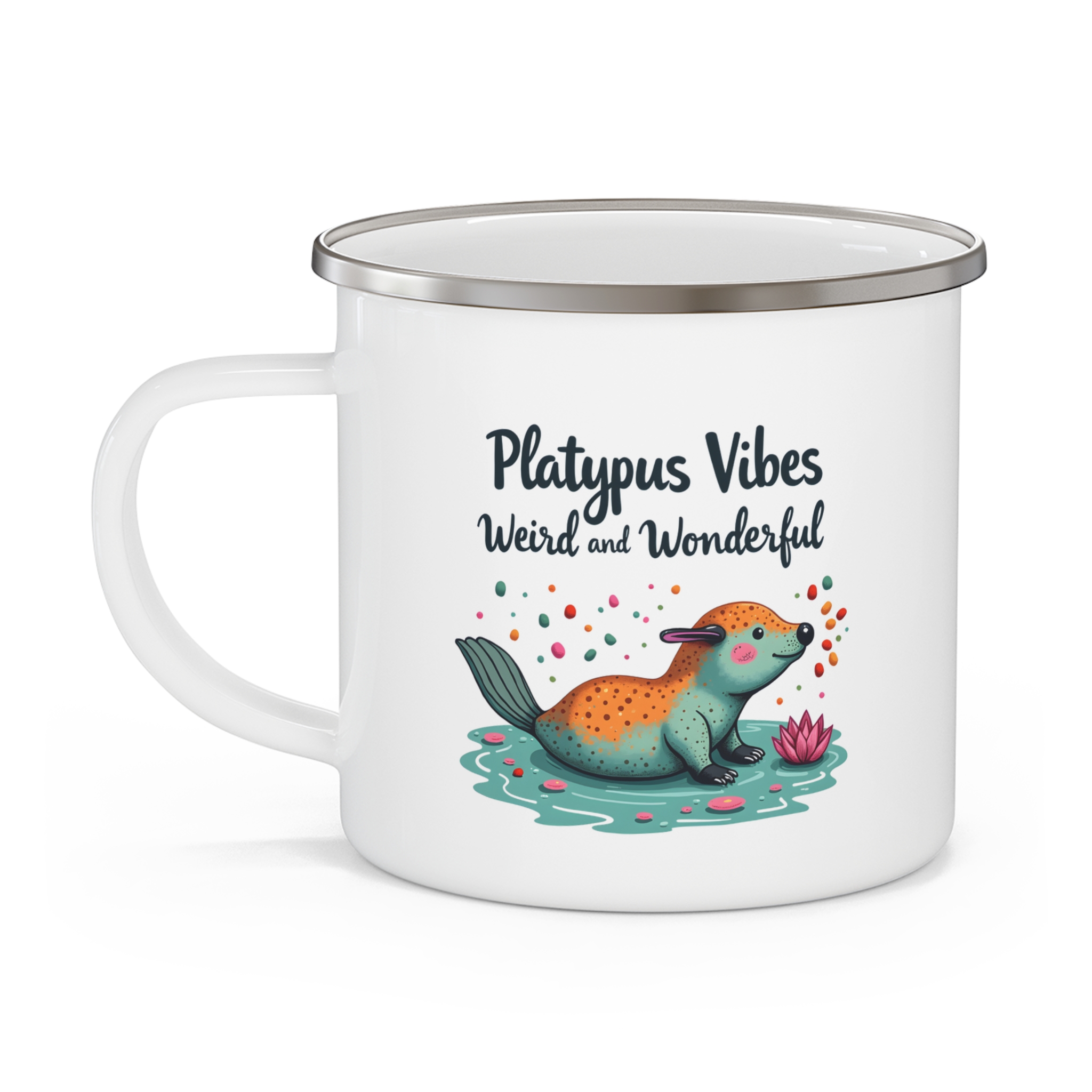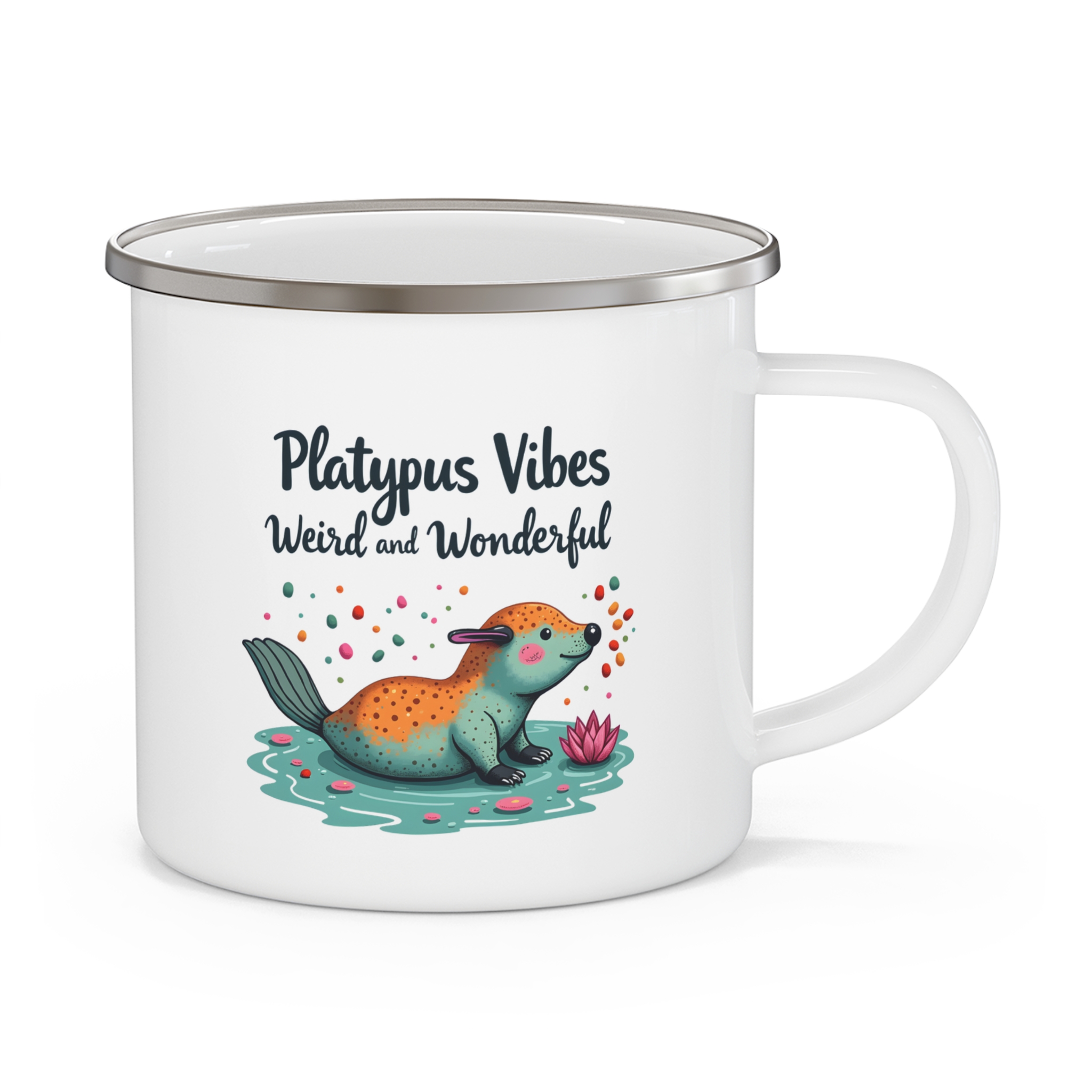 Platypus enamel mug featuring a cute illustrated platypus with the playful quote “Platypus Vibes – Weird and Wonderful”. A fun and uniquely Australian design made for animal lovers, campers, and anyone who appreciates quirky Aussie wildlife.