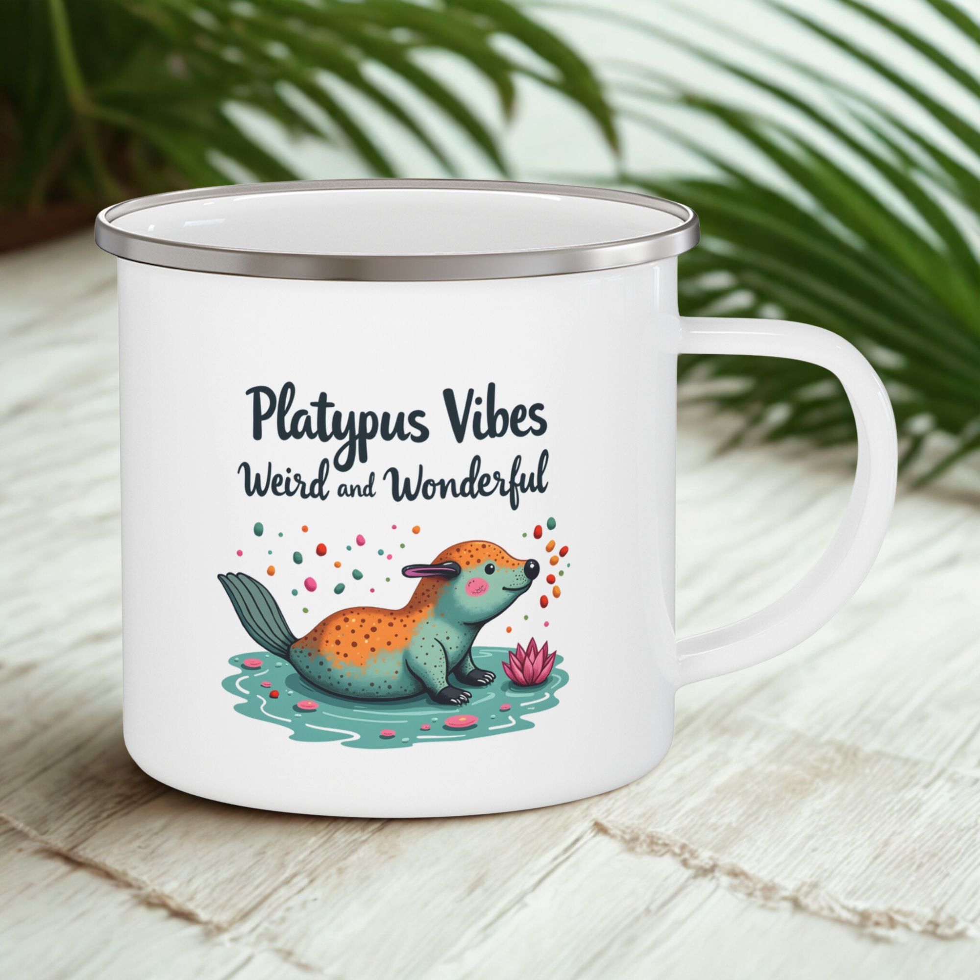 Cute platypus enamel mug with a quirky Australian animal design. 12oz camping mug perfect for coffee, gifts, and outdoor adventures.