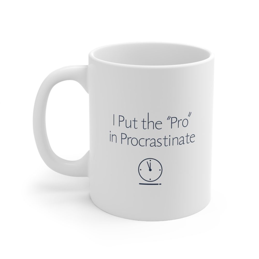 Show off your expert delaying skills with this procrastination mug. Featuring the clever phrase “I Put the ‘Pro’ in Procrastinate” in minimalist typography, this 11oz ceramic cup is microwave- and dishwasher-safe — ideal for work breaks or lazy mornings.