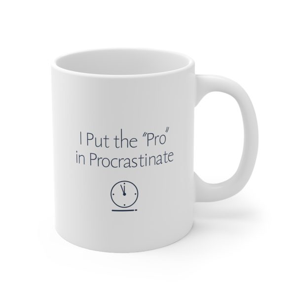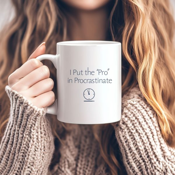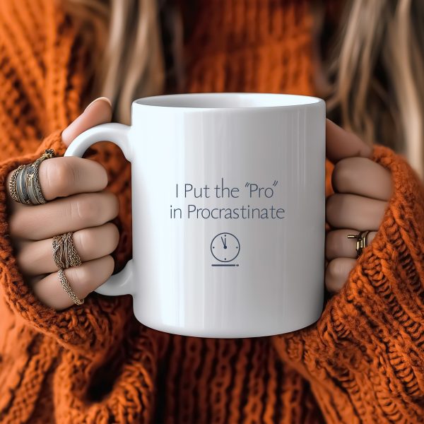 Show off your expert delaying skills with this procrastination mug. Featuring the clever phrase “I Put the ‘Pro’ in Procrastinate” in minimalist typography, this 11oz ceramic cup is microwave- and dishwasher-safe — ideal for work breaks or lazy mornings.