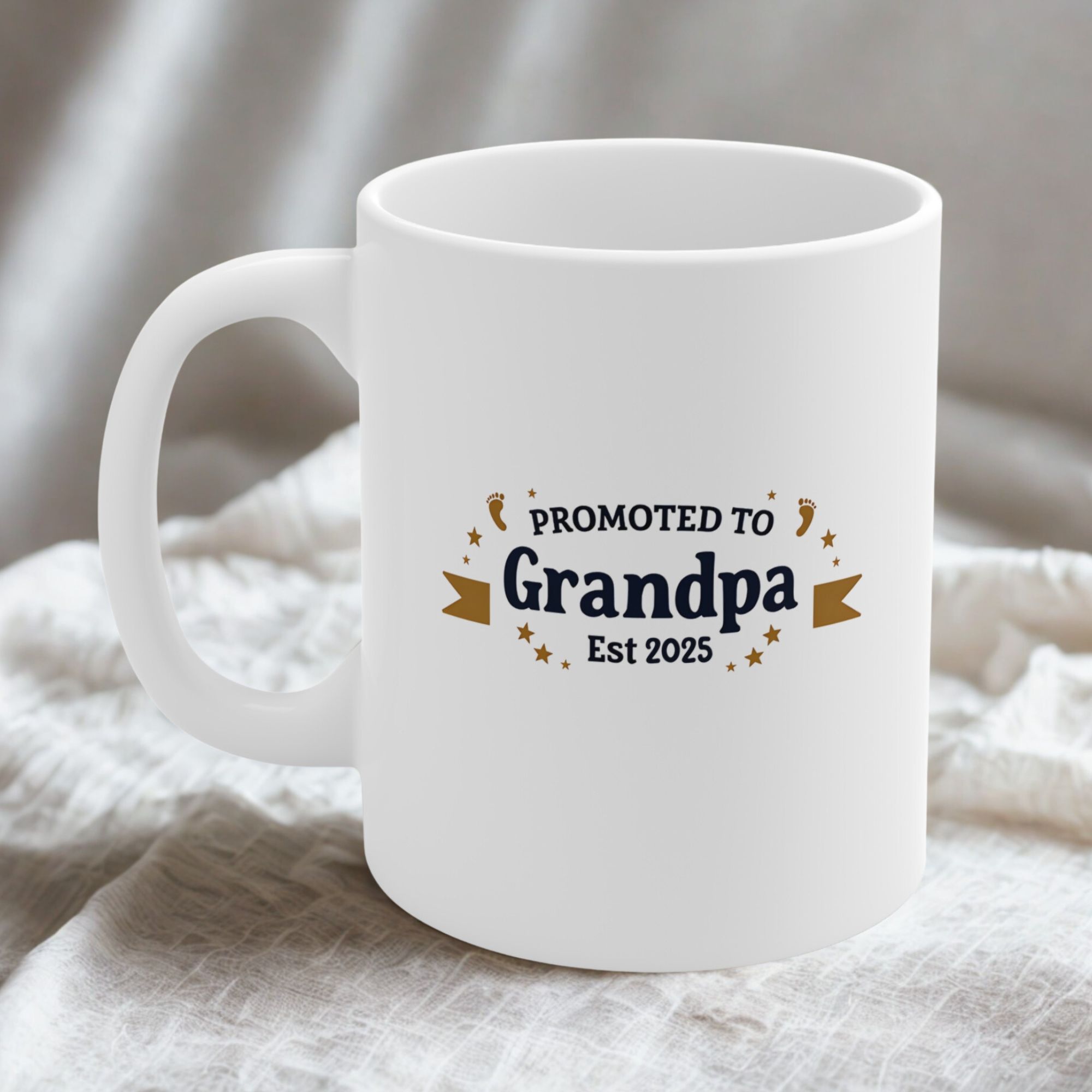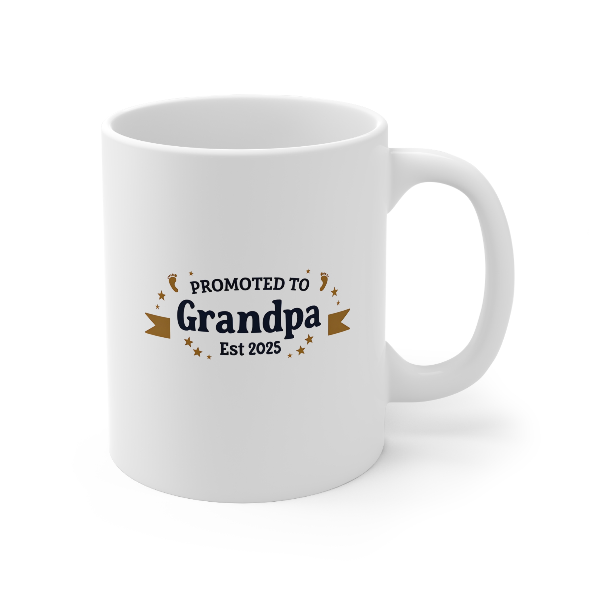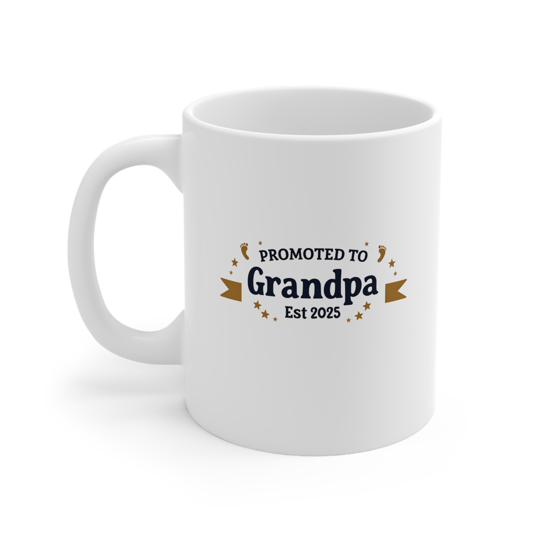 Celebrate the proud moment of becoming a grandpa with our “Promoted to Grandpa – Est. [Your Year]” Mug. This customizable design features vintage-style text in bold serif font, arched elegantly across the top with your chosen year below. Classic ribbon banners in warm gold frame the text, while baby footprints and stars add a heartwarming touch. Whether it’s a pregnancy reveal or a thoughtful keepsake, this mug makes the perfect gift for the newest granddad in the family.