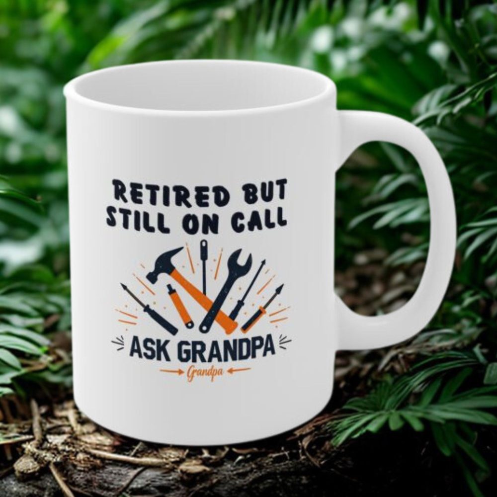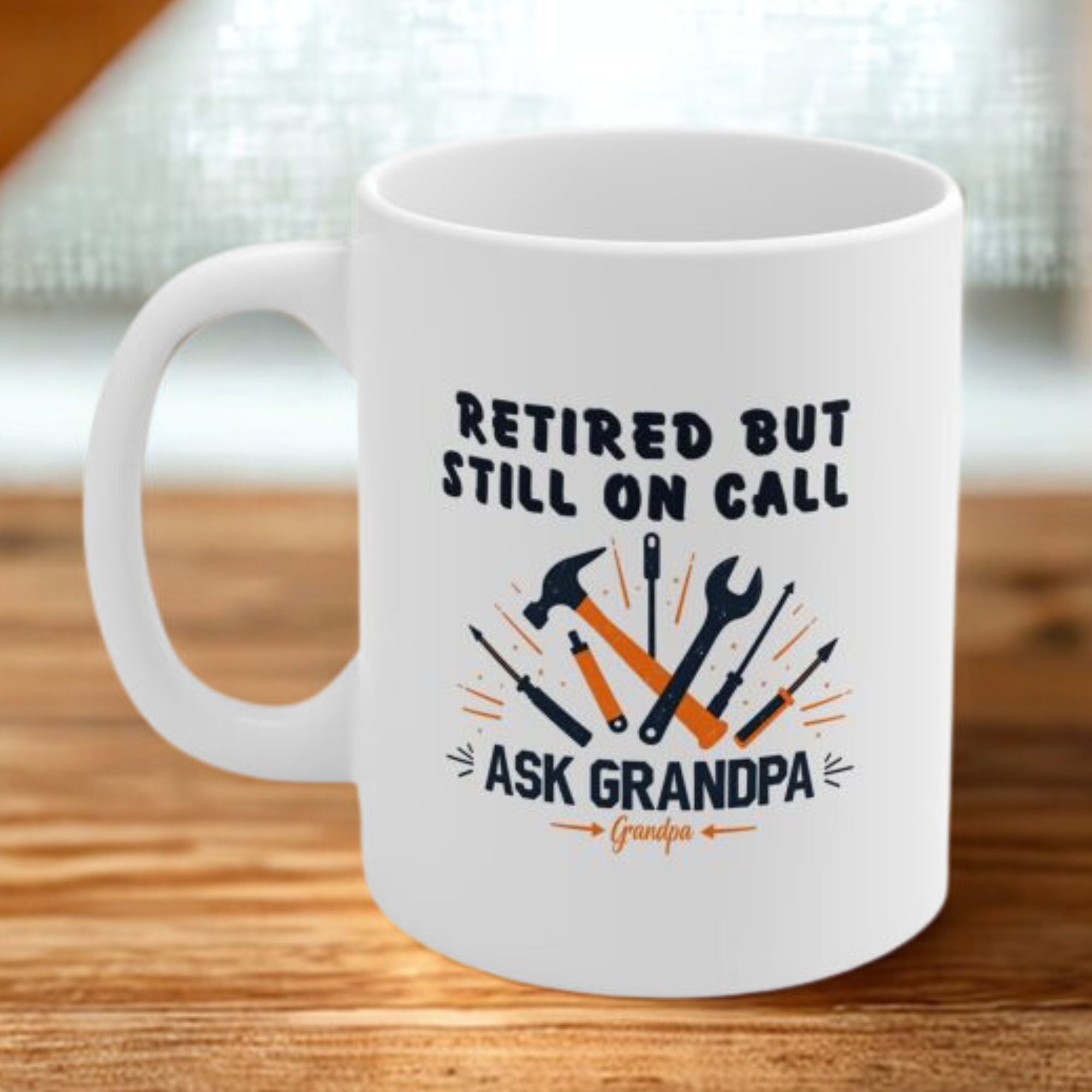 Celebrate the ultimate handyman with this retired grandpa mug featuring the quote “Retired but Still on Call – Ask Grandpa.” A bold and funny 11oz ceramic gift.