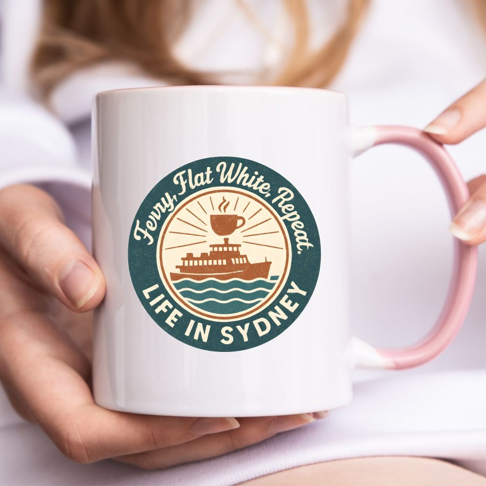 Capture the charm of Sydney mornings with this retro-style coffee mug. Featuring a vintage badge illustration of a ferry and steaming flat white, the design reads “Ferry, Flat White, Repeat – Life in Sydney.” The muted coastal tones and classic typography give it a timeless appeal, making it ideal for nostalgic Aussies or visitors wanting a meaningful souvenir. Crafted from ceramic with a glossy finish and two-tone pink accent handle and interior, this mug is a coastal vibe you can sip from.