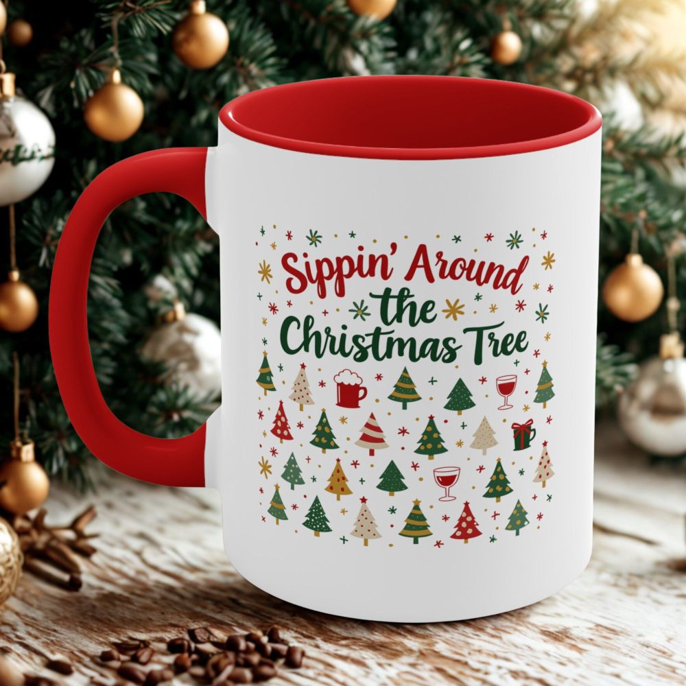 Sippin’ Around the Christmas Tree mug with festive drink icons and tree patterns. A fun holiday gift for party hosts, wine fans, and cocoa lovers.