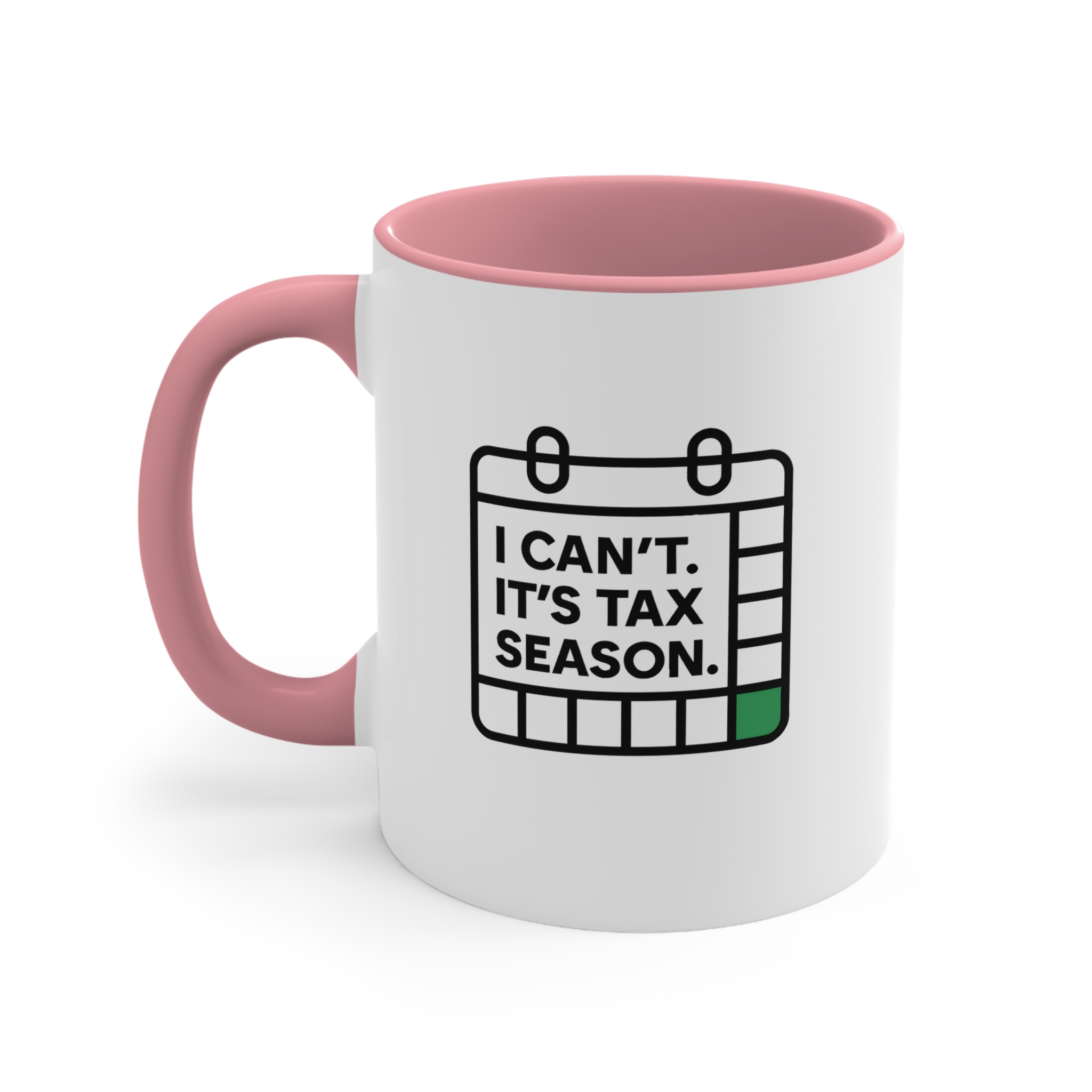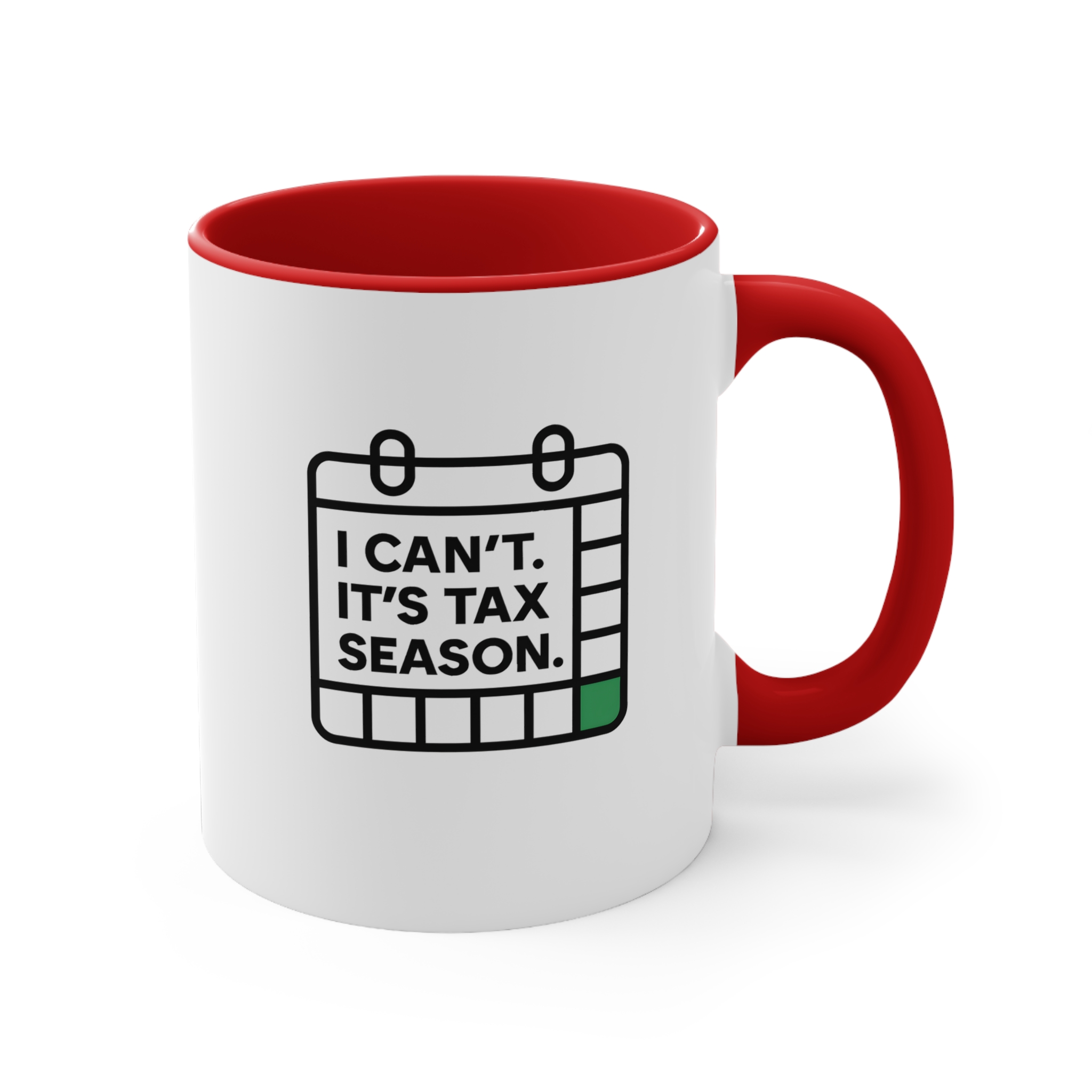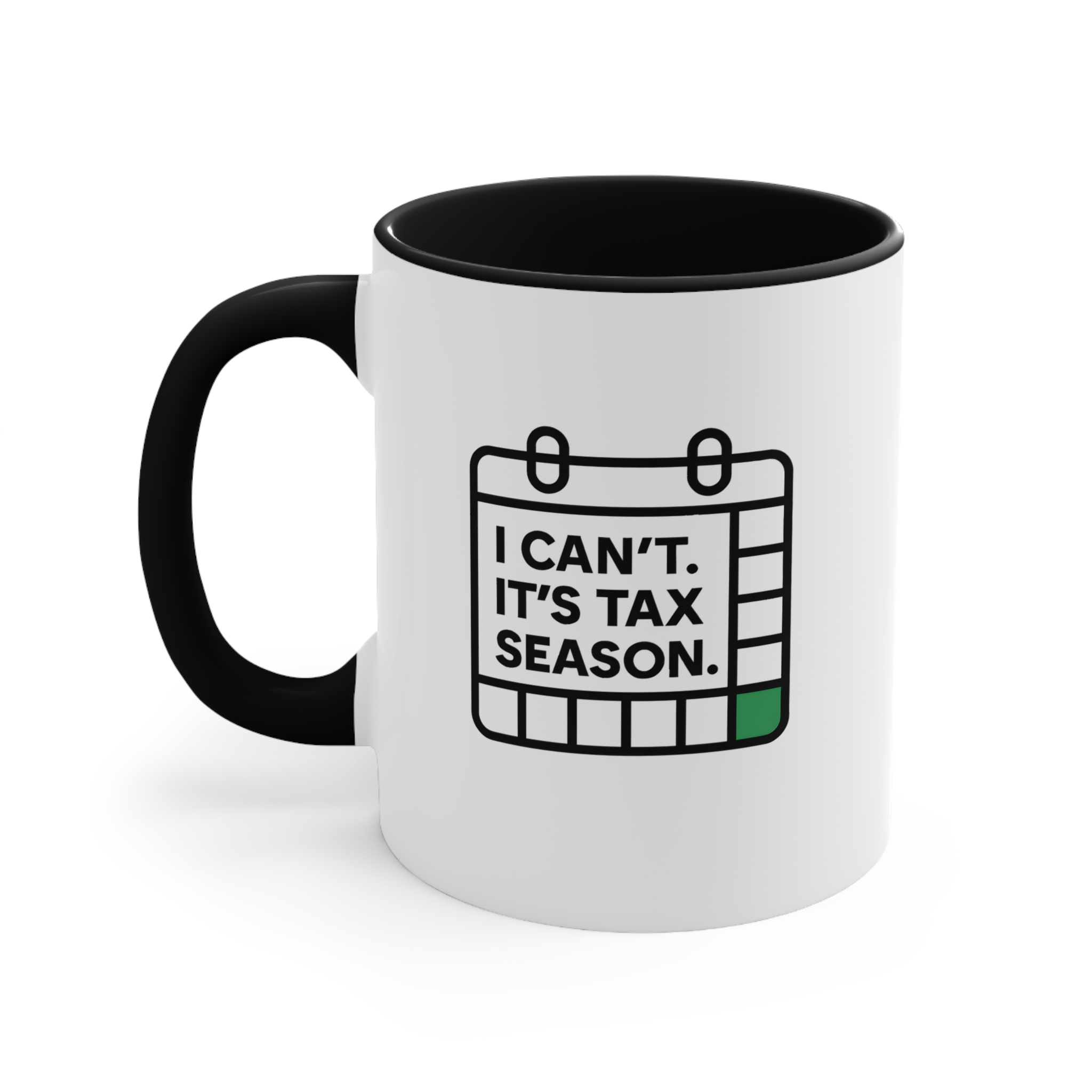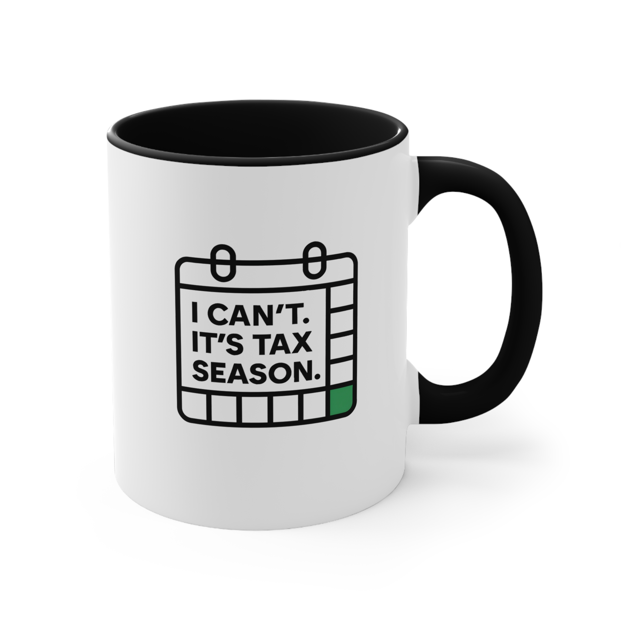 Deadlines approaching? Caffeine levels rising? This “I Can’t. It’s Tax Season.” mug gets it. Featuring a minimalist calendar icon with a bold green square marking crunch time, this design speaks for accountants, bookkeepers, and tax pros who don’t have time for anything else — except coffee.