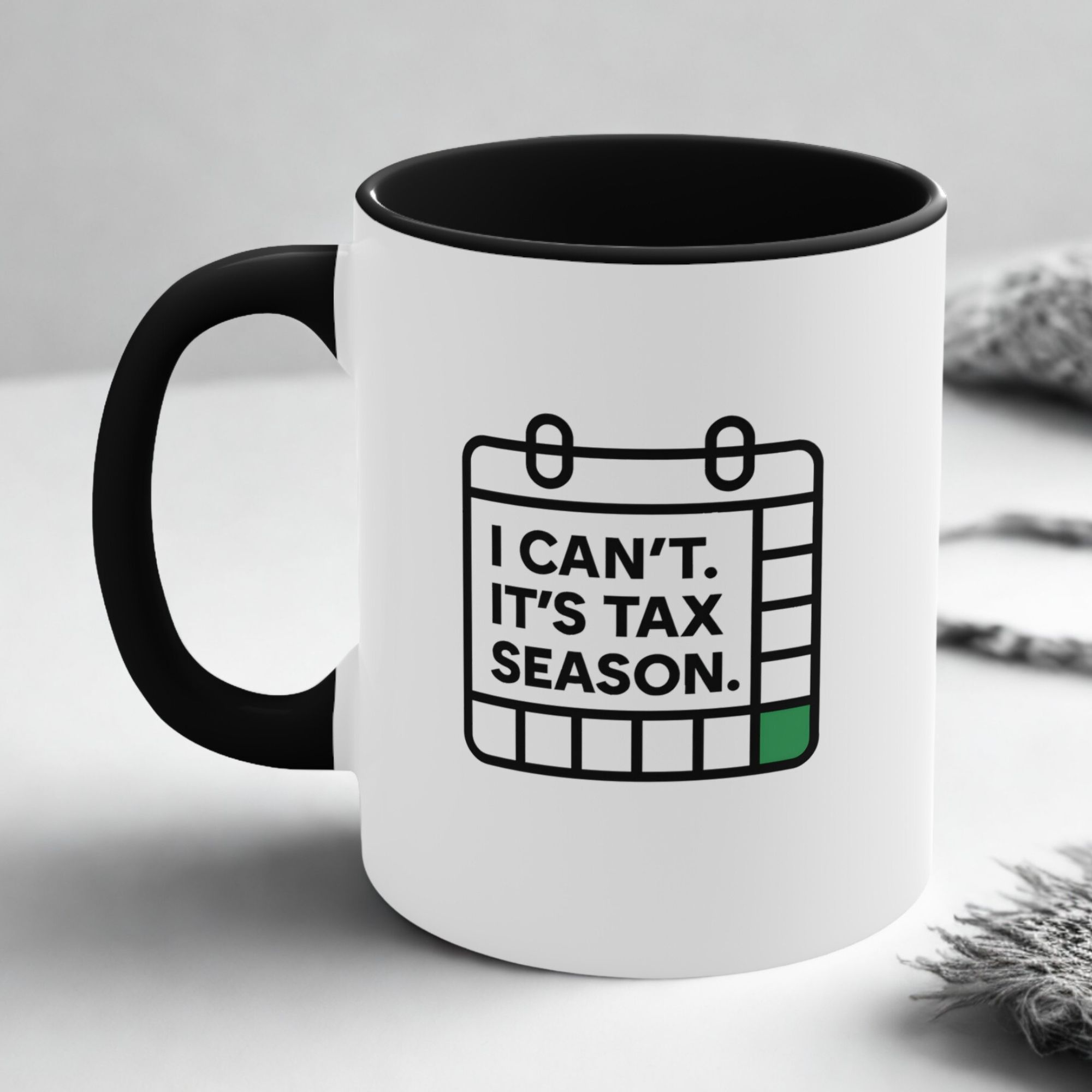 Printed on a sleek white ceramic mug with a bold black interior and handle, it’s perfect for anyone pushing through tax season with focus, grit, and a daily dose of caffeine.