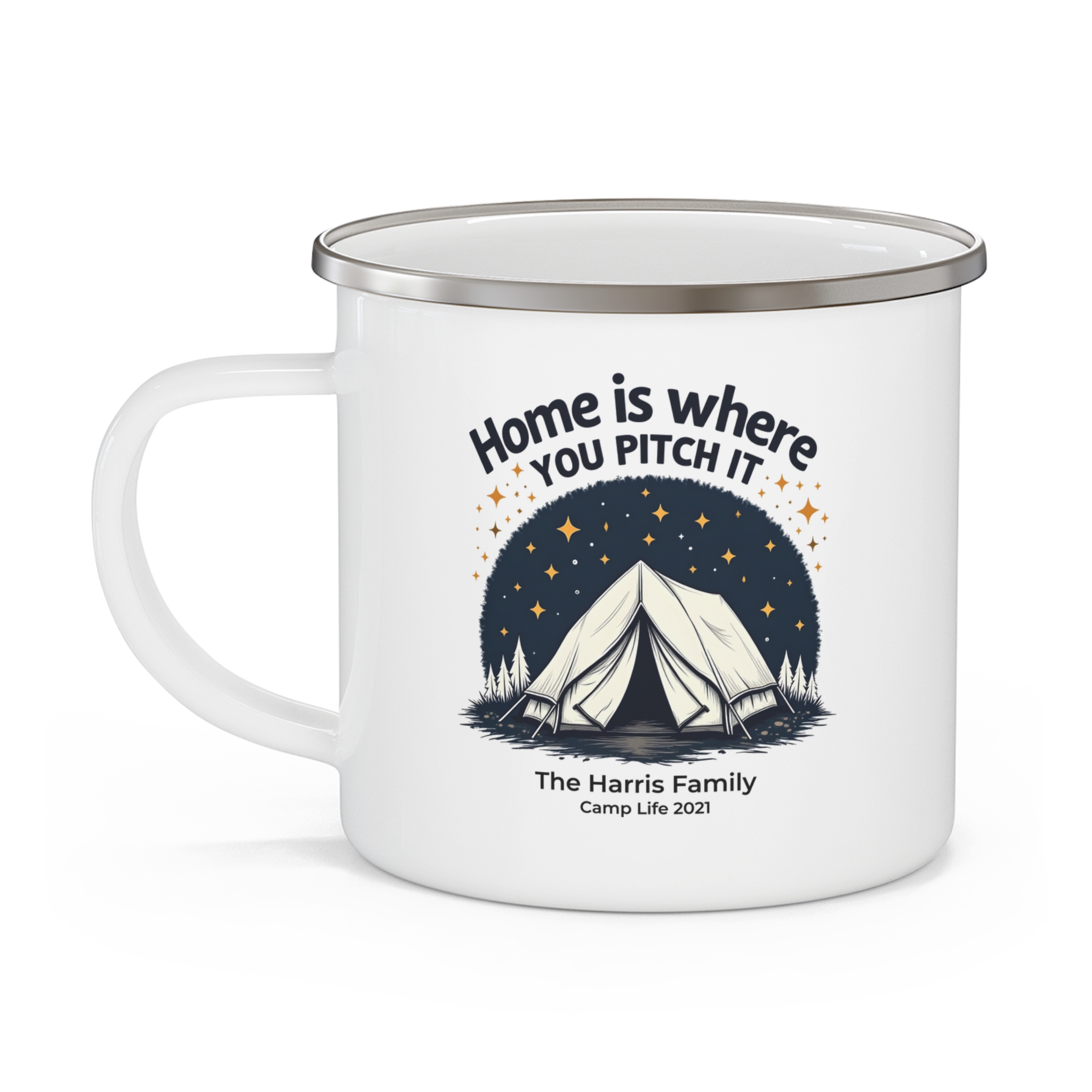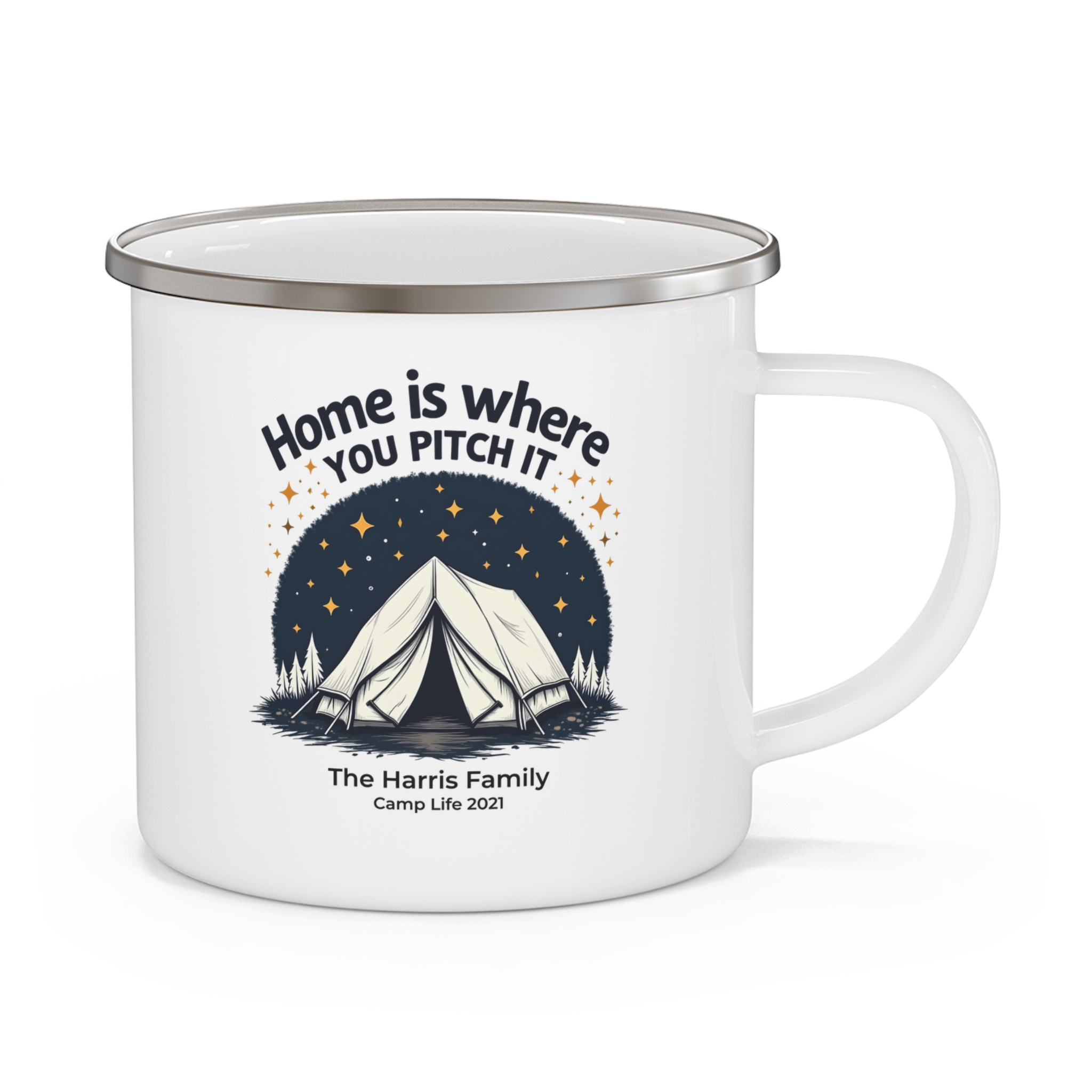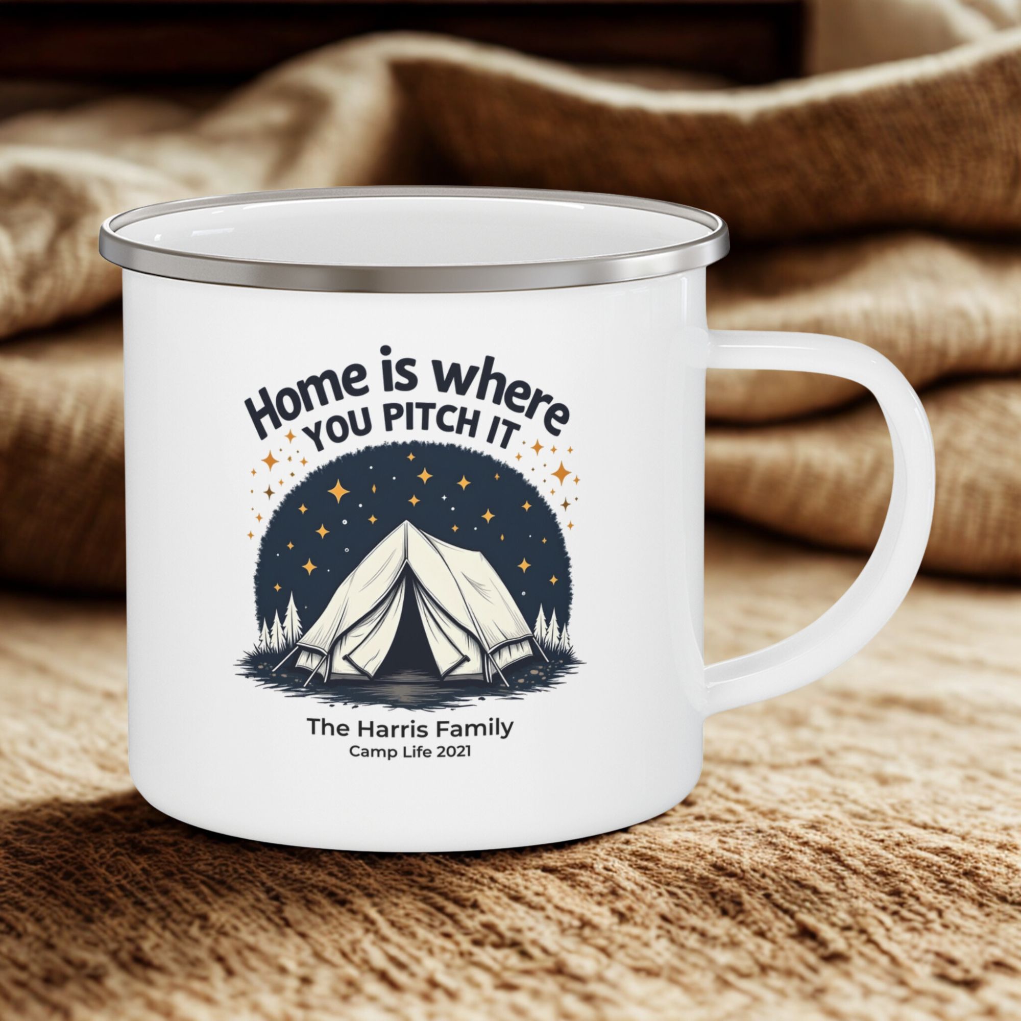 Tent life mug — a timeless camping-themed design featuring a pitched tent under a starry night sky with the phrase “Home is where you pitch it.” Custom family name and year text appear below the design, making it a meaningful personalised keepsake for camping families and outdoor lovers.