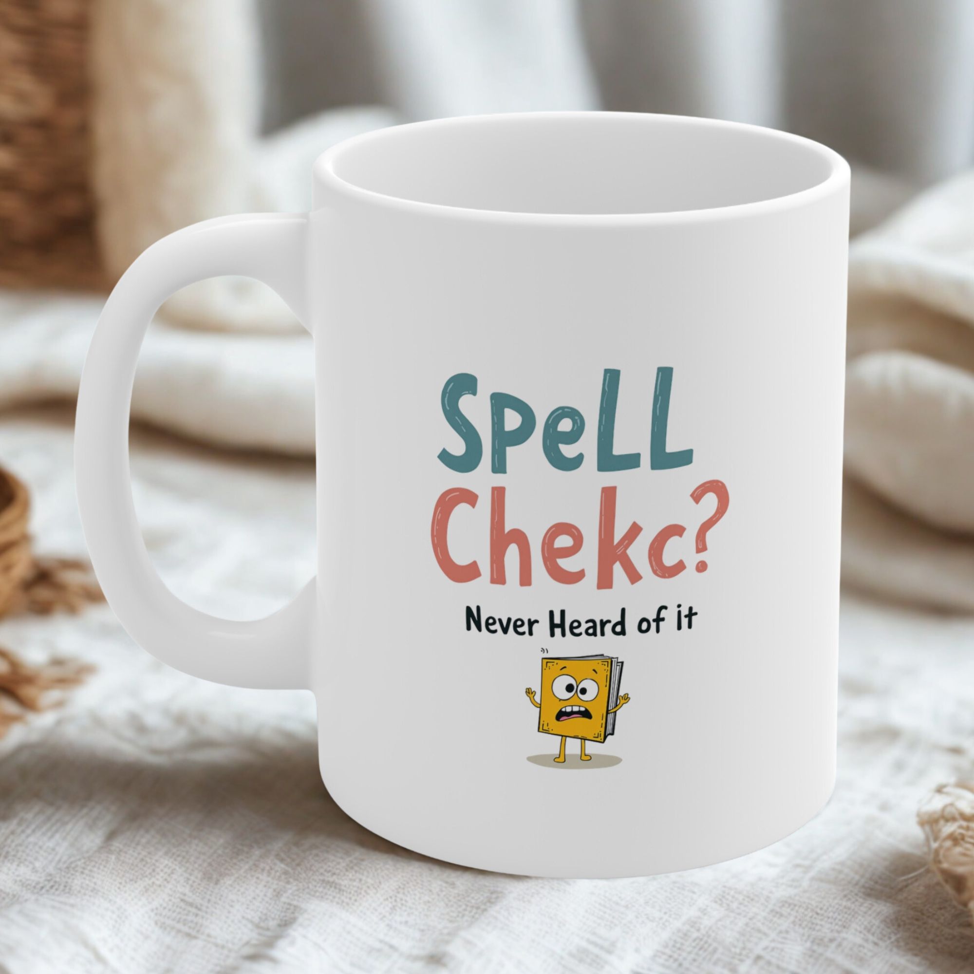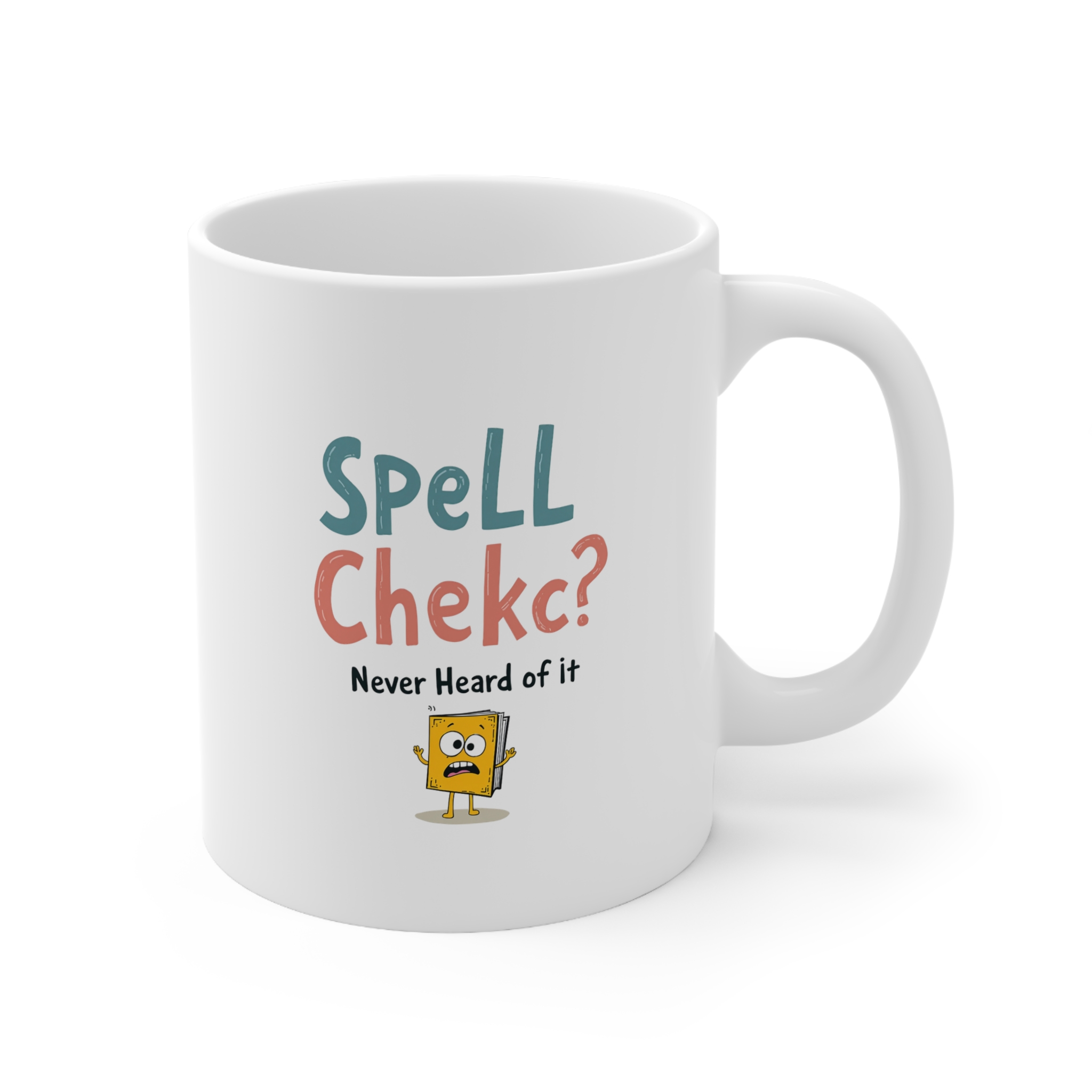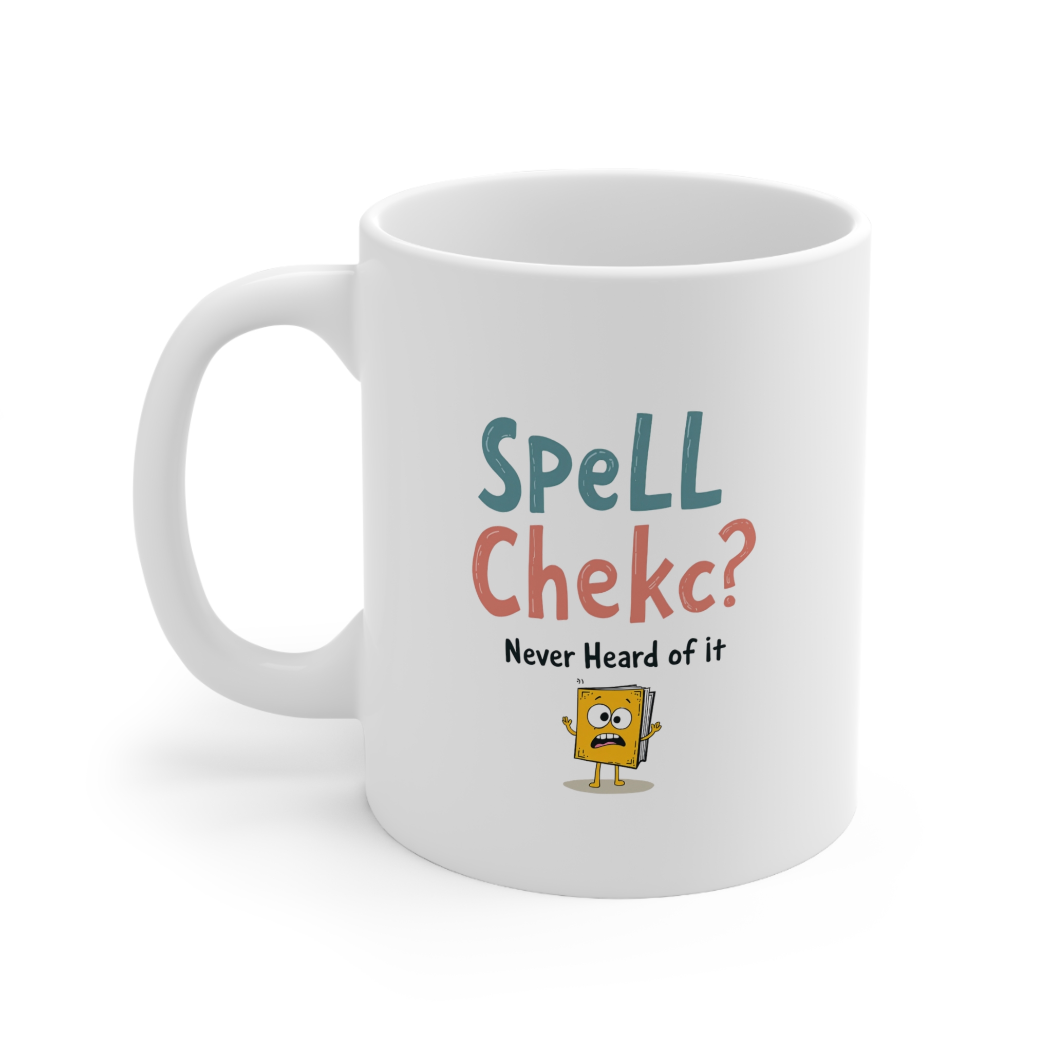 Misspelled on purpose and proud of it! This typo coffee mug delivers a hilarious take on every grammar lover’s worst nightmare. Featuring the bold and intentionally incorrect “SpelL Chekc? Never Heard of it” with a panicked cartoon book character, this mug is the perfect gag gift for writers, editors, teachers, or anyone with a sense of humor and a caffeine addiction.