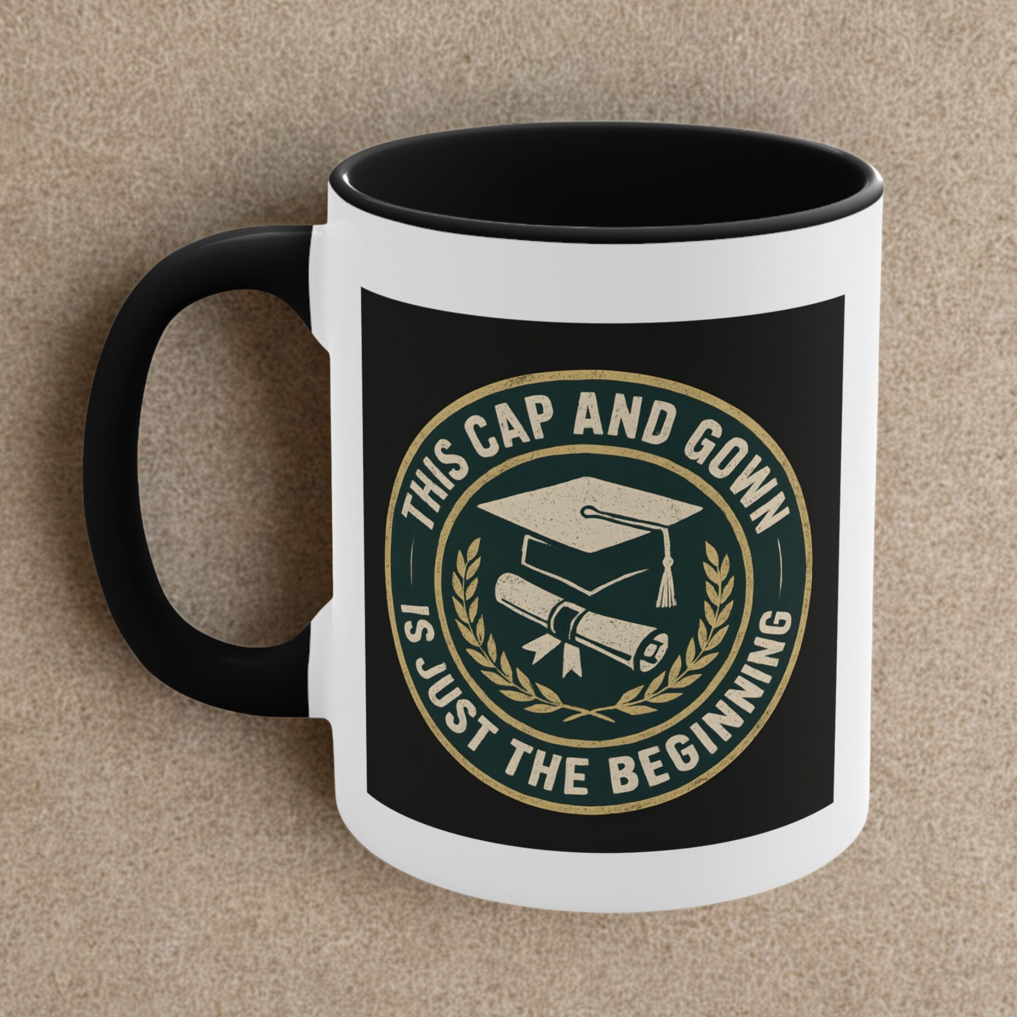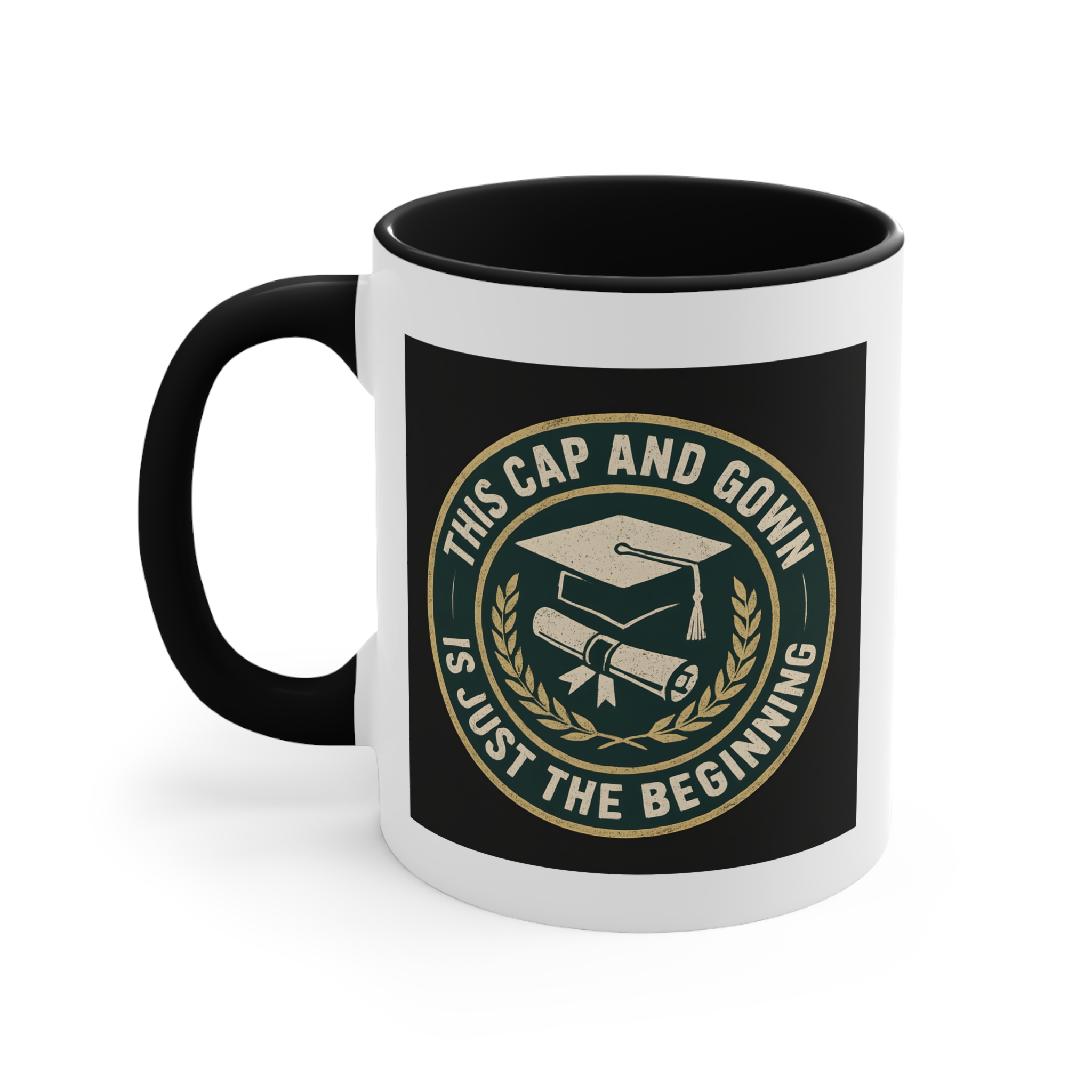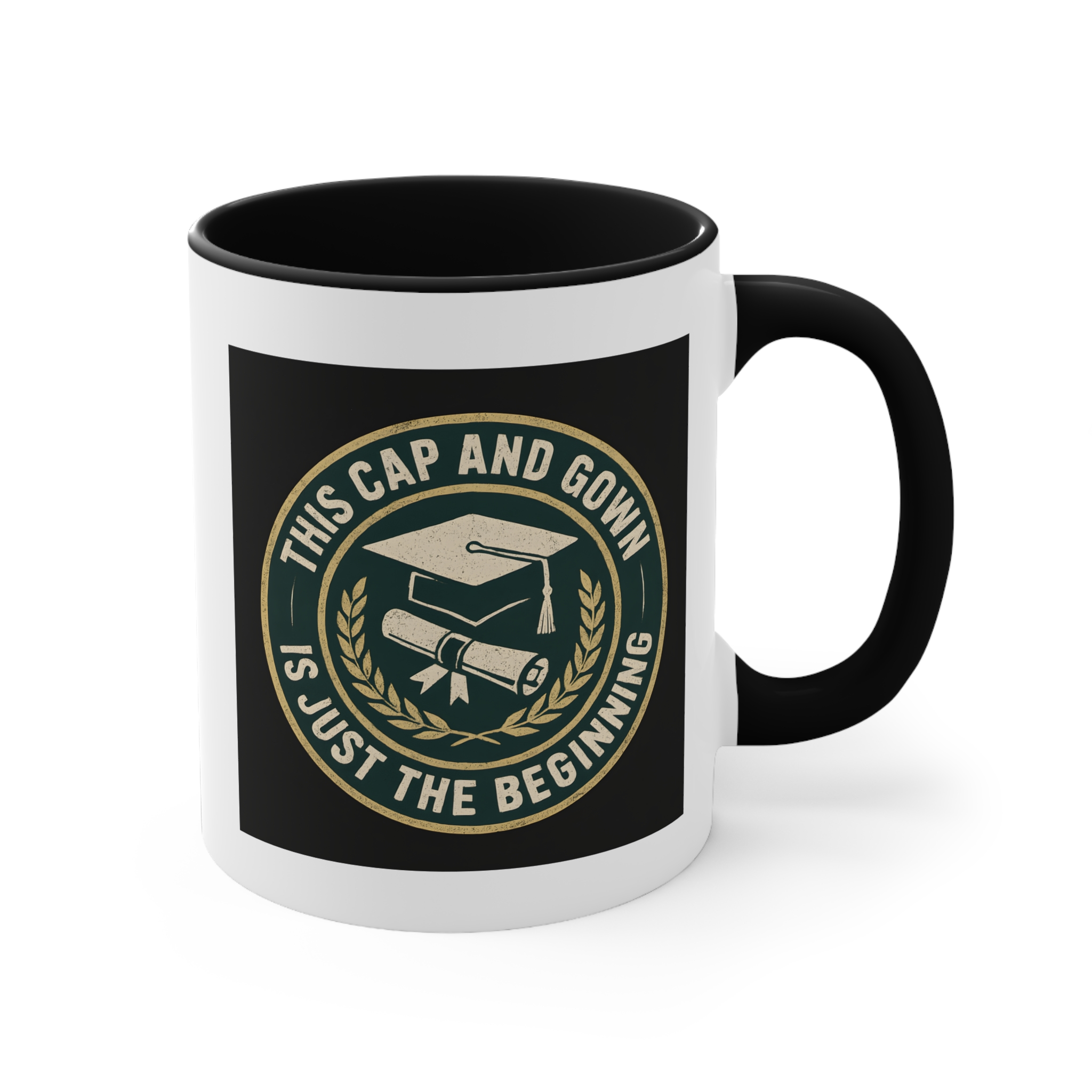 University graduate gift for those stepping proudly into their next chapter! This bold and timeless mug features a classic emblem design with a graduation cap and diploma surrounded by laurel leaves, paired with the inspiring message “This Cap and Gown Is Just the Beginning.”