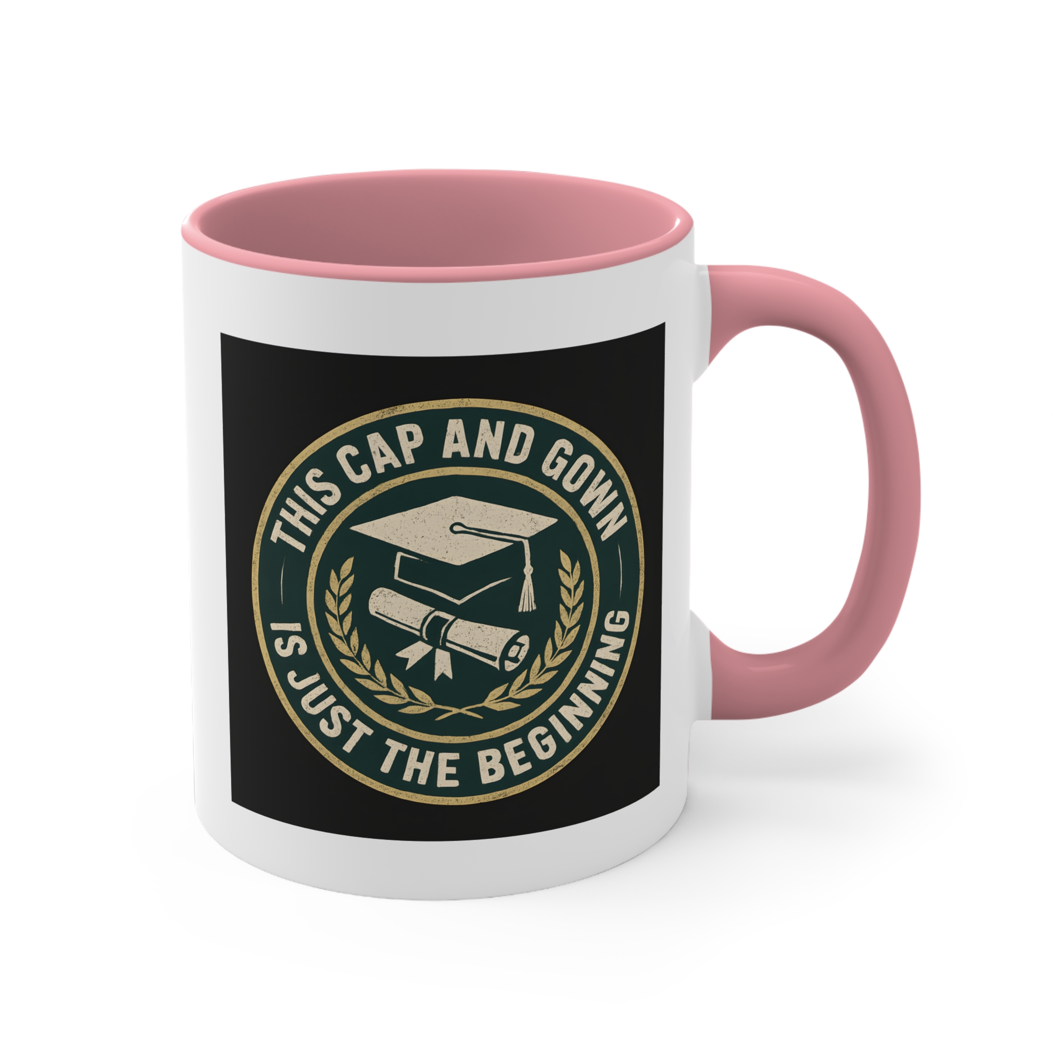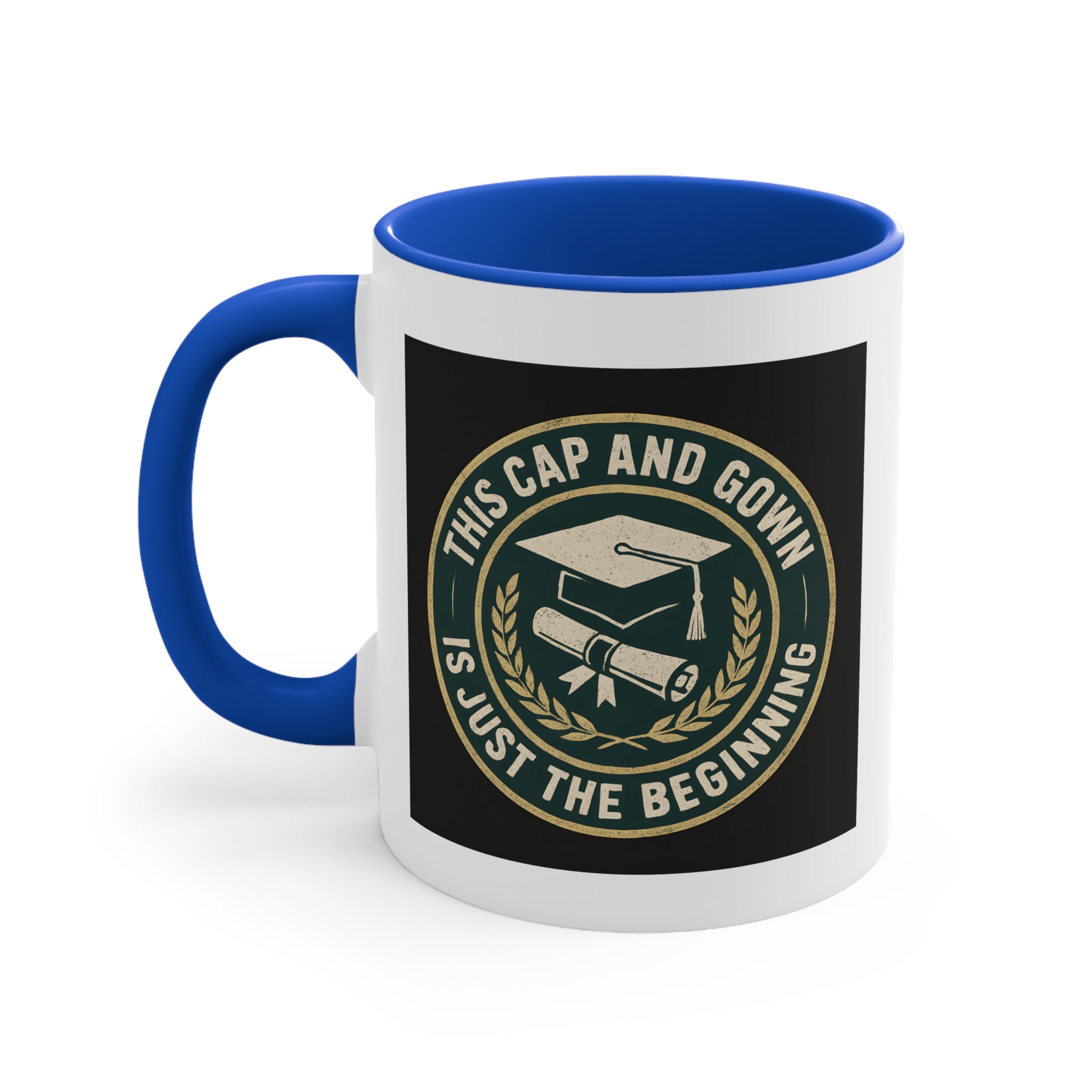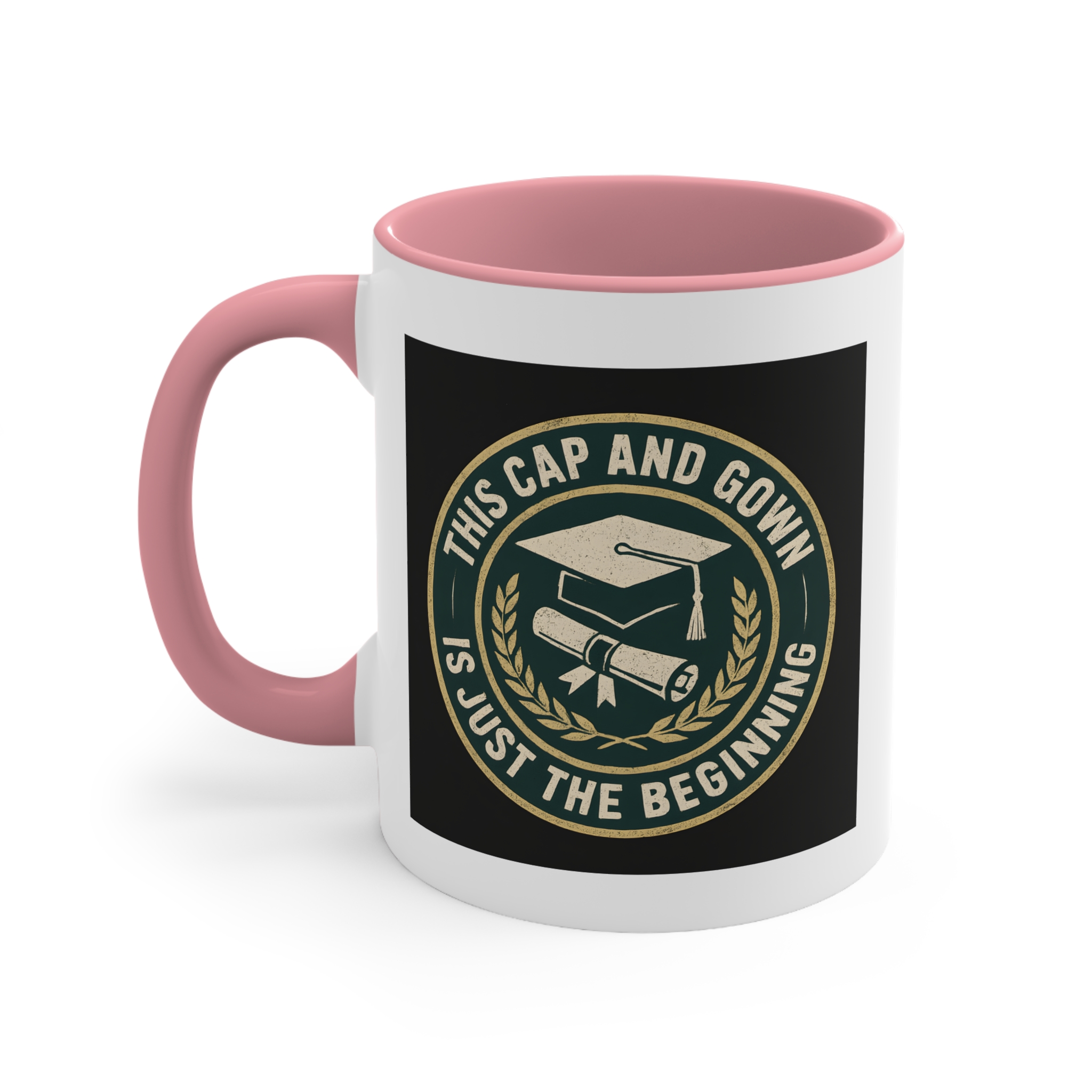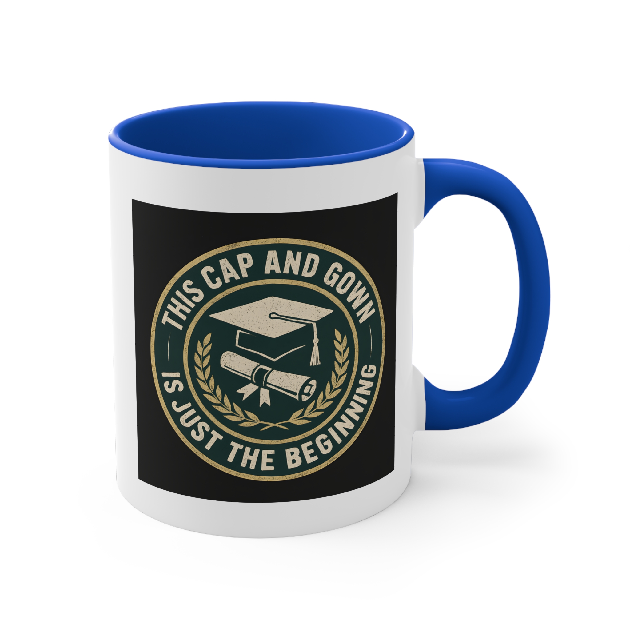 University graduate gift for those stepping proudly into their next chapter! This bold and timeless mug features a classic emblem design with a graduation cap and diploma surrounded by laurel leaves, paired with the inspiring message “This Cap and Gown Is Just the Beginning.”