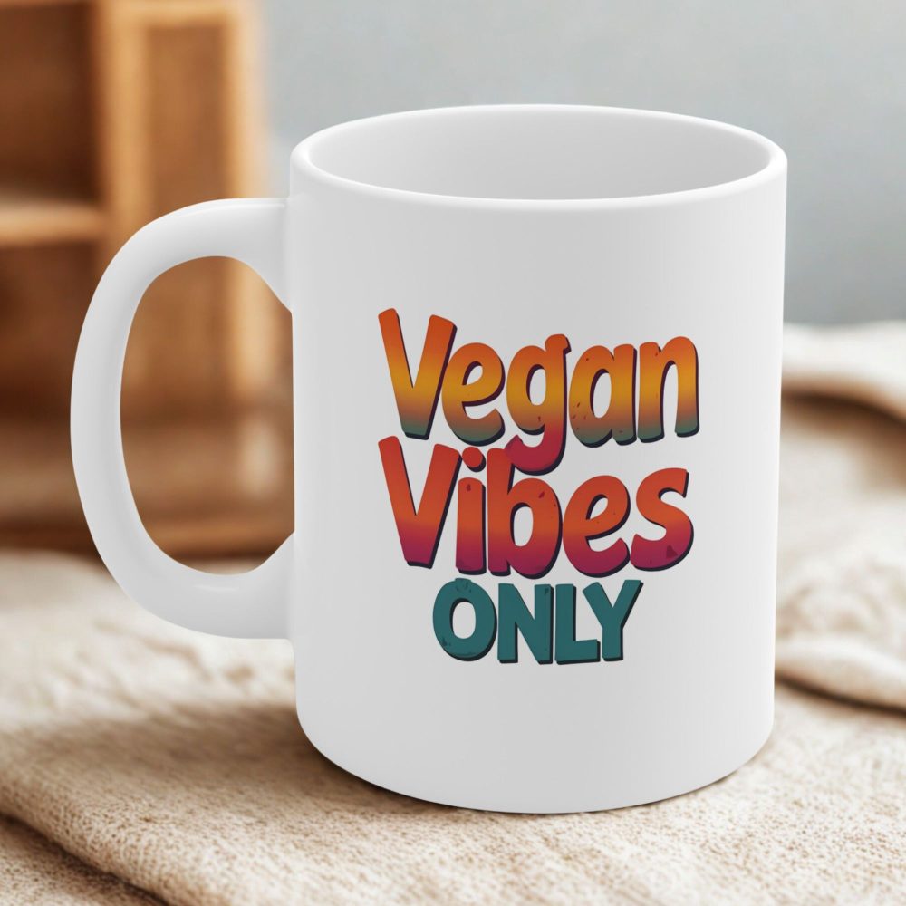 Retro-style vegan coffee mug with rainbow “Vegan Vibes Only” text—bold, fun, and plant-powered.
