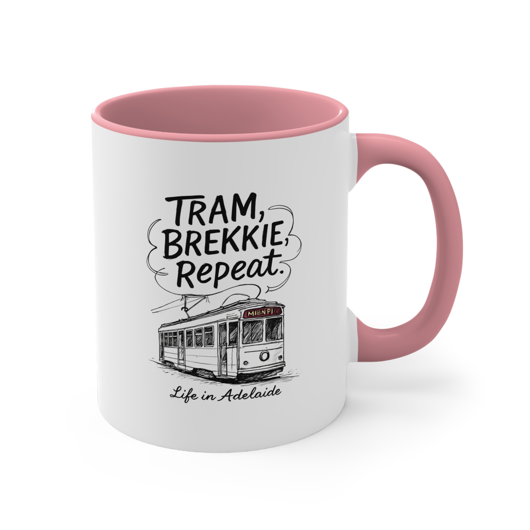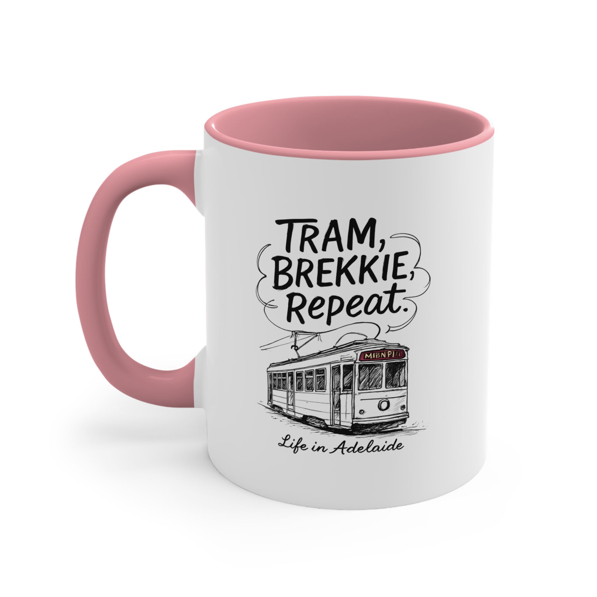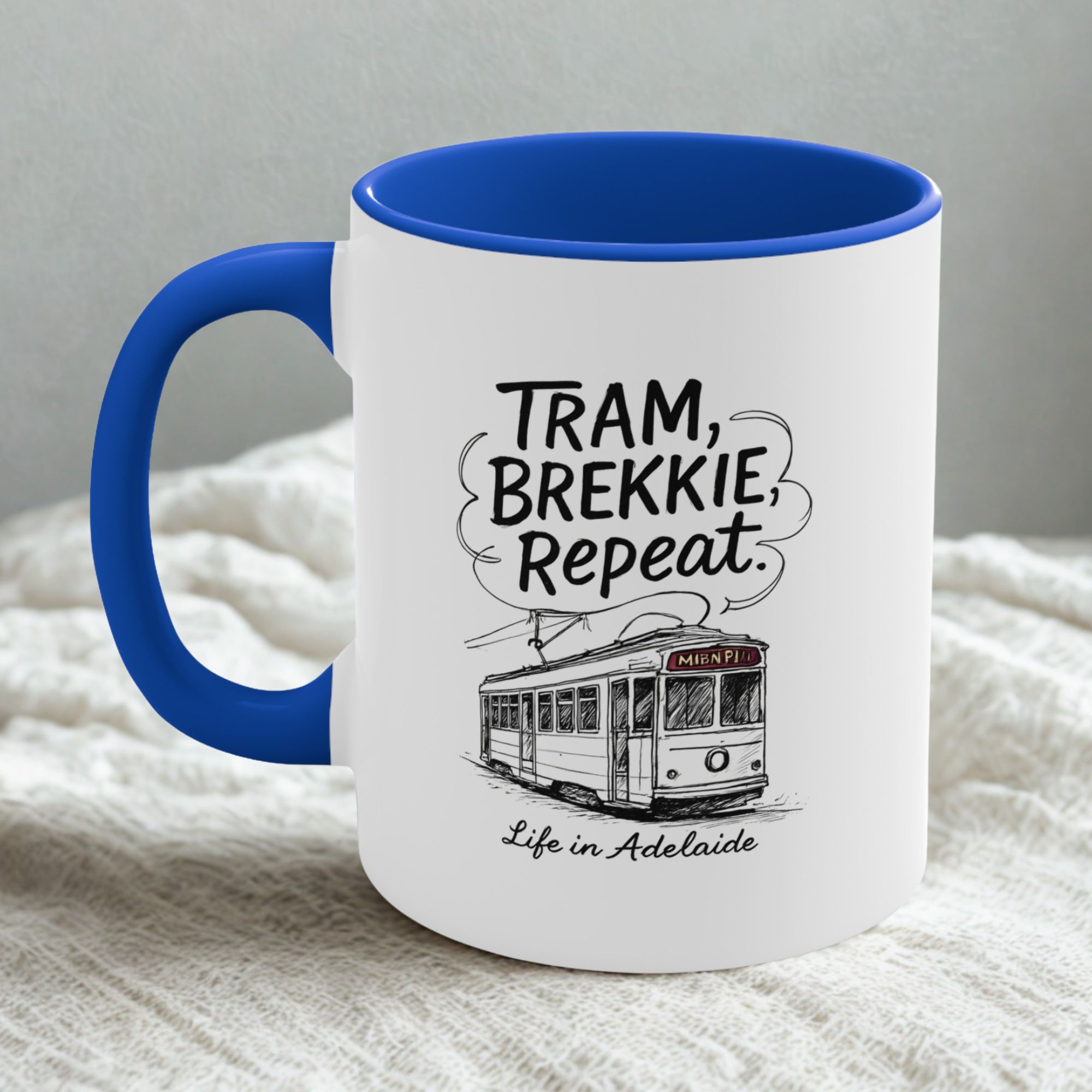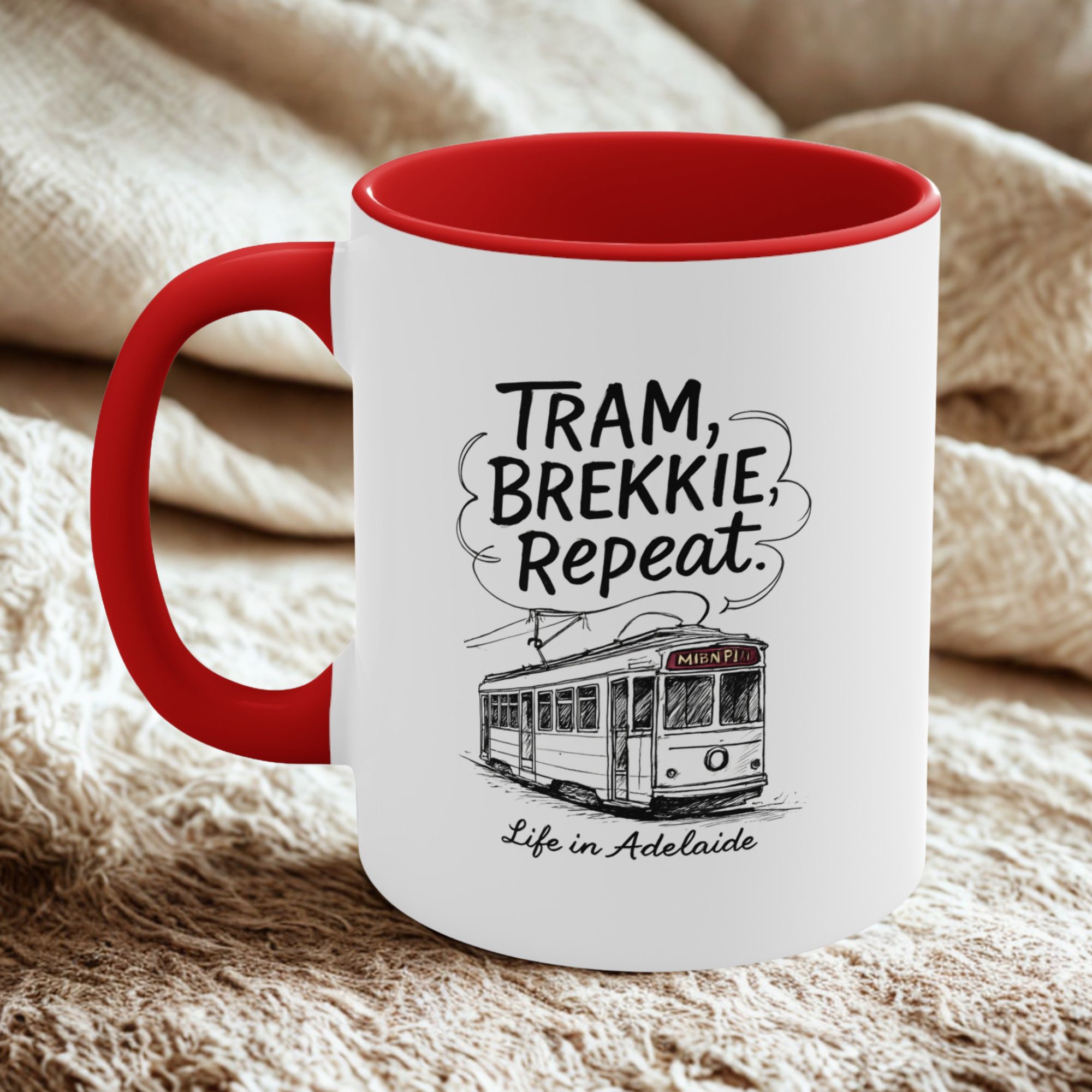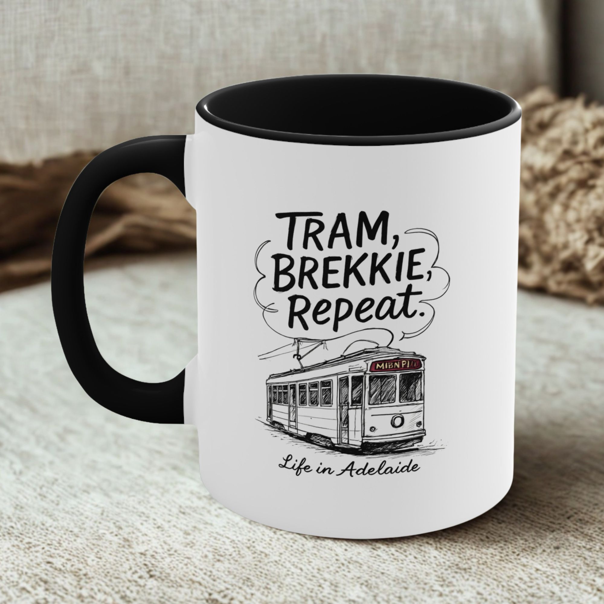 Vintage tram mug featuring hand-drawn Adelaide sketch and “Tram, Brekkie, Repeat” quote. A charming reminder of South Aussie life.
