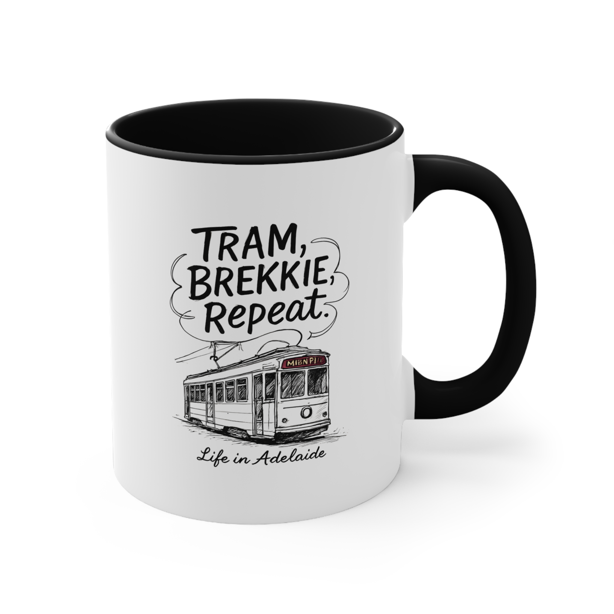 This vintage tram mug captures the iconic rhythm of Adelaide mornings—tram rides, breakfast rituals, and coffee sips. The minimalist black-and-white tram sketch pairs beautifully with bold text: “Tram, Brekkie, Repeat.” Ideal for locals, expats, or sketch art fans, it’s a stylish daily reminder of Adelaide’s charm.