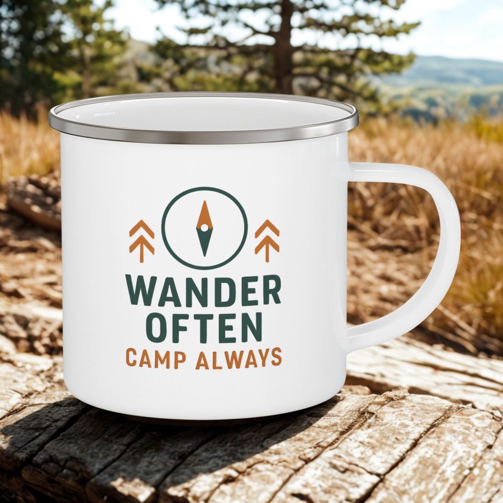 Wander often camp always mug — a minimalist camping design for explorers and outdoor lovers. Perfect for camping trips and travel life. 12oz enamel mug made for adventure coffee.