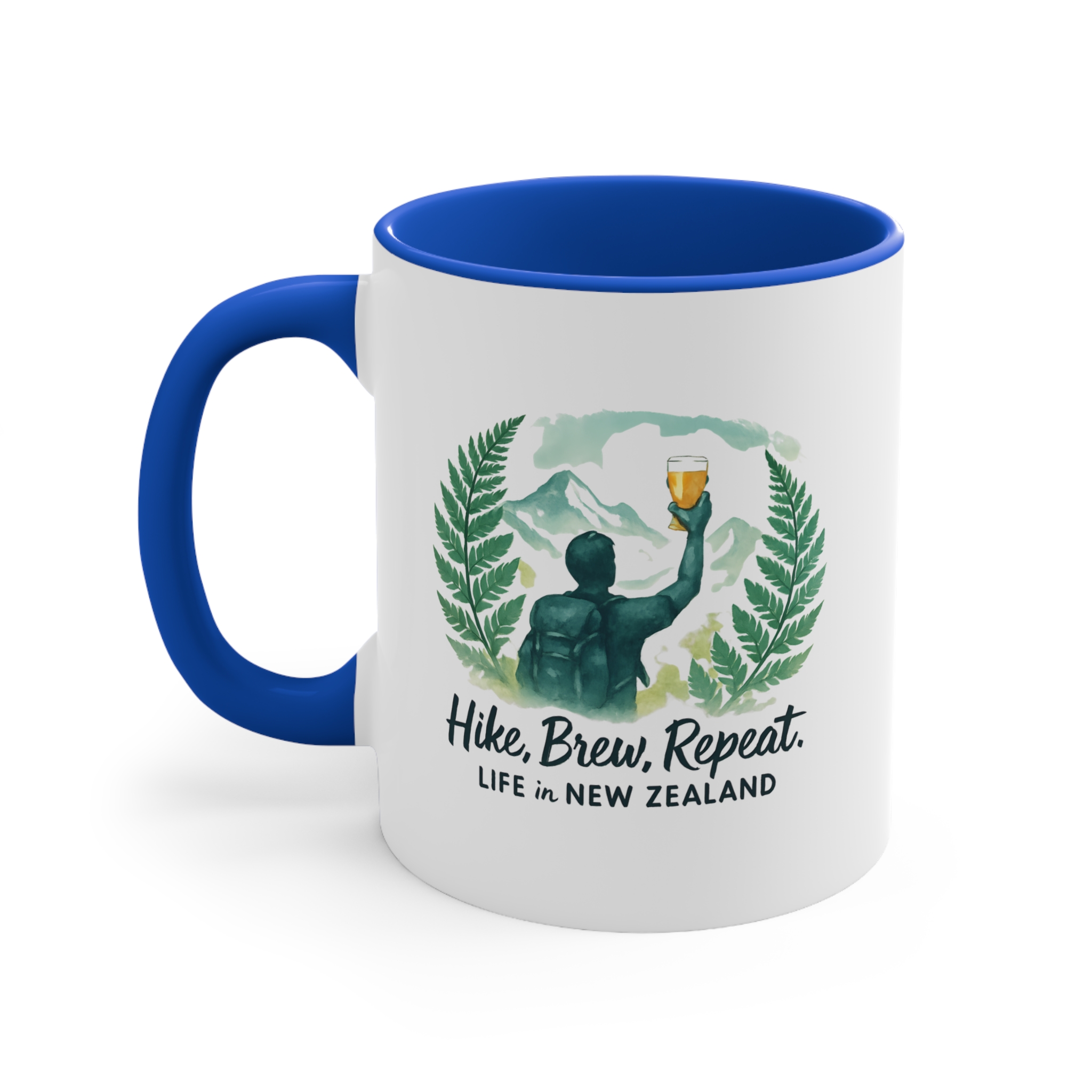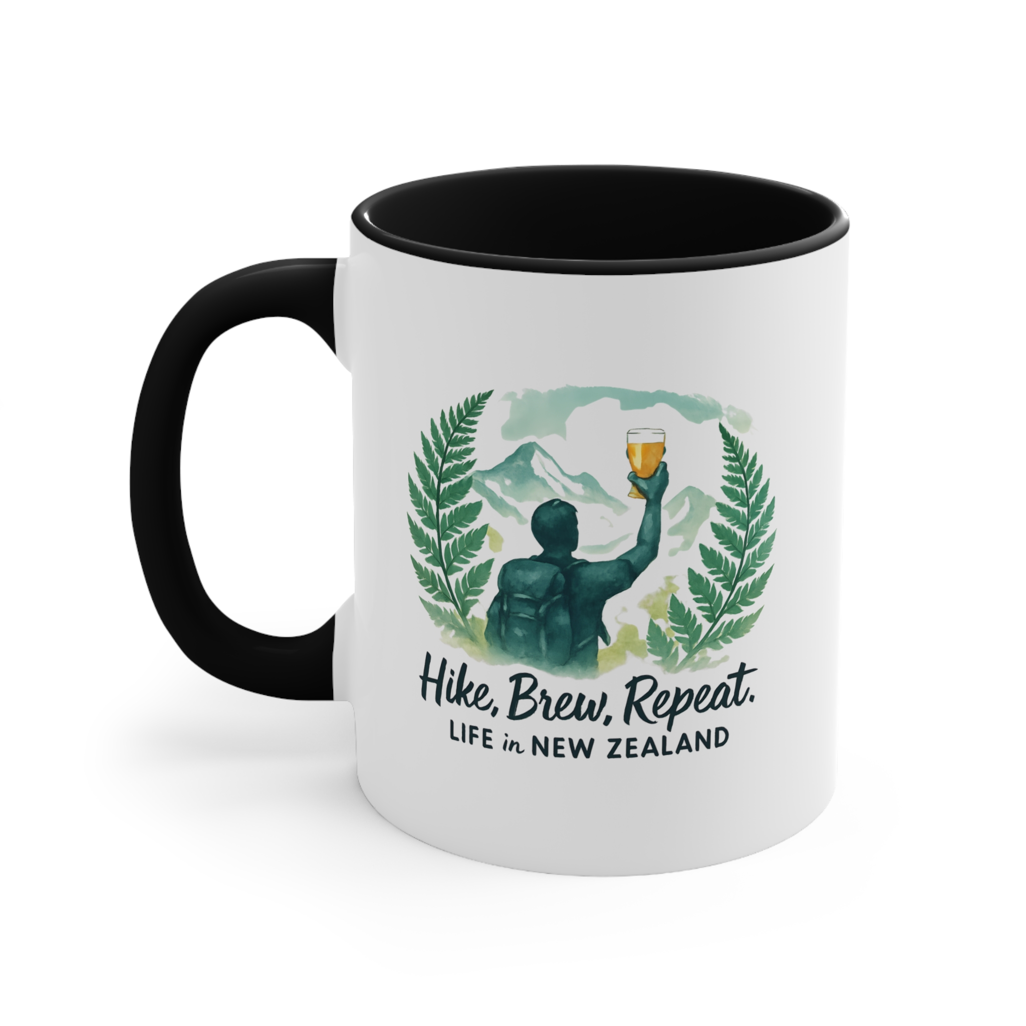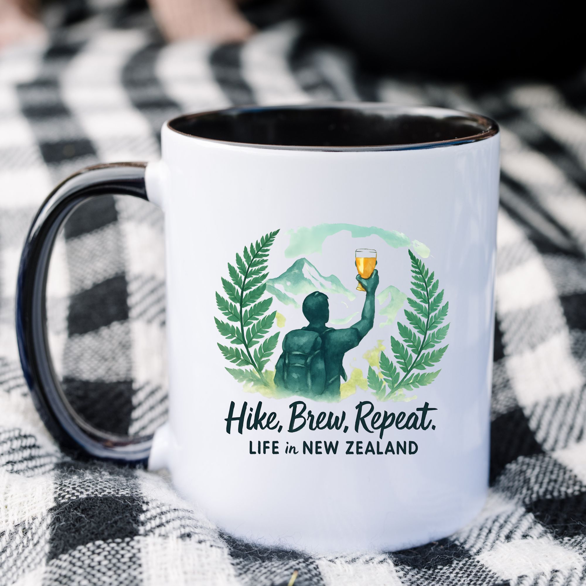 Celebrate New Zealand’s beauty and spirit with this watercolor New Zealand mug. Designed with hand-painted style and soft brush textures, it features a hiker raising a beer in triumph, framed by native fern leaves and a misty mountain backdrop. The phrase “Hike, Brew, Repeat – Life in New Zealand” ties it all together in a poetic tribute to outdoor adventure and slow sips.