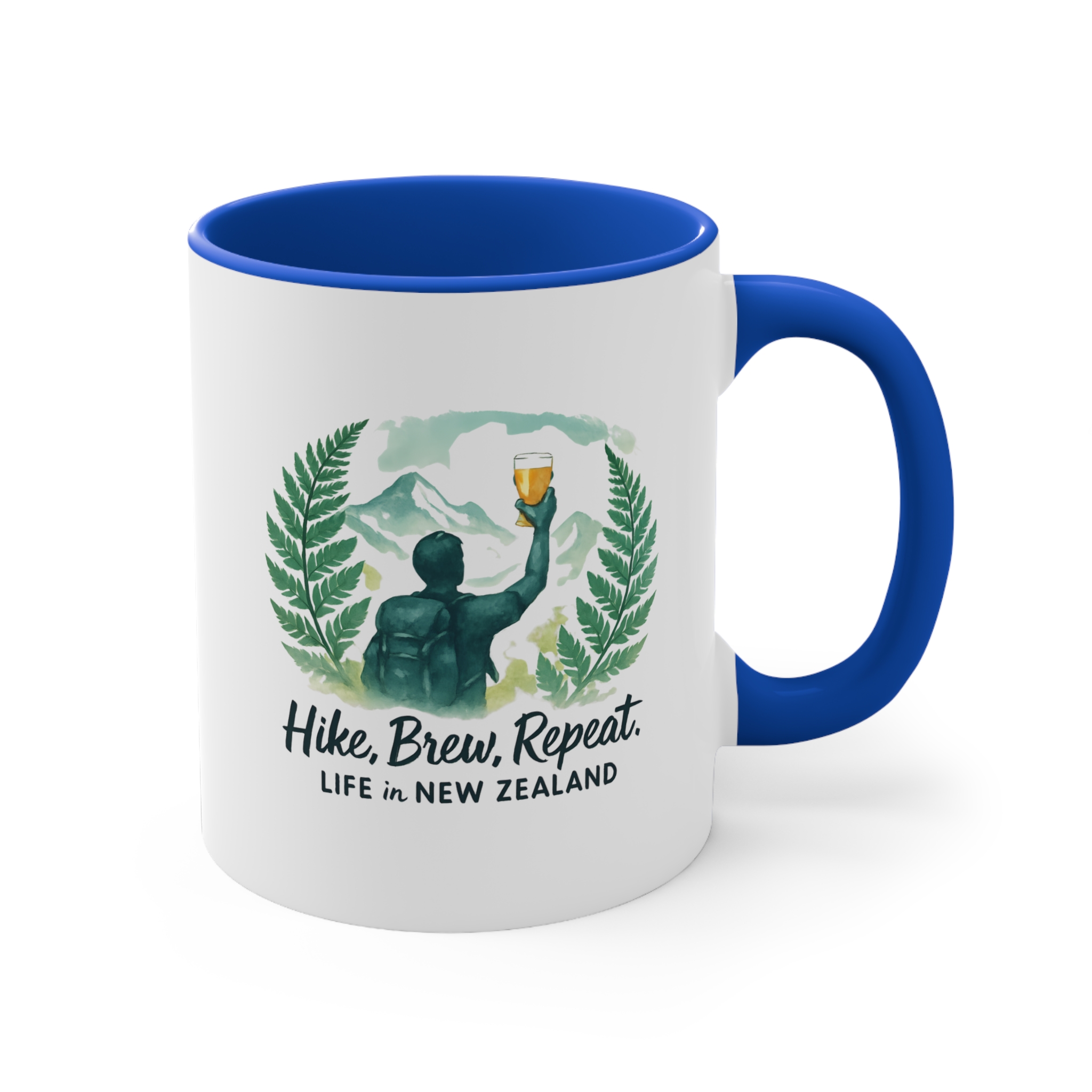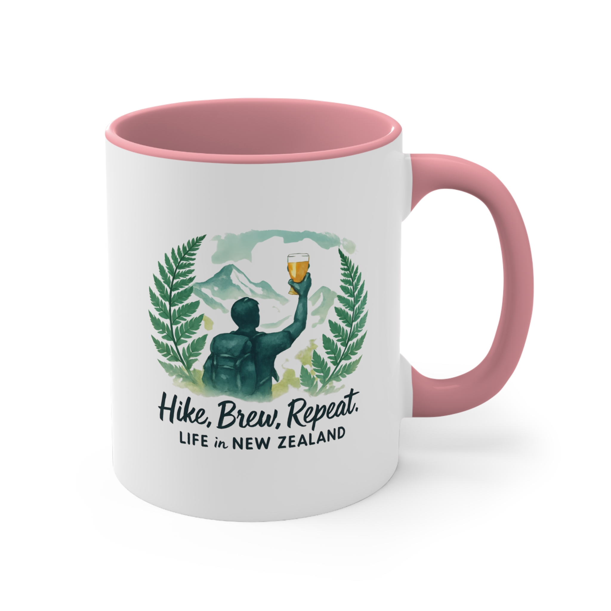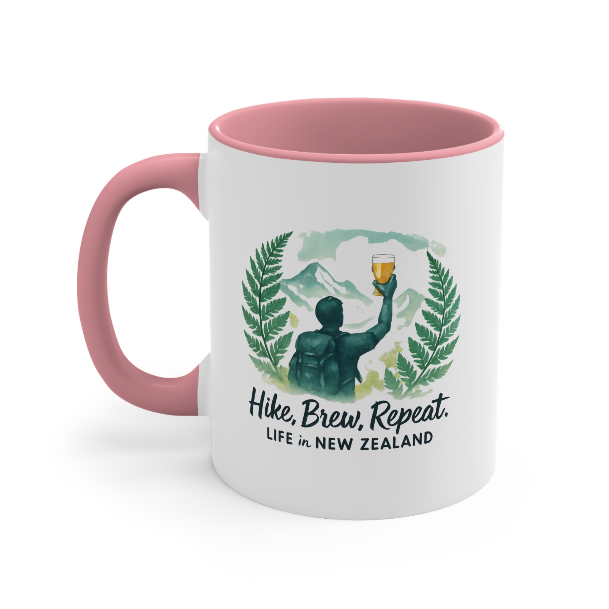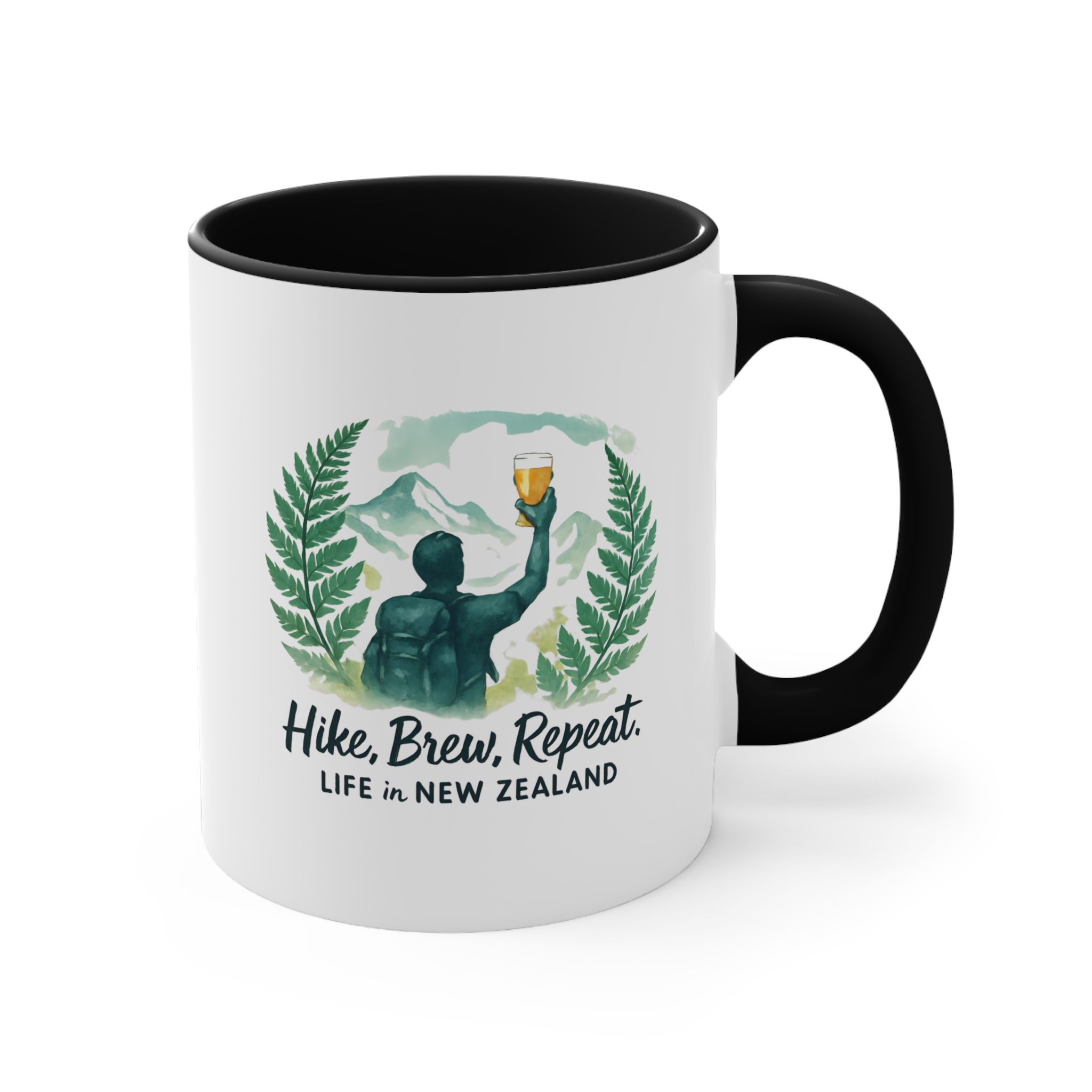 Celebrate New Zealand’s beauty and spirit with this watercolor New Zealand mug. Designed with hand-painted style and soft brush textures, it features a hiker raising a beer in triumph, framed by native fern leaves and a misty mountain backdrop. The phrase “Hike, Brew, Repeat – Life in New Zealand” ties it all together in a poetic tribute to outdoor adventure and slow sips.