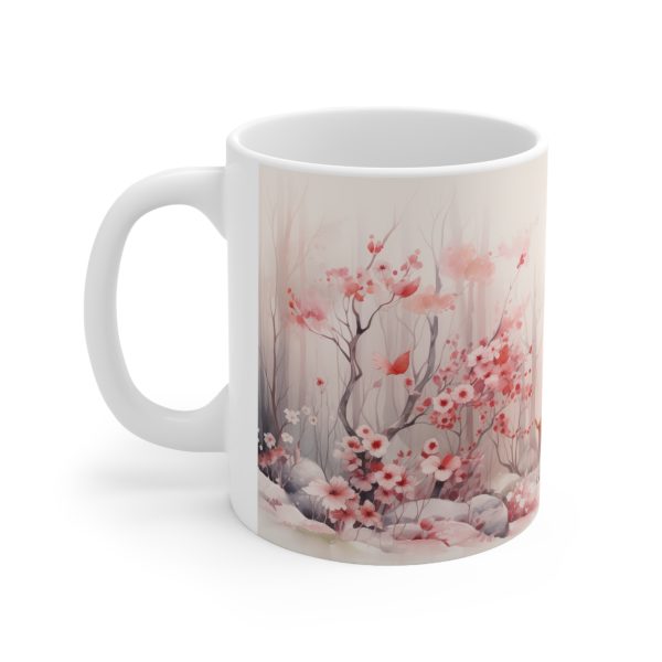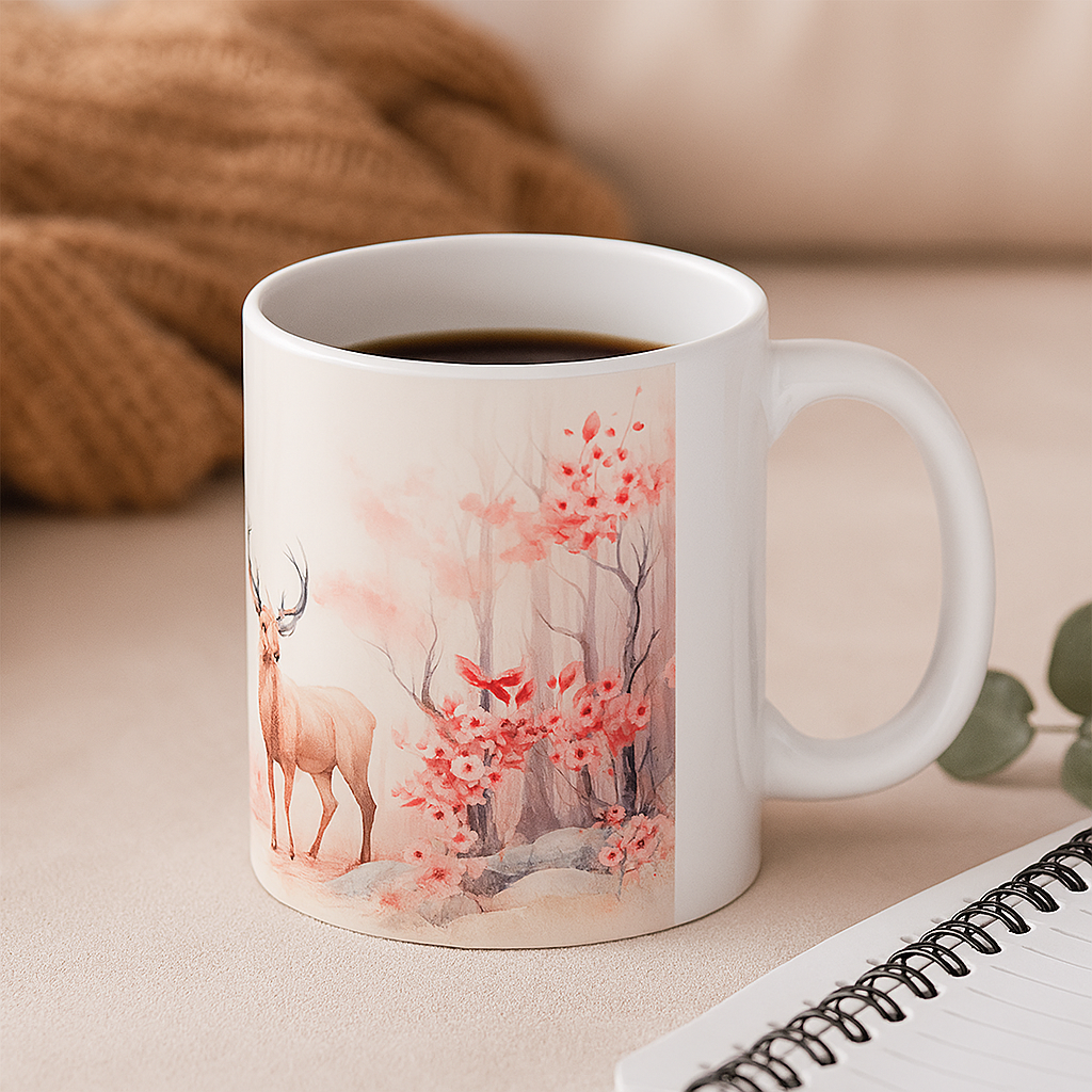 Capture the quiet beauty of the forest in winter with this elegant deer coffee mug. Featuring a majestic stag and its young companion standing amidst a snowy woodland of soft pink cherry blossoms and fluttering butterflies, this peaceful design evokes calm, warmth, and the magic of nature. The subtle snowfall and delicate colours make it an ideal seasonal piece—perfect for winter mornings, Christmas gifting, or year-round forest-inspired moments.