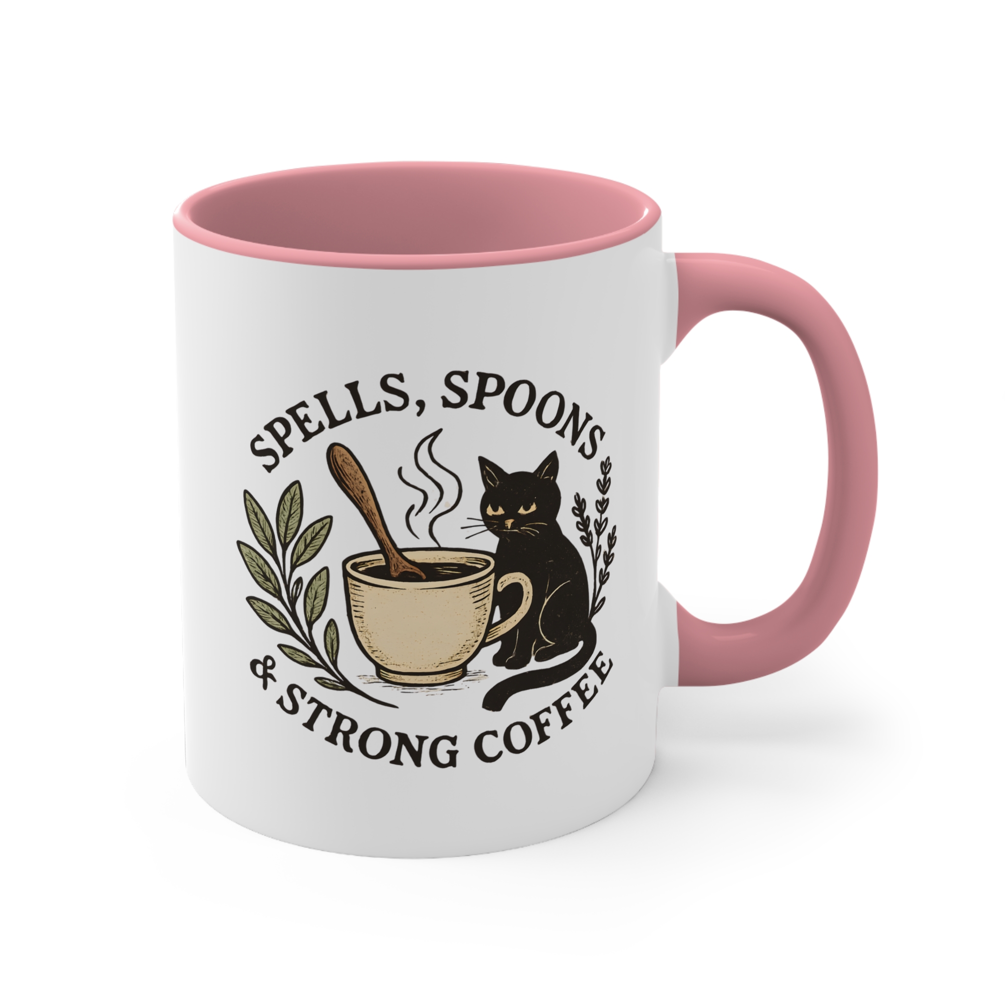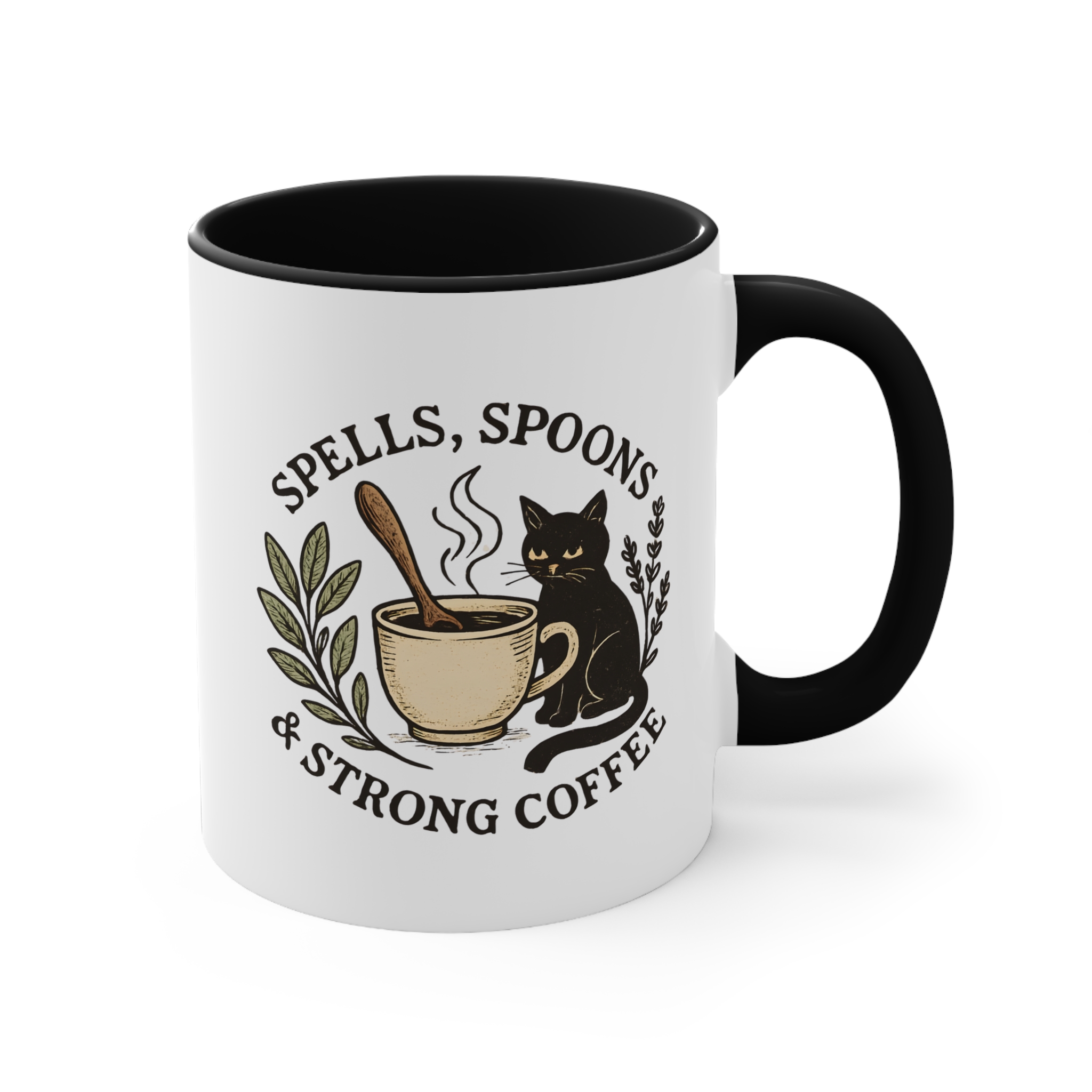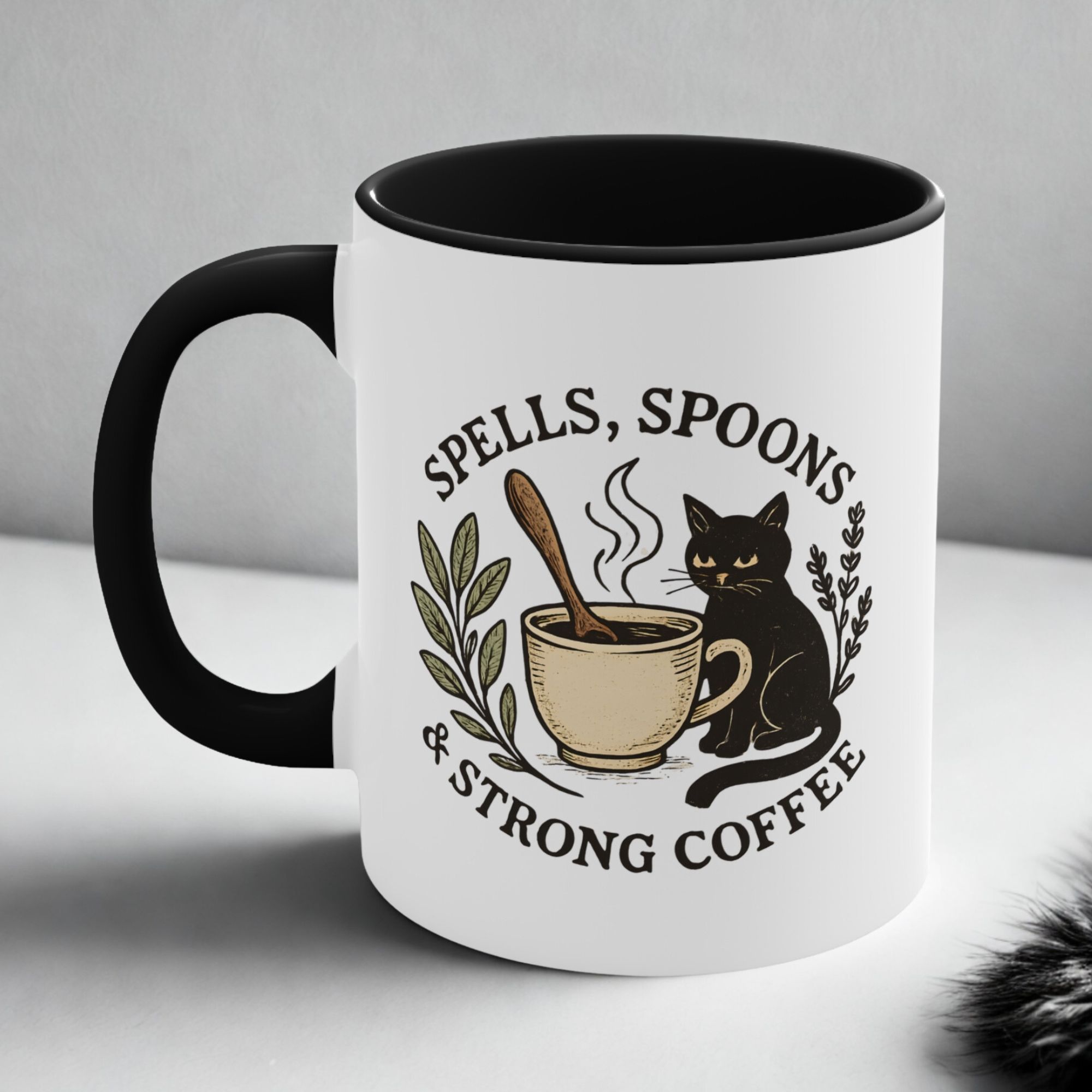 Spells, Spoons & Strong Coffee Mug – Witchy Black Cat Cup for Caffeinated Magic