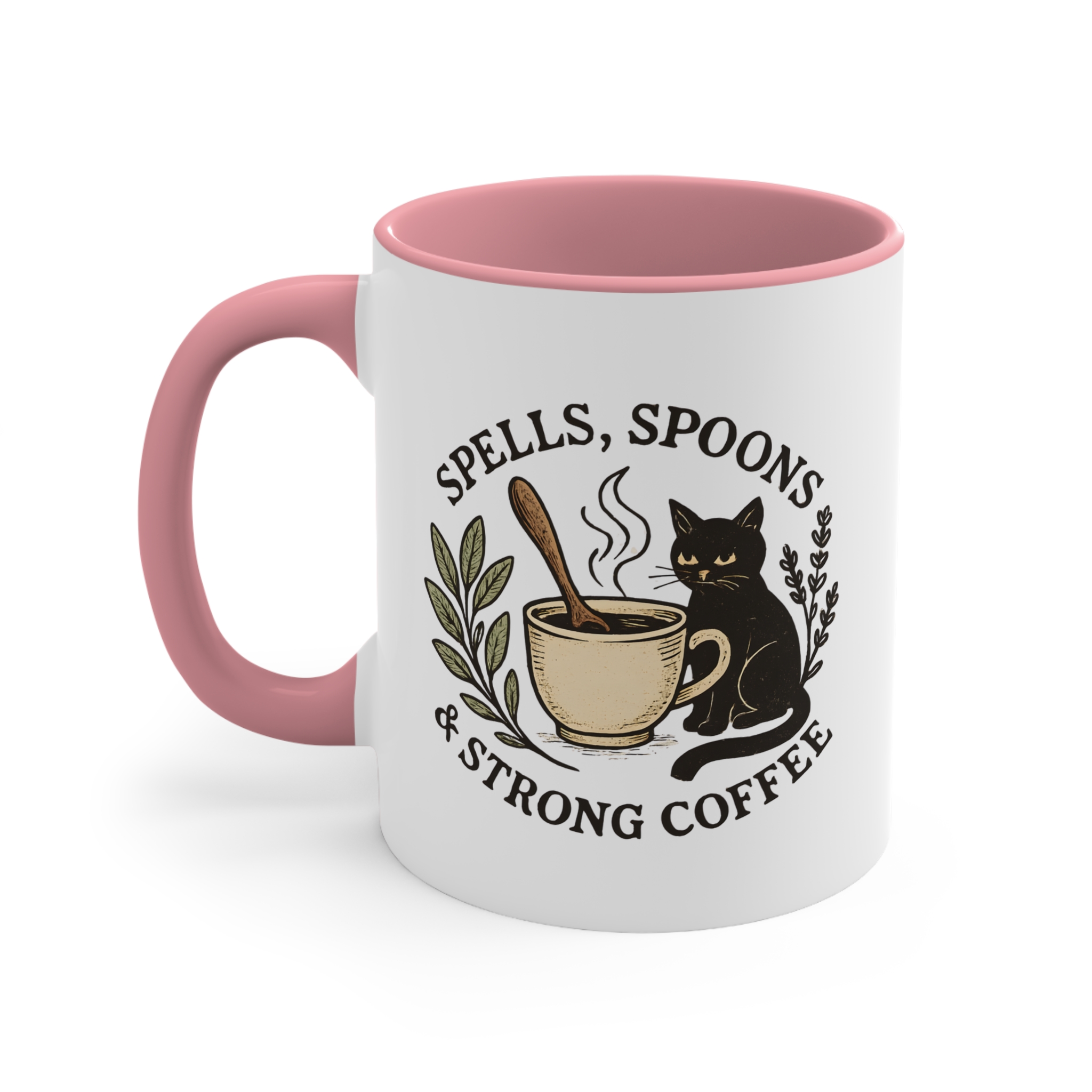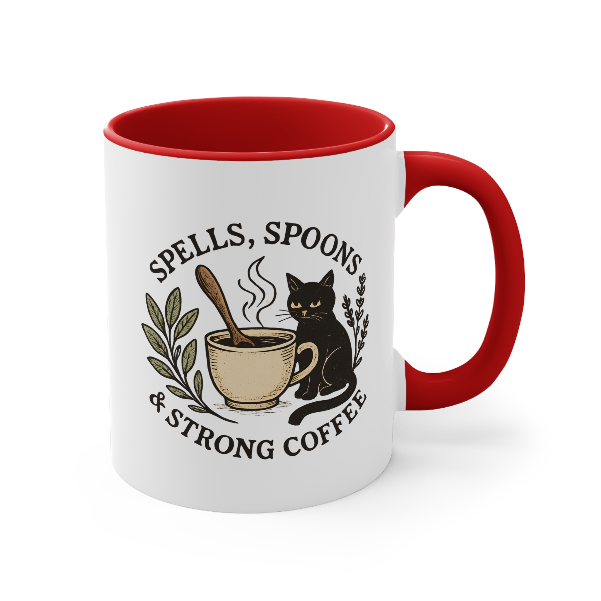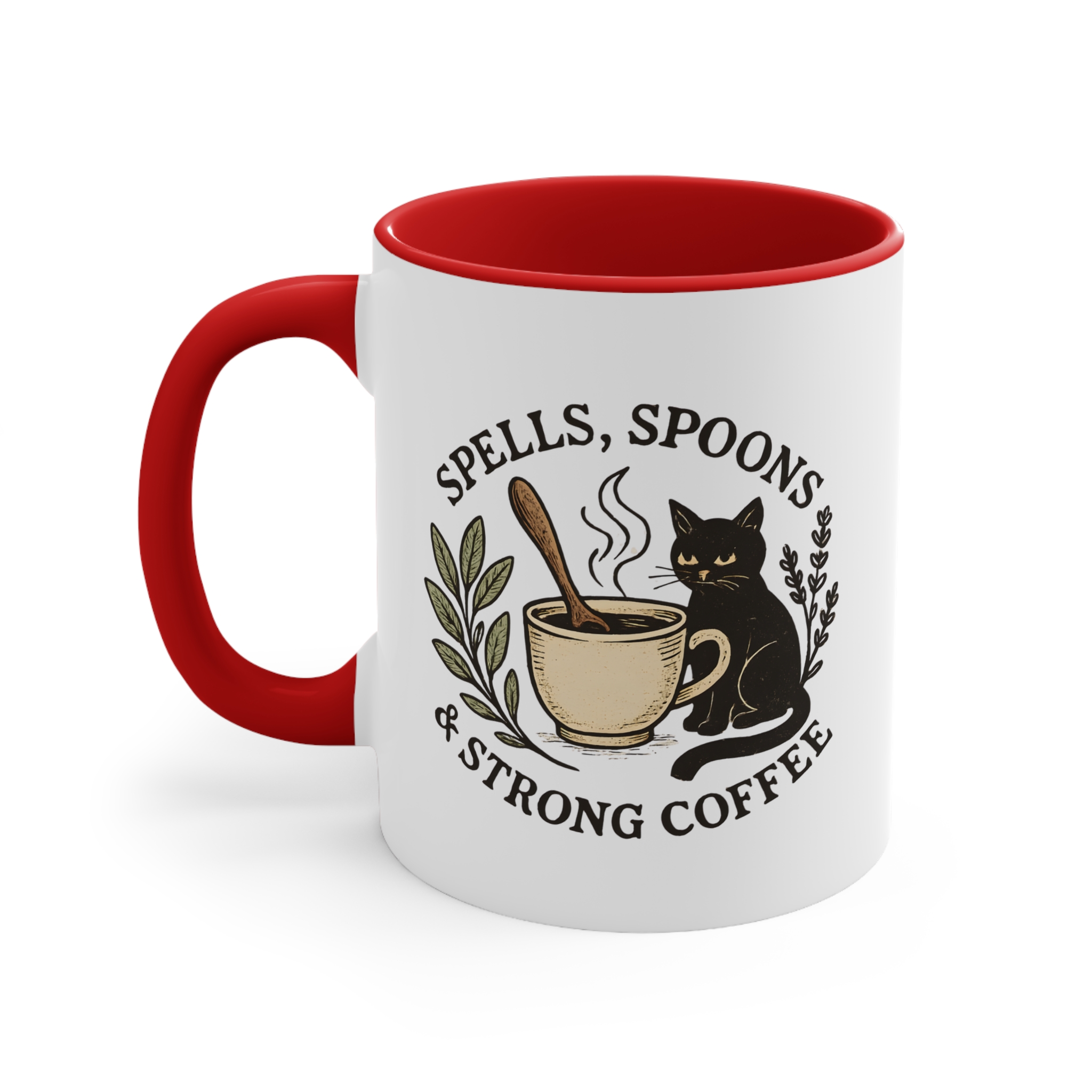 Spells, Spoons & Strong Coffee Mug – Witchy Black Cat Cup for Caffeinated Magic