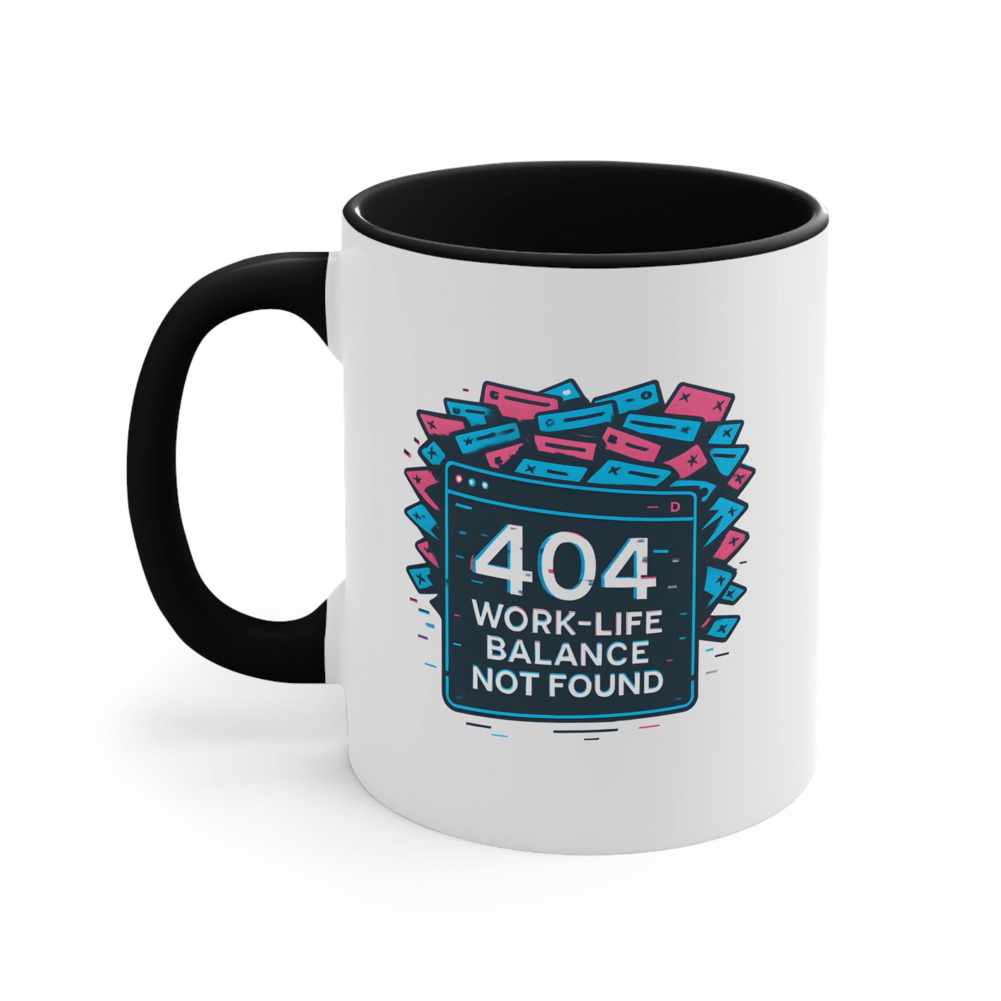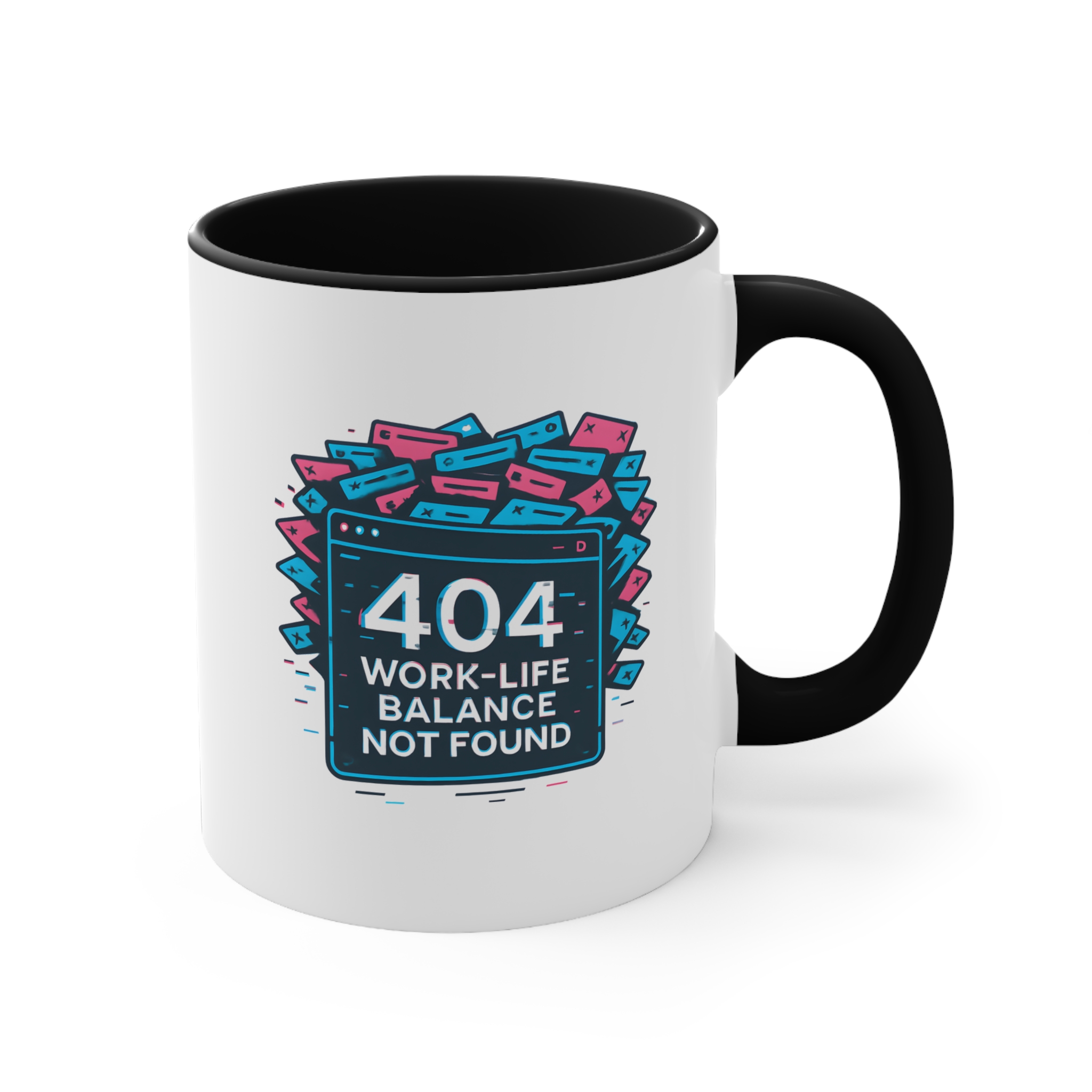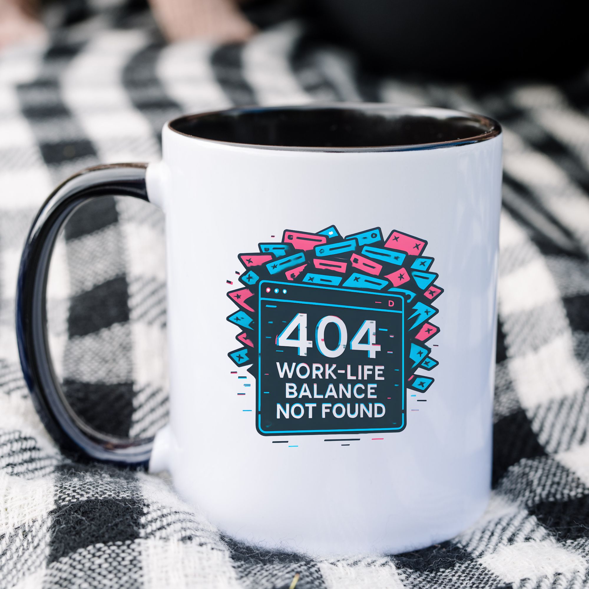 If your idea of balance is juggling spreadsheets, deadlines, and coffee breaks — this mug gets you. Featuring the classic “404 Work-Life Balance Not Found” error message surrounded by chaotic browser windows, this design is a hilarious nod to the burnout and busyness of modern work life.