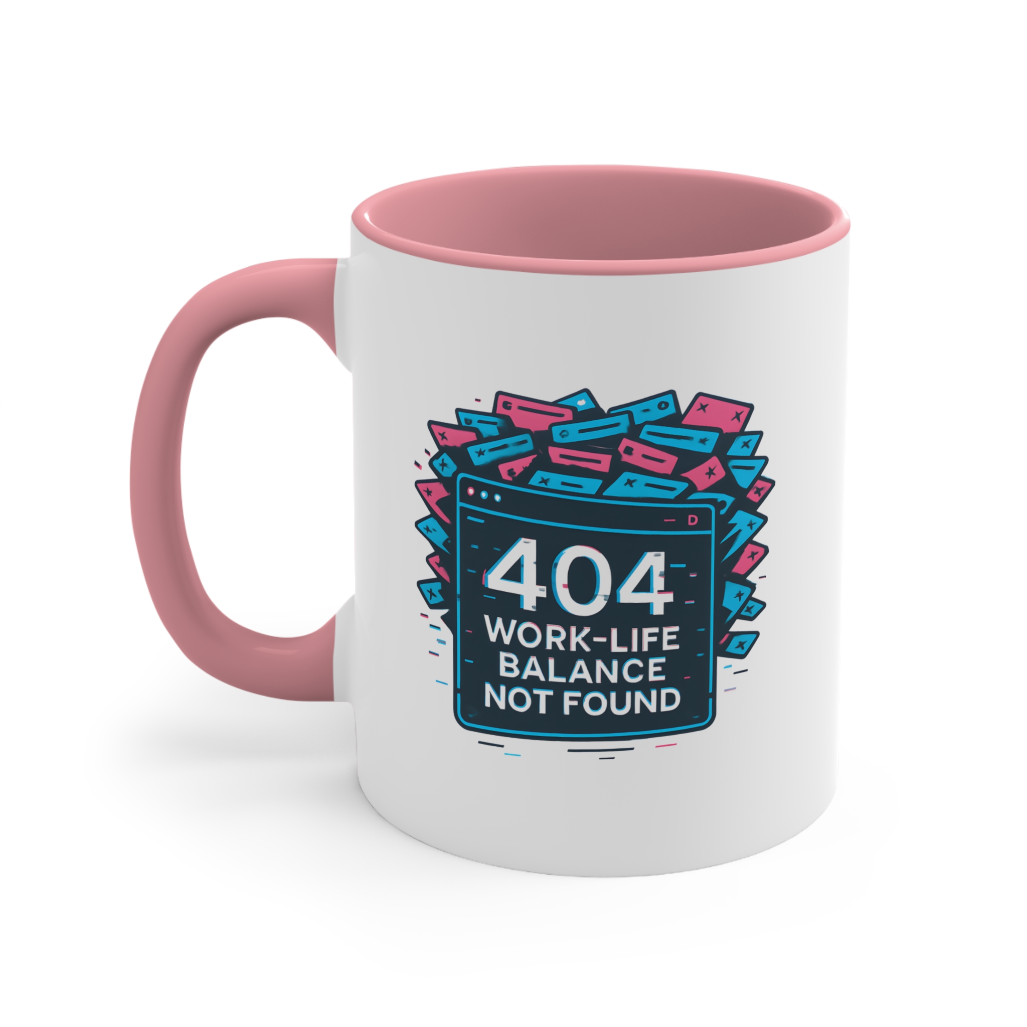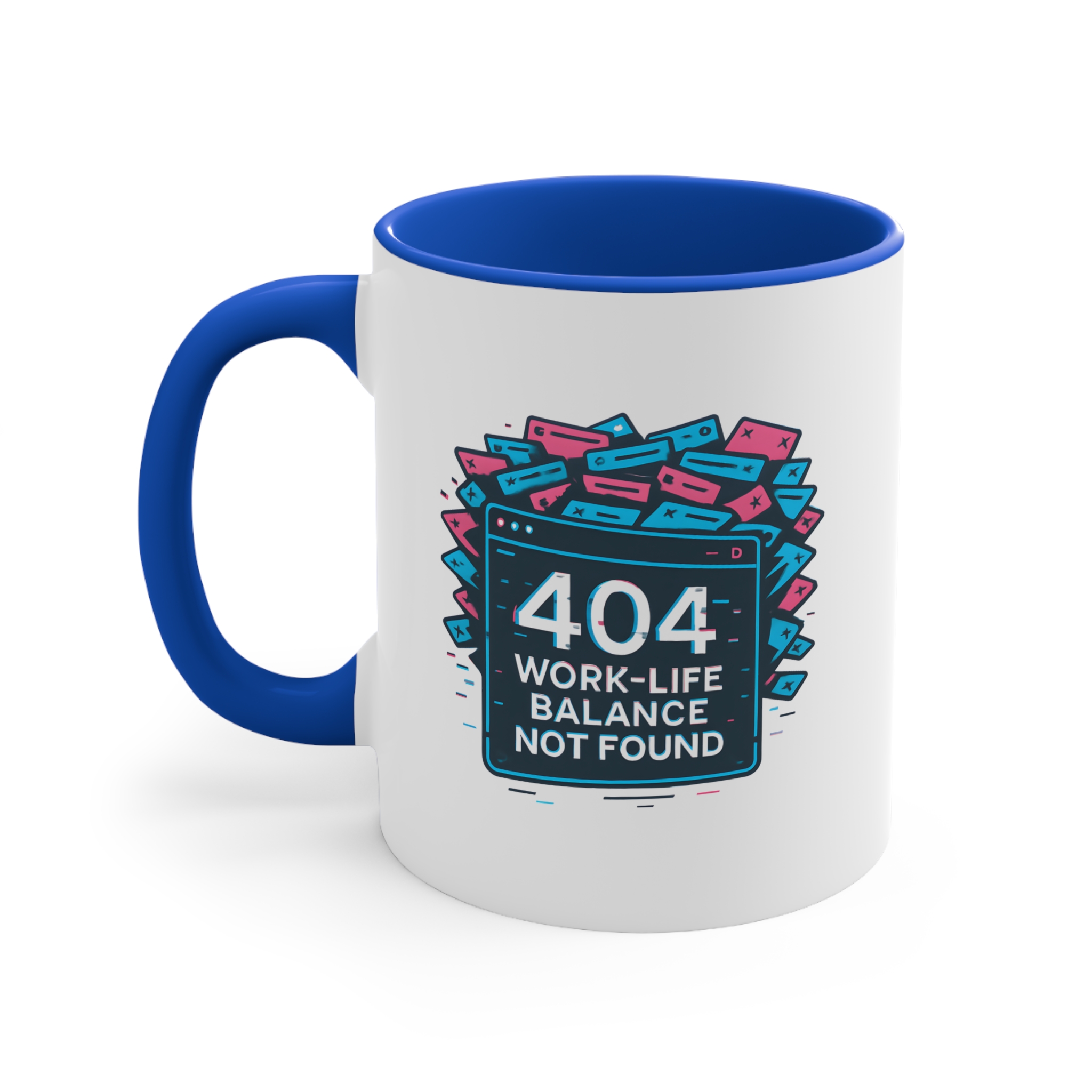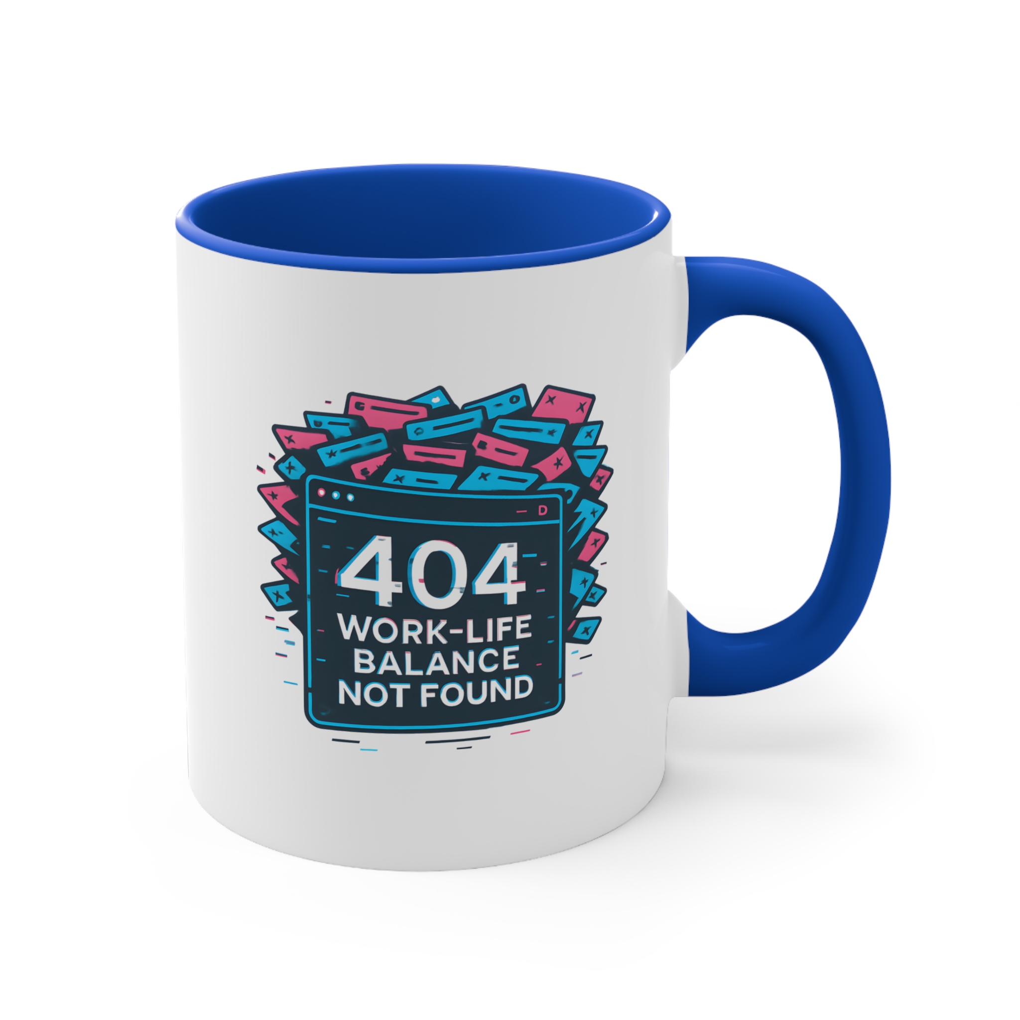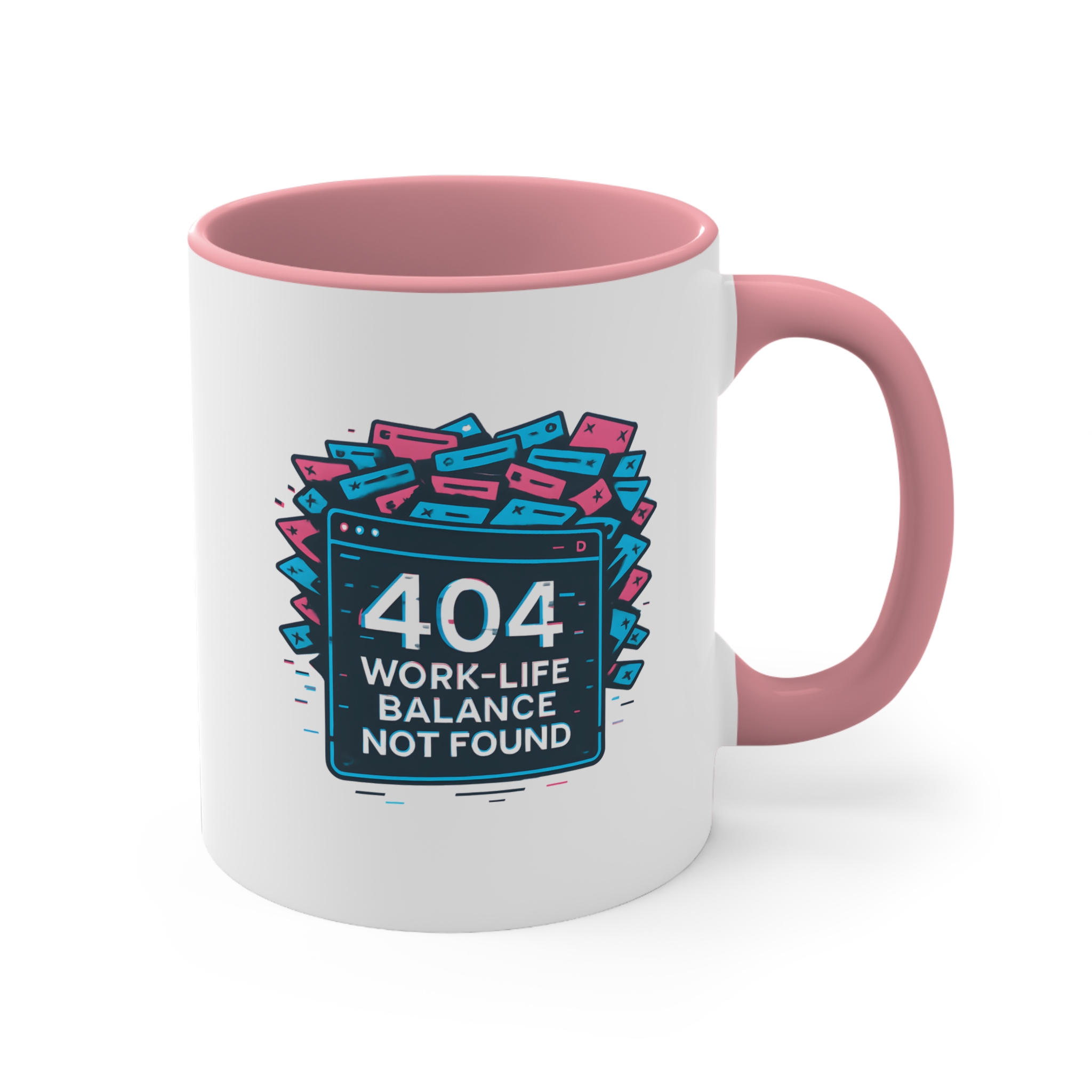 If your idea of balance is juggling spreadsheets, deadlines, and coffee breaks — this mug gets you. Featuring the classic “404 Work-Life Balance Not Found” error message surrounded by chaotic browser windows, this design is a hilarious nod to the burnout and busyness of modern work life.