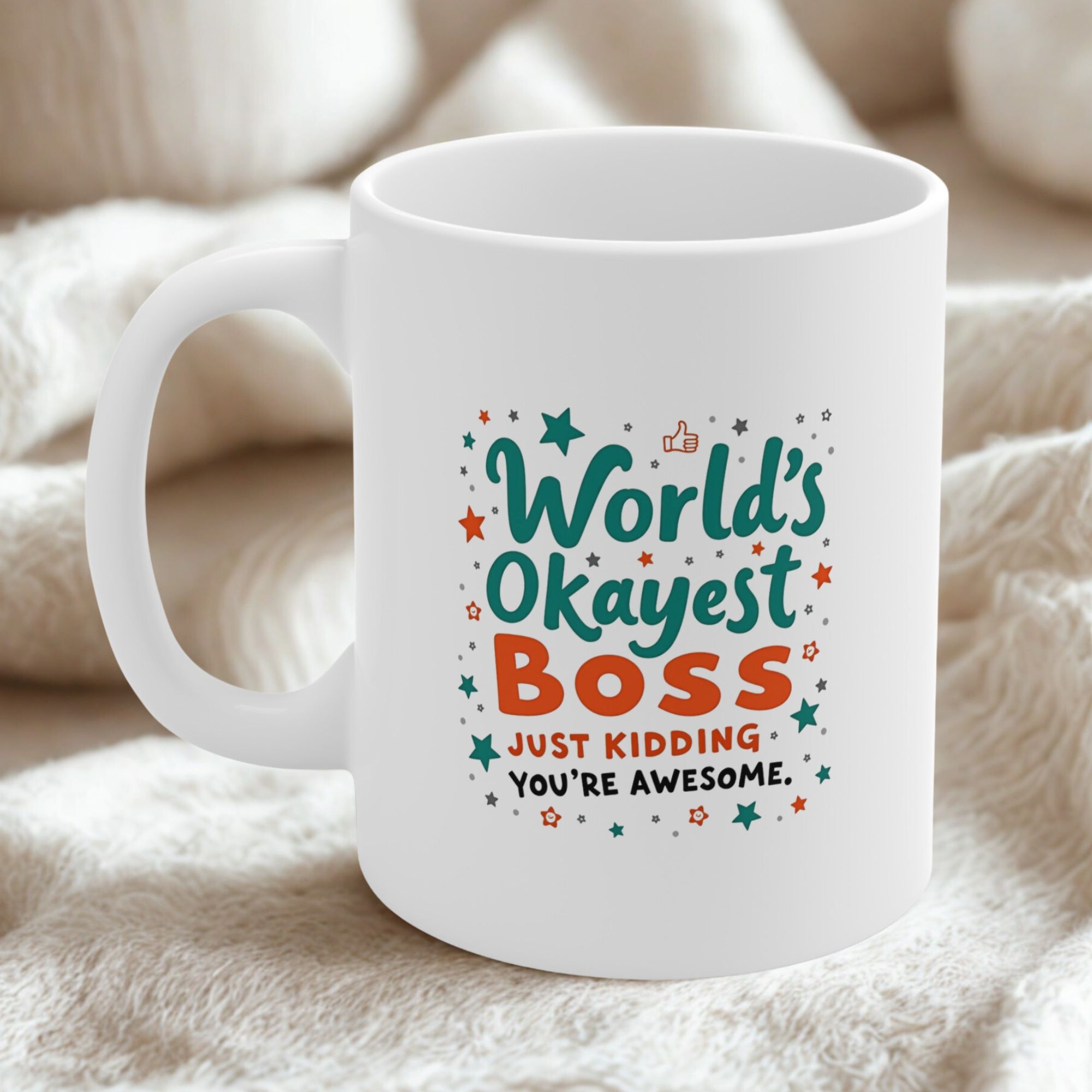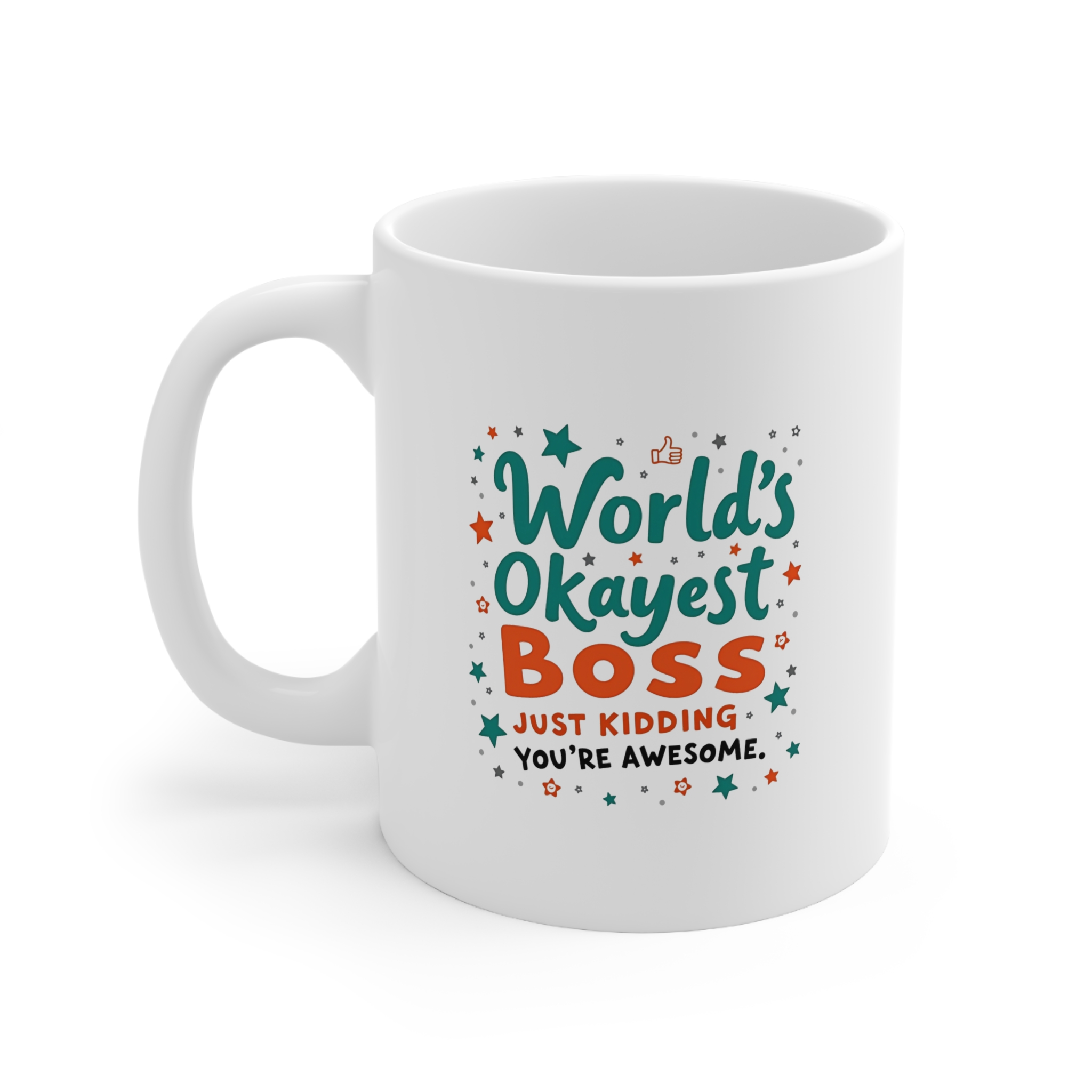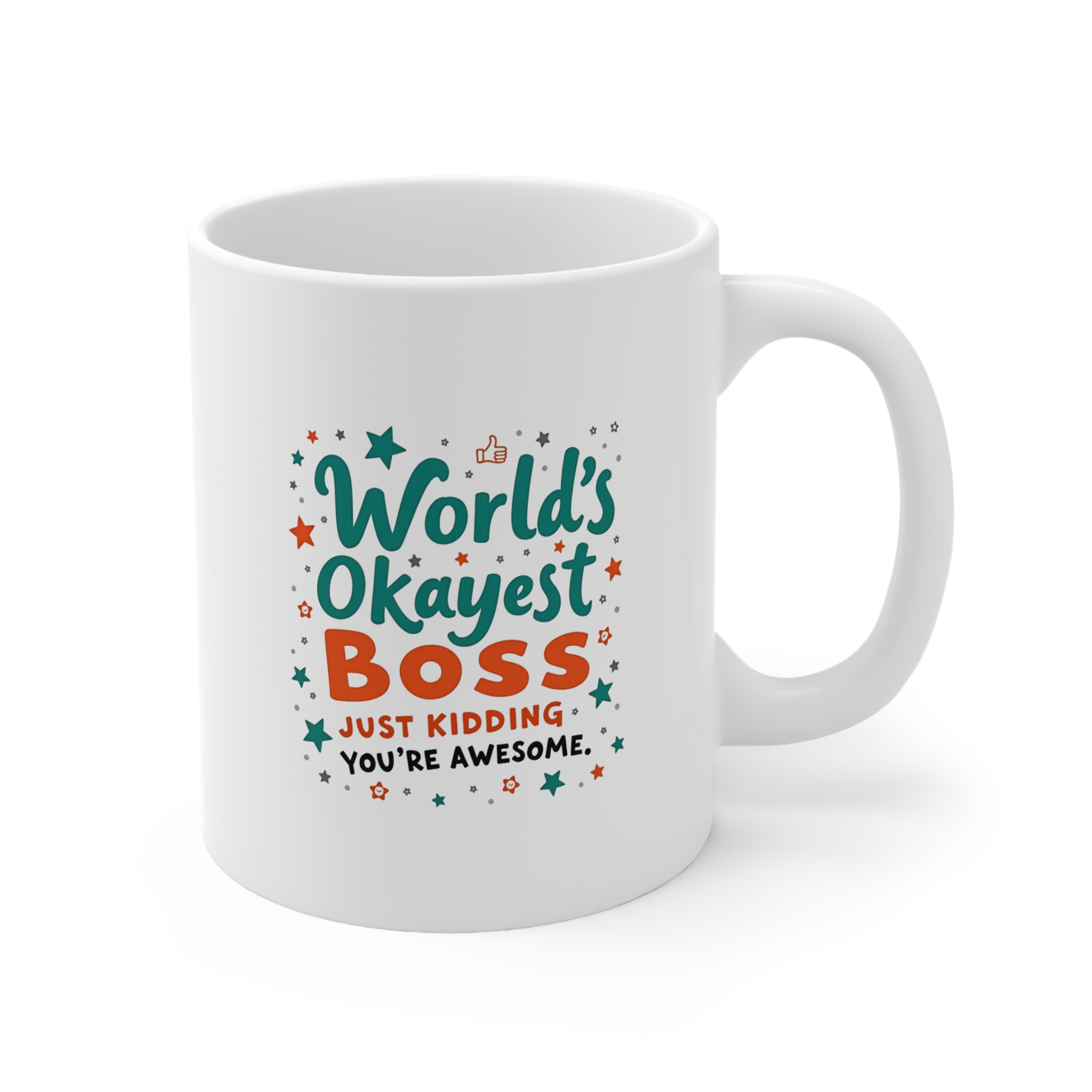 Show your boss some love with this playful yet heartwarming “World’s Okayest Boss (Just Kidding, You’re Awesome)” Mug. Perfect for the boss who keeps things light and fun, this mug combines a humorous twist with genuine appreciation. Whether it’s for their birthday, promotion, or just because, this mug is sure to bring a smile to their face. Sip coffee, tea, or whatever gets them through the day, all while knowing they are truly awesome.