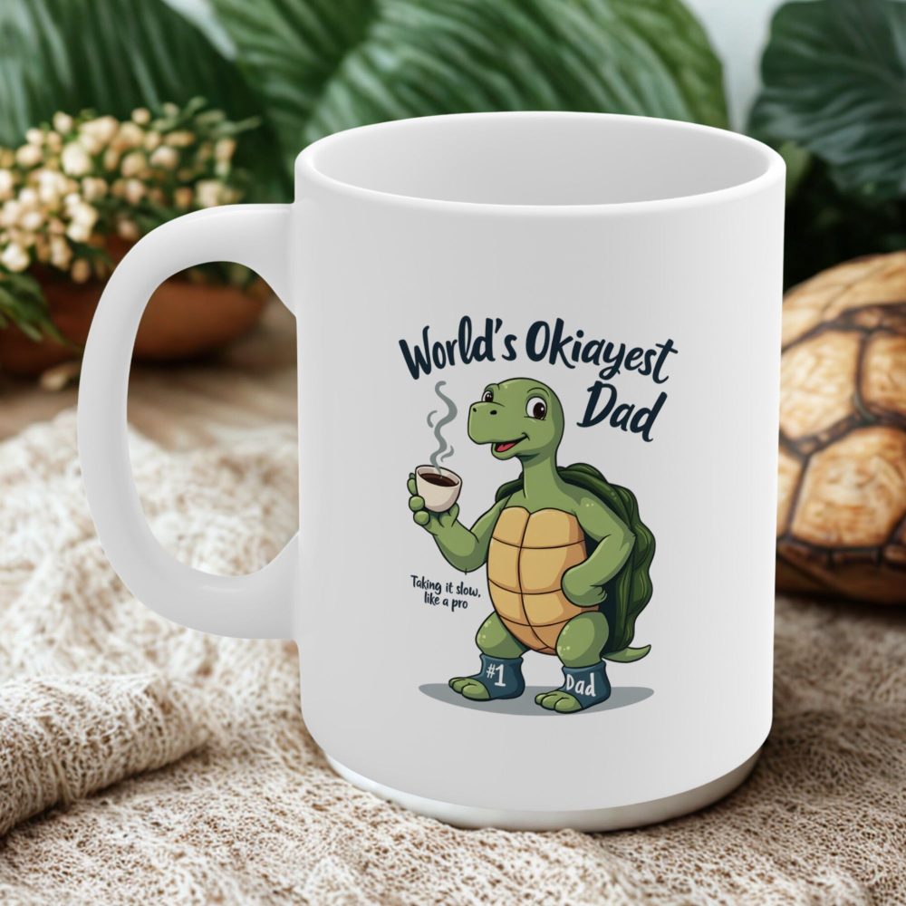 World’s Okayest Dad Mug (a.k.a. “Okiayest Dad”) with funny turtle design — a slow, proud, typo-powered win for any dad.