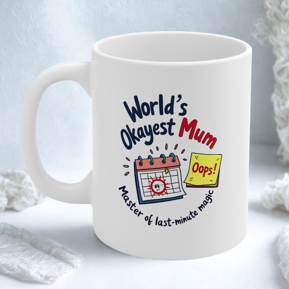 World’s Okayest Mum Mug with hilarious calendar & “Oops!” note — a bold, bright tribute to last-minute mum magic.