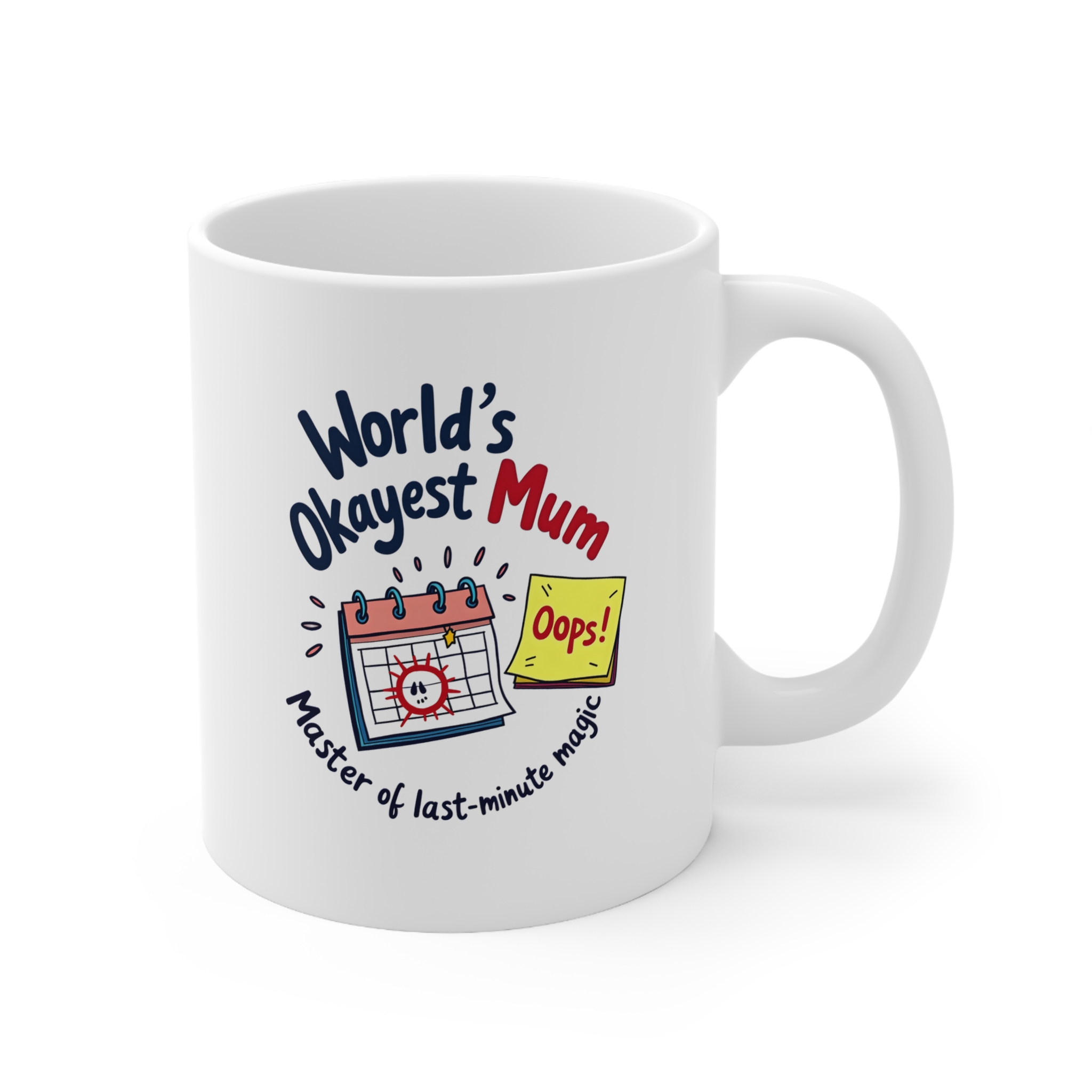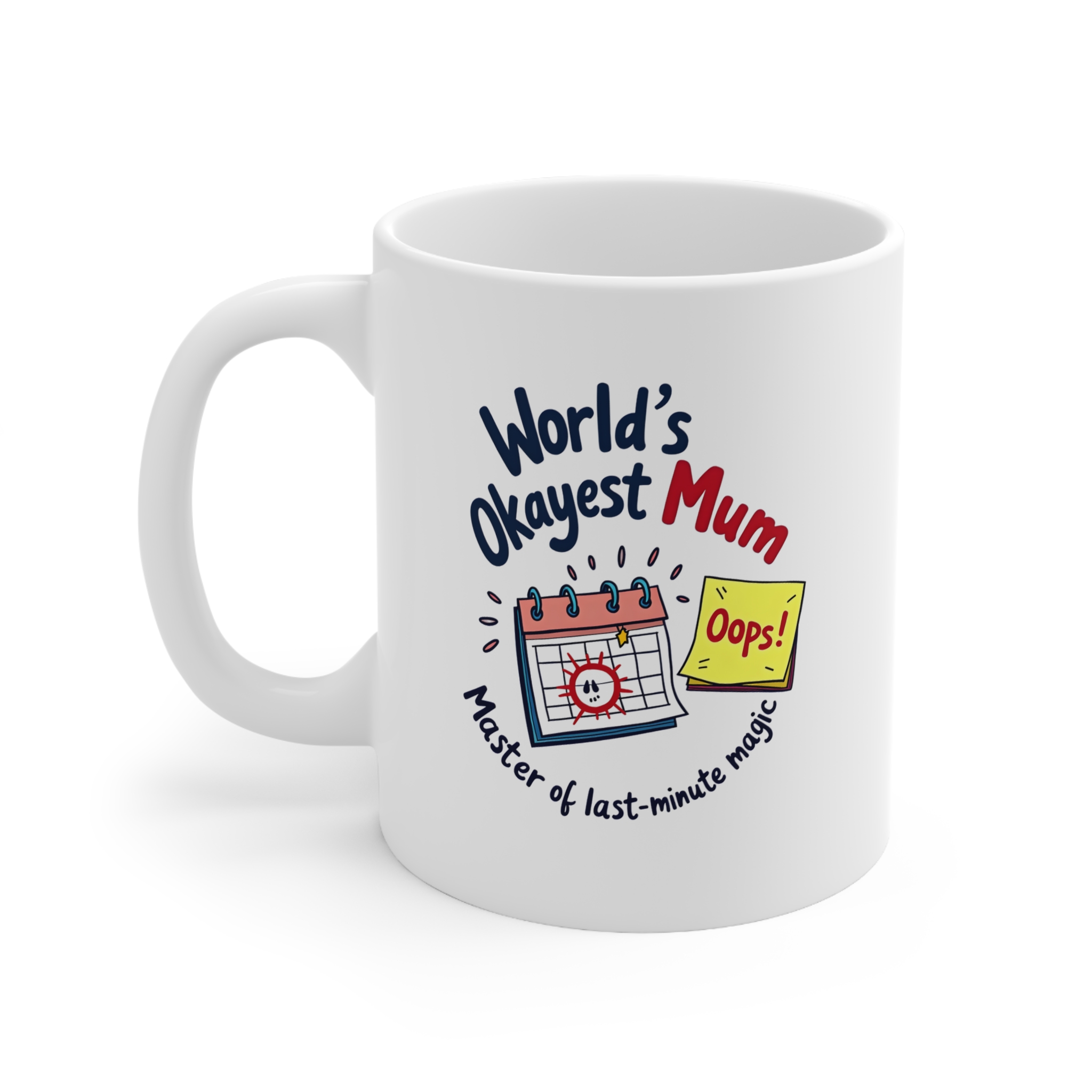 World’s Okayest Mum Mug with hilarious calendar & “Oops!” note — a bold, bright tribute to last-minute mum magic.