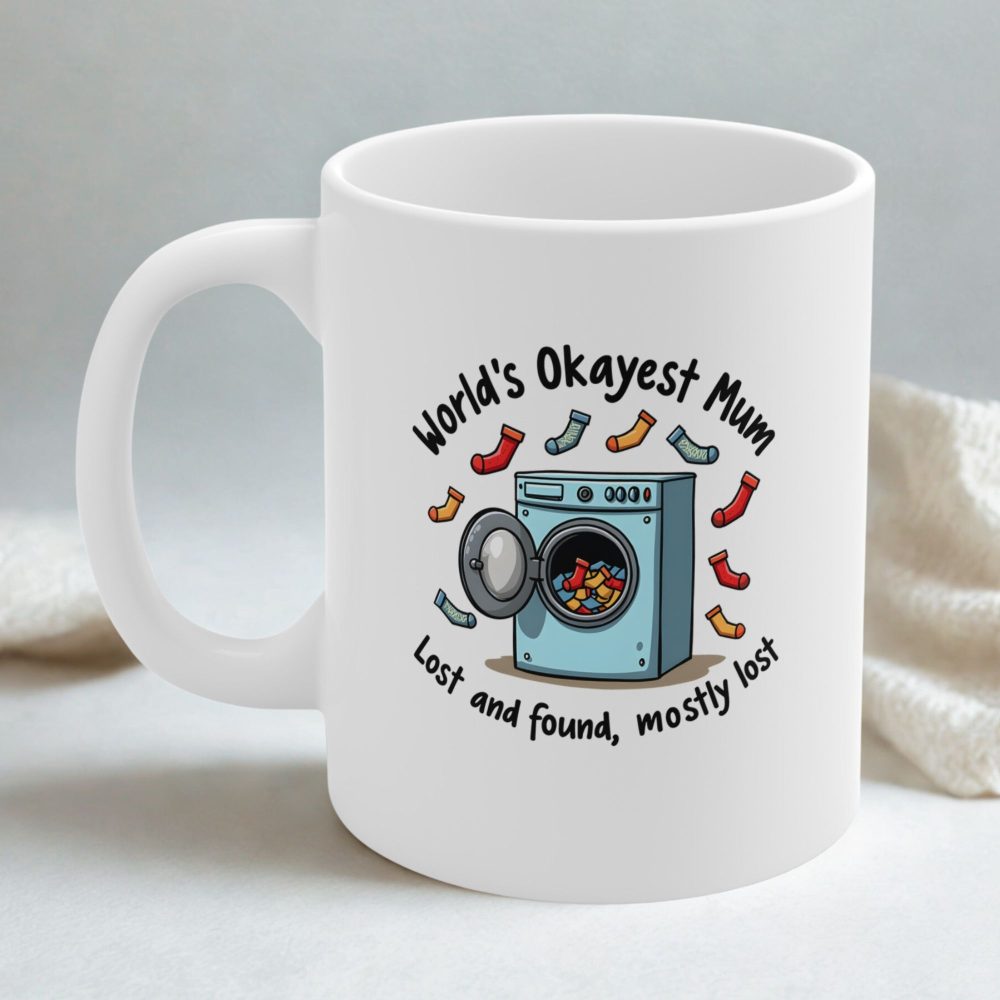 This World’s Okayest Mum Mug transforms laundry frustration into pure mug-worthy comedy — because some socks are just never coming back.