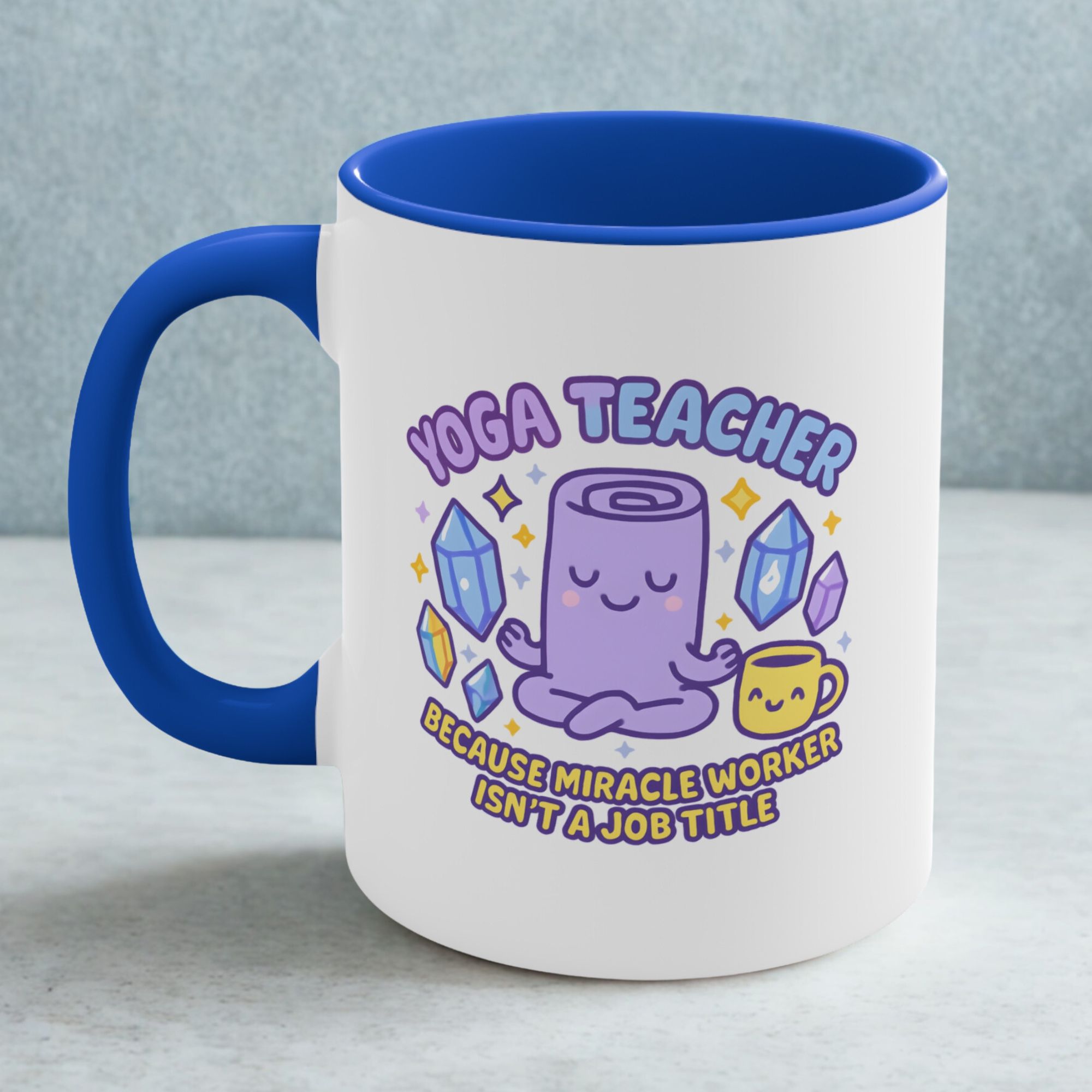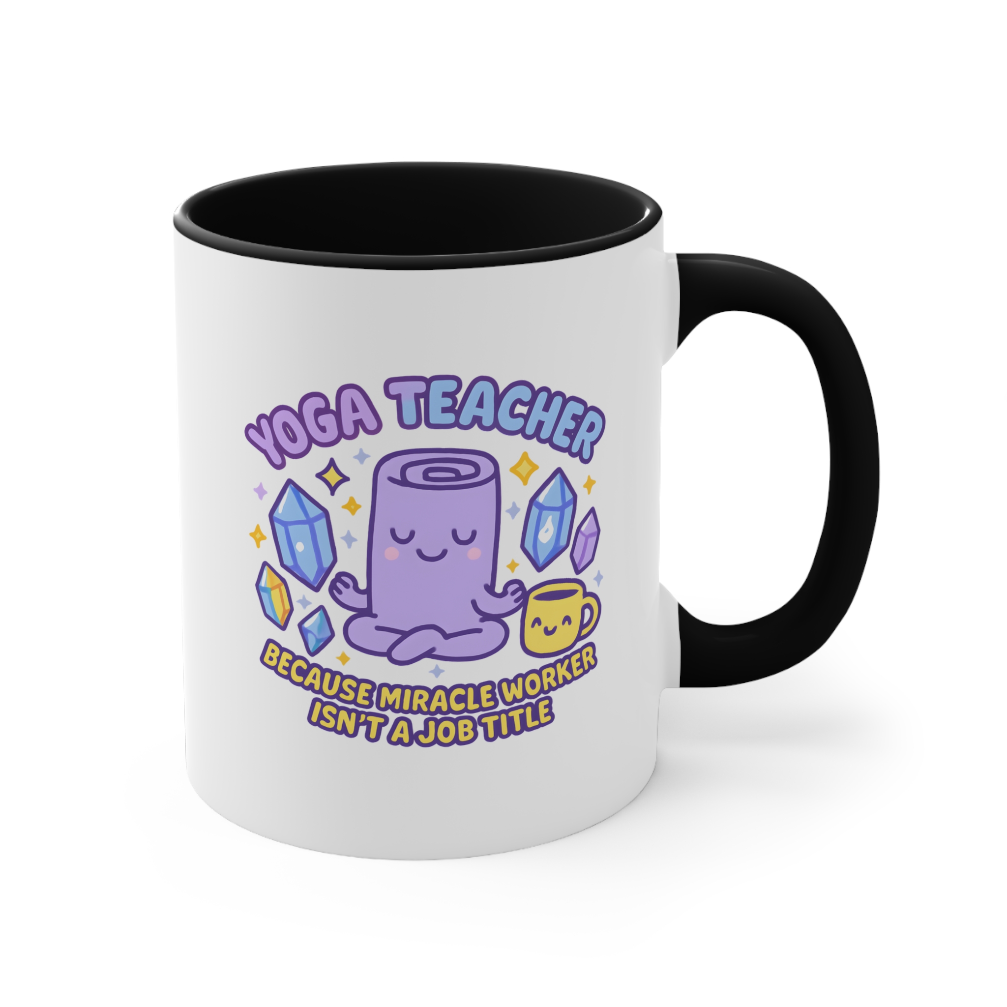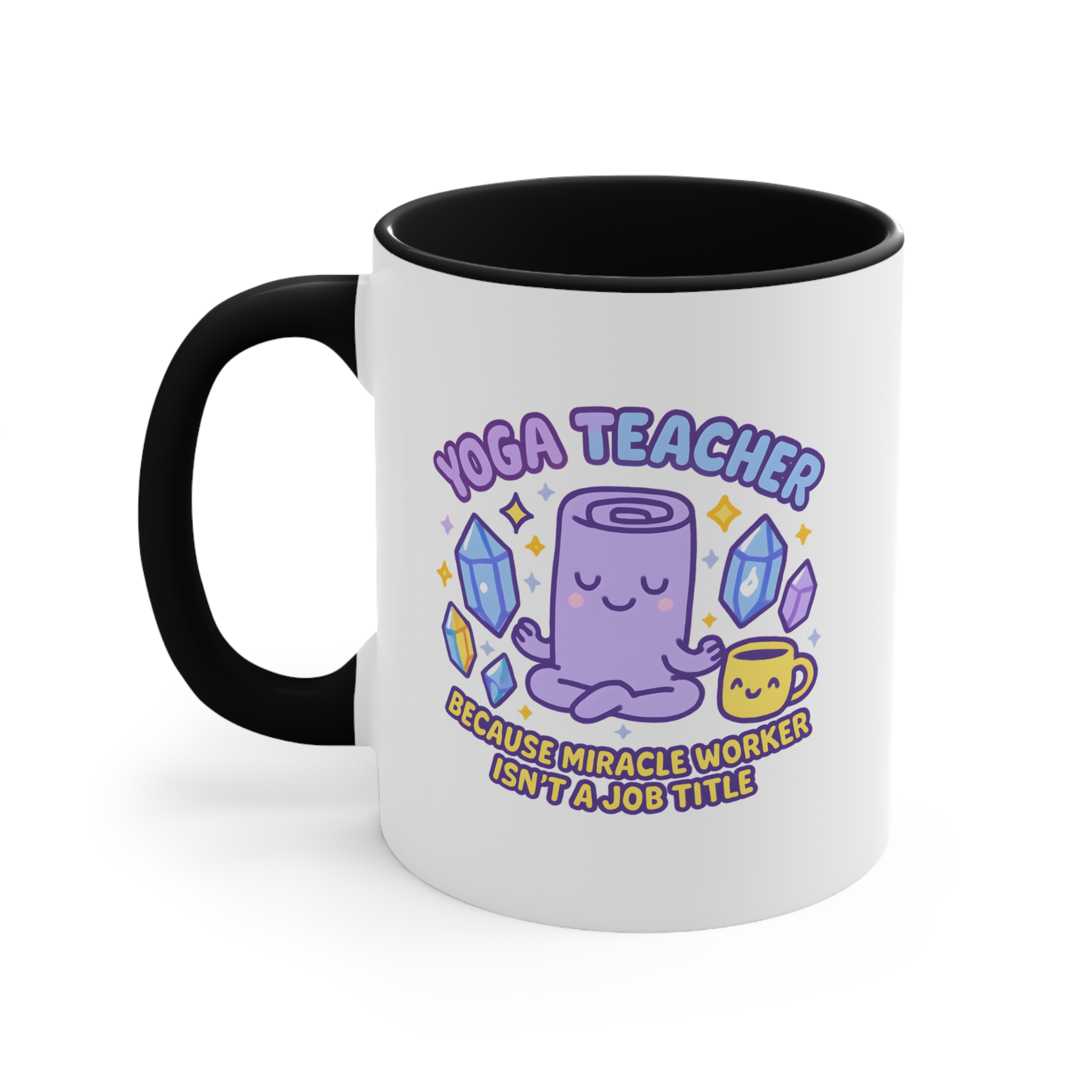 Add some playful positivity to your yoga teacher’s daily cuppa with this yoga teacher gift mug! Featuring a cheerful cartoon yoga mat in lotus pose, sparkling crystals, and a smiling mug, this design says it all: “Because Miracle Worker Isn’t a Job Title.”
