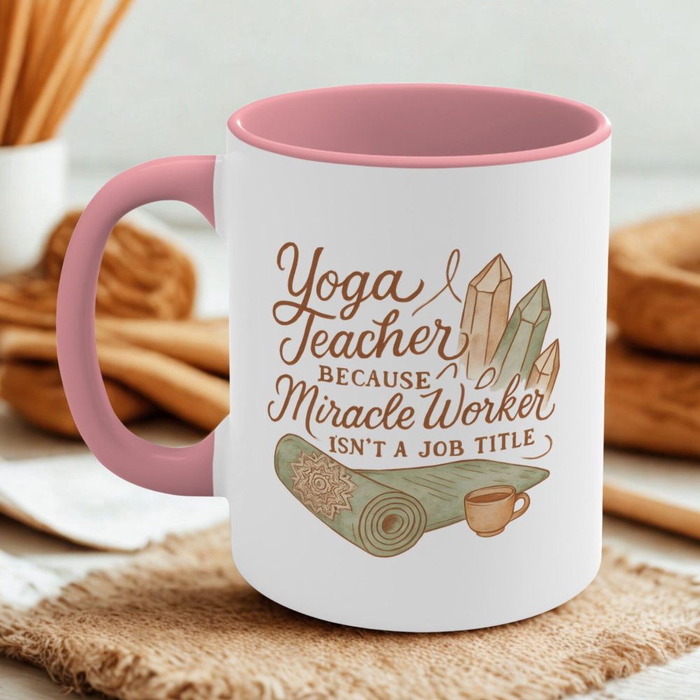 Celebrate your yoga teacher with this pink-handled ceramic mug featuring the quote “Because Miracle Worker Isn’t a Job Title” — a sweet gift of gratitude and peace.