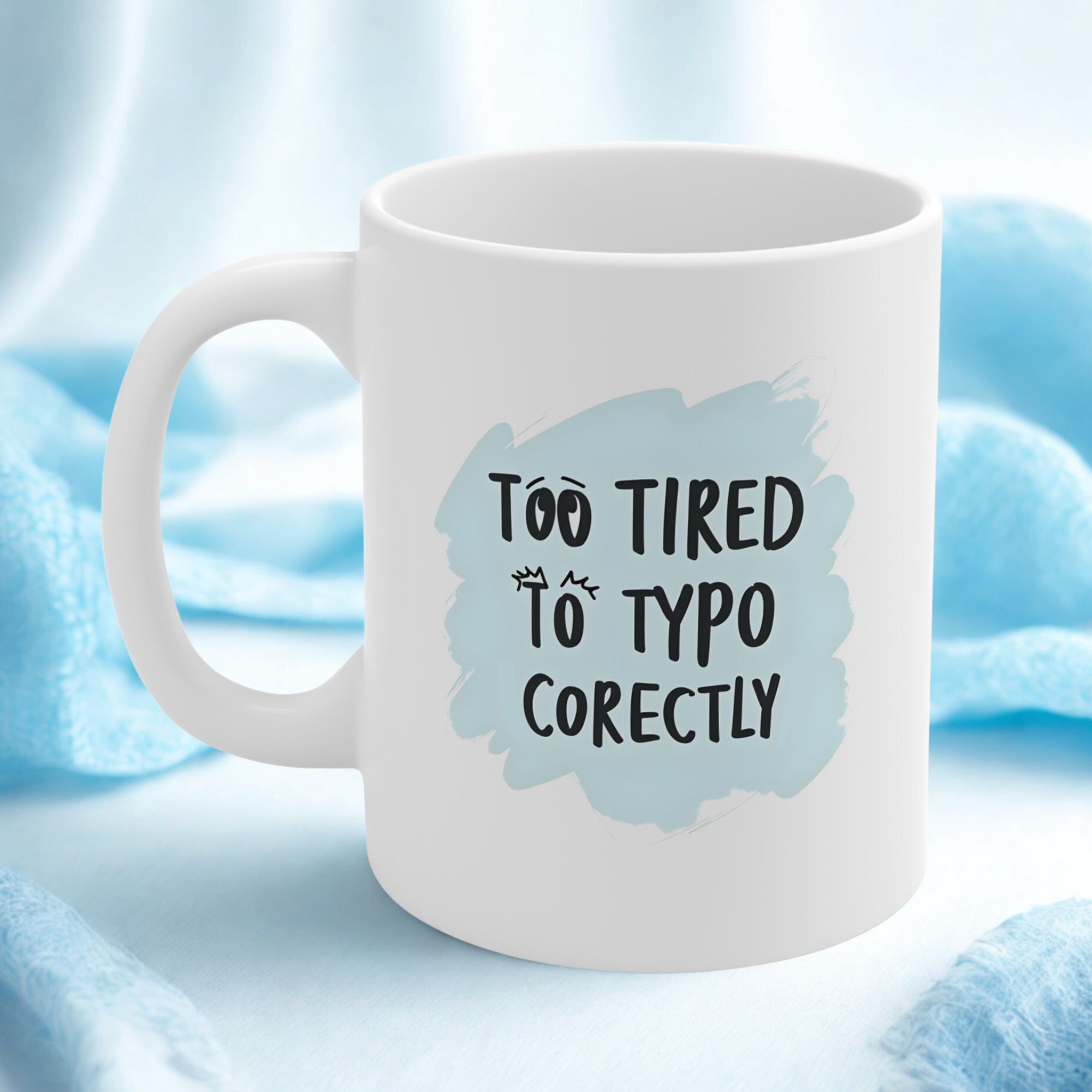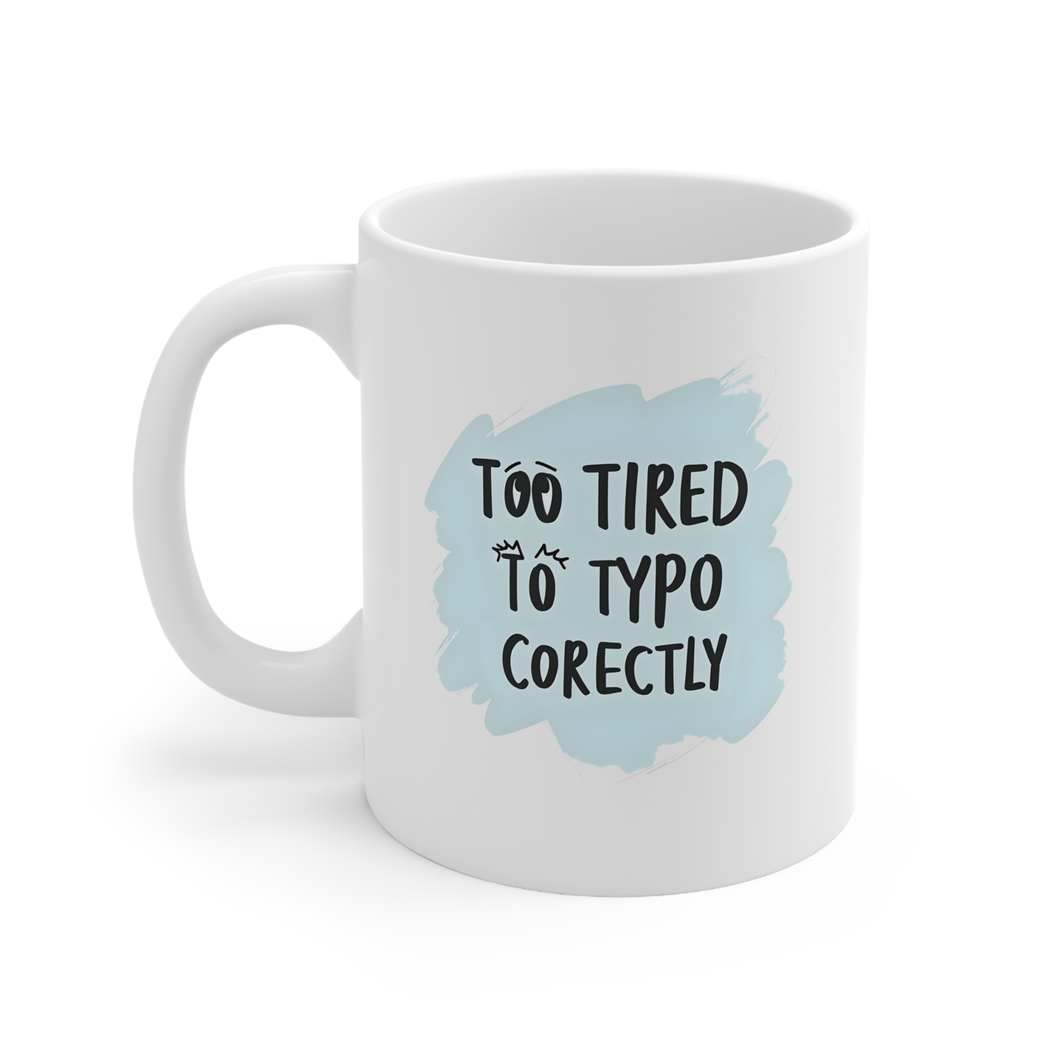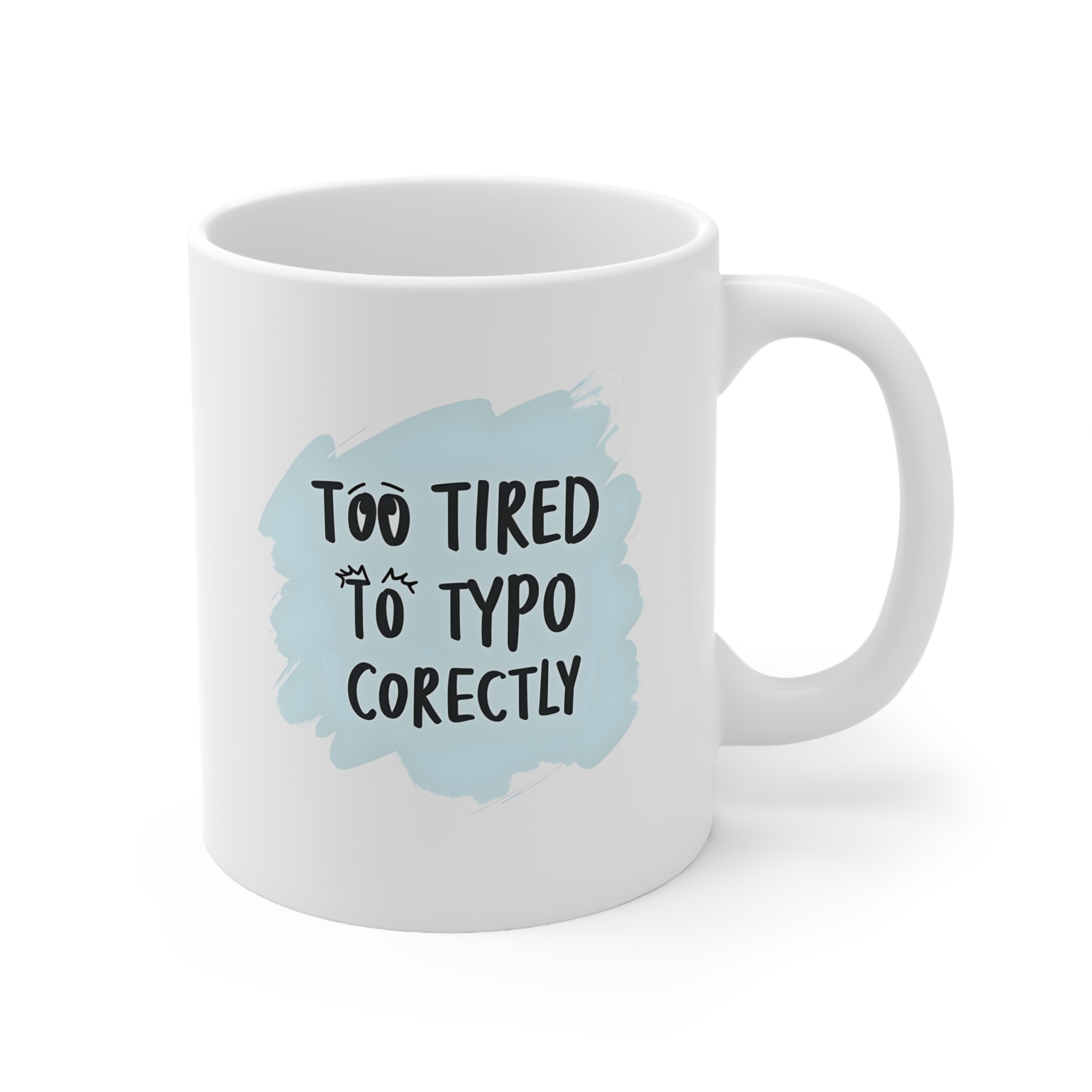 Funny typo coffee mug that reads “Too Tired to Typo Corectly.” A quirky gift for writers, students, and caffeine-powered humans.